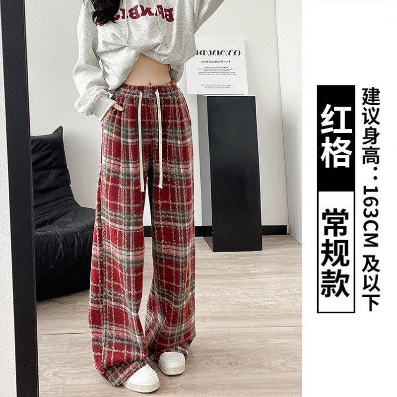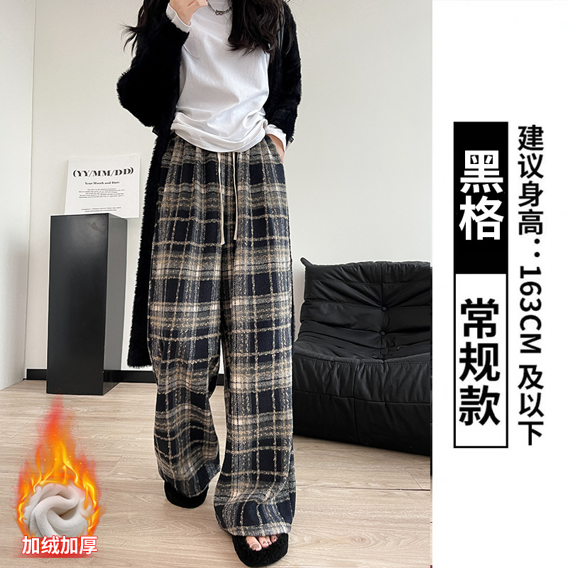 加厚毛呢格子裤秋冬加绒裤子外穿女宽松垂感复古休闲裤高腰阔腿裤