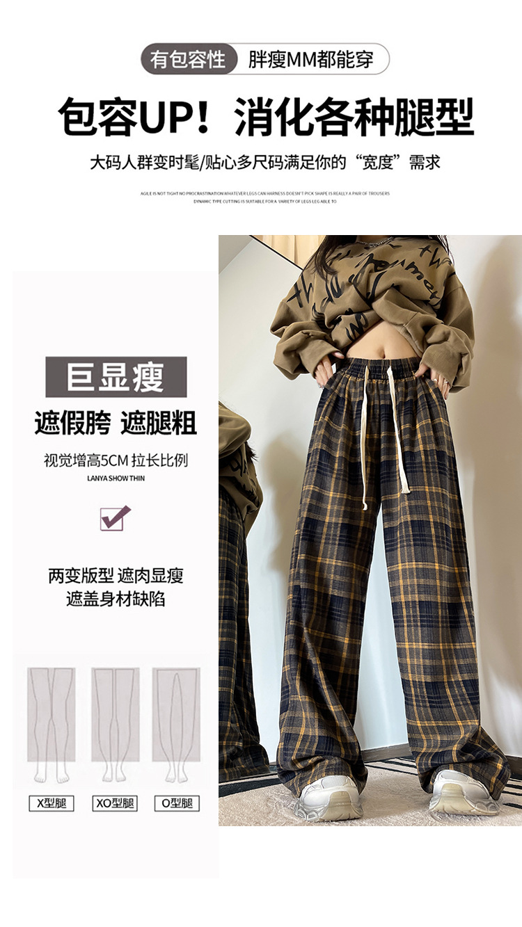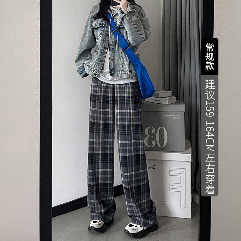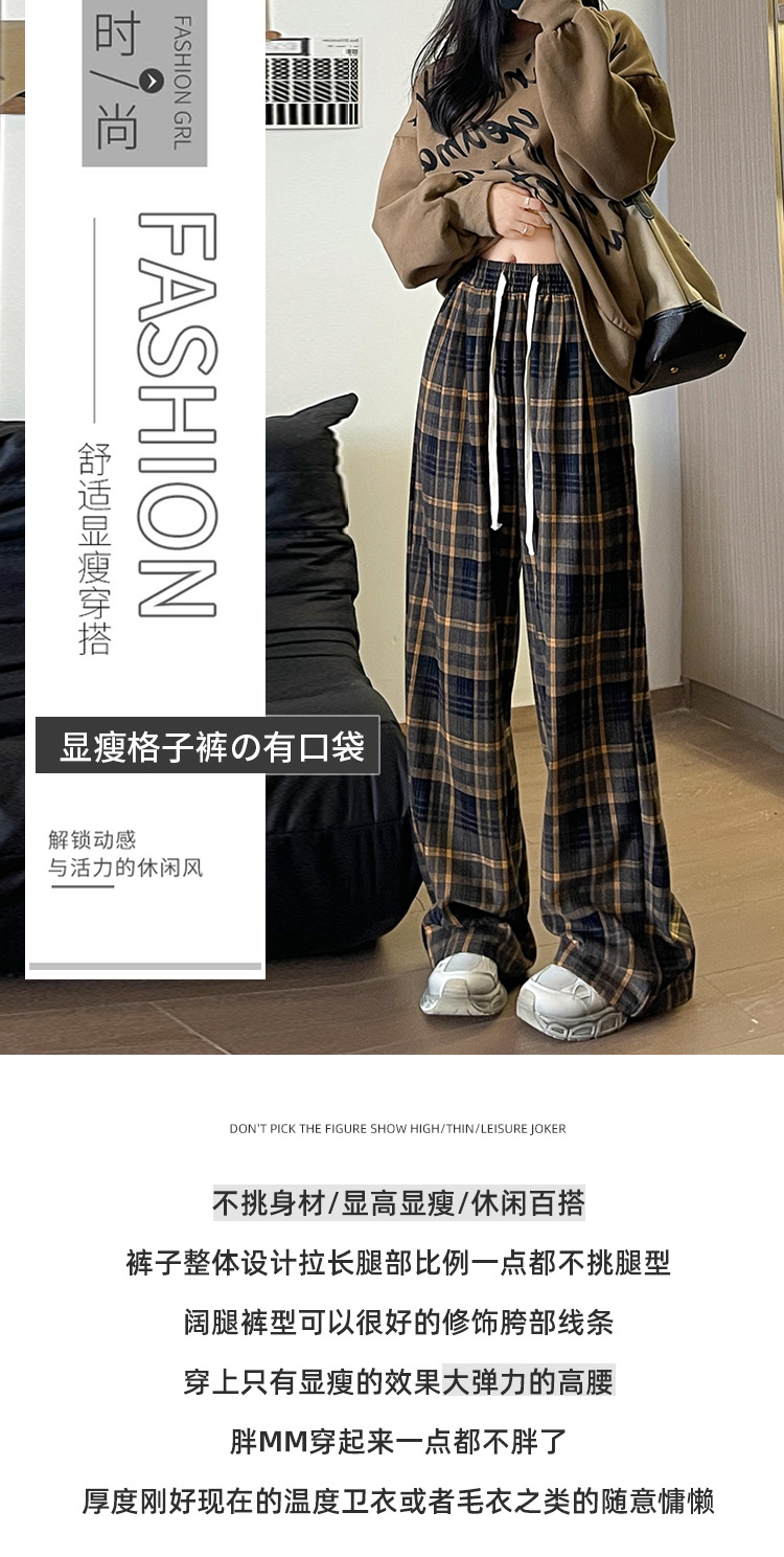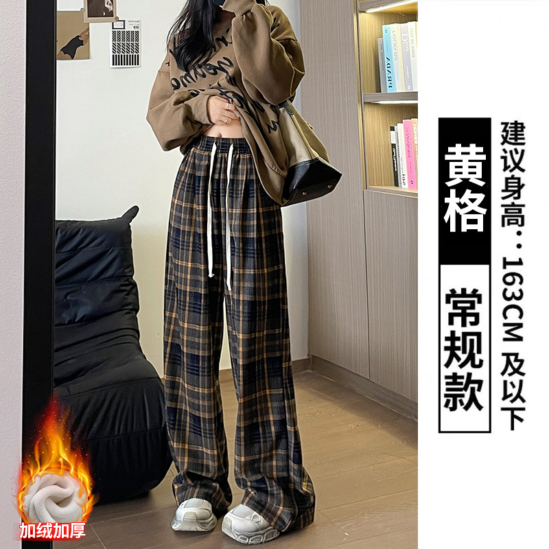 美式加绒格子裤女裤子秋冬新款磨毛复古休闲裤宽松直筒窄版阔腿裤