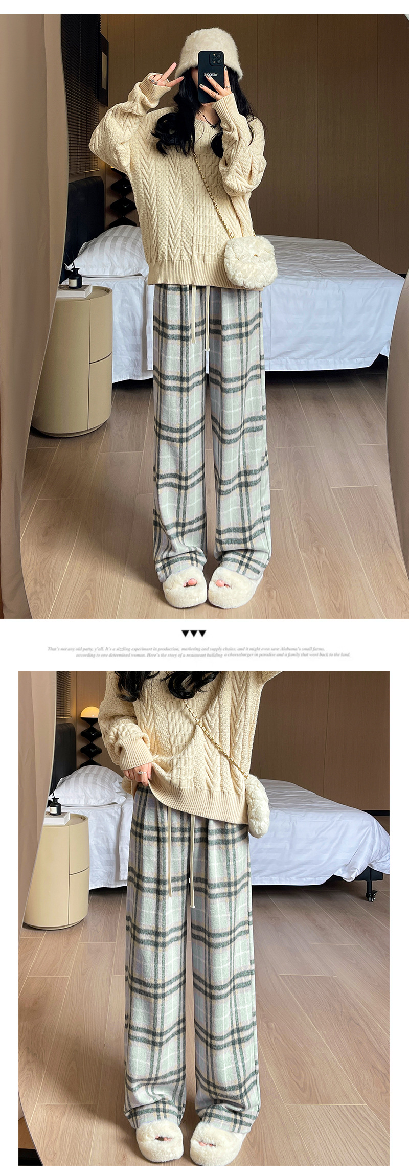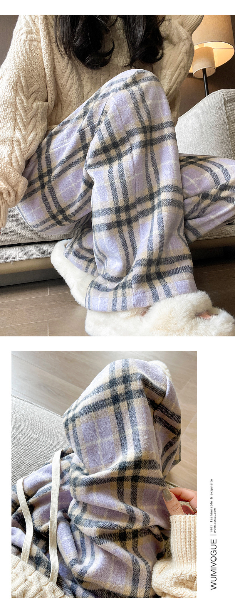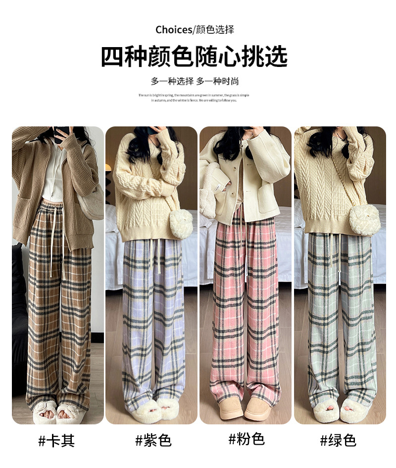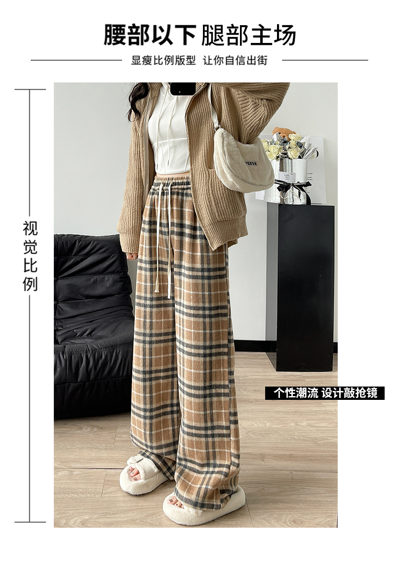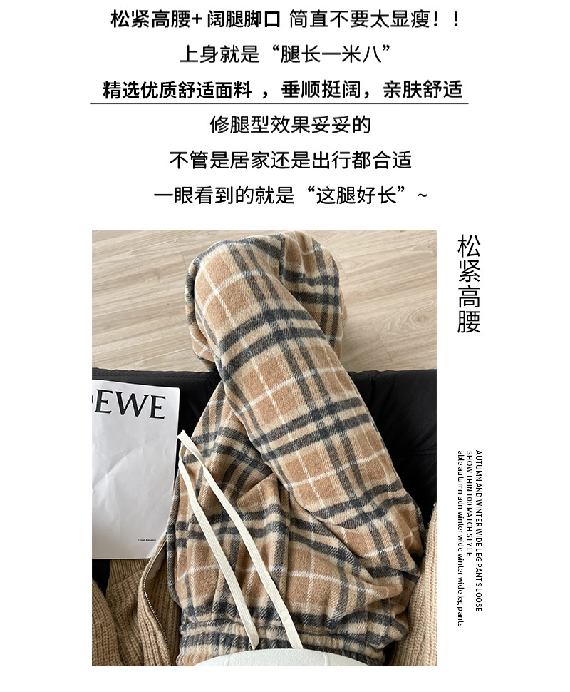 毛呢阔腿裤女秋冬新款宽松显瘦休闲直筒裤拖地高腰复古格子裤女裤