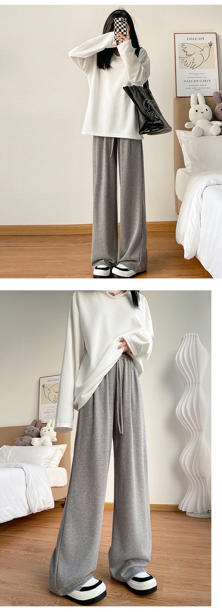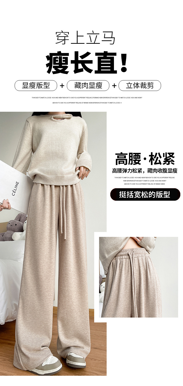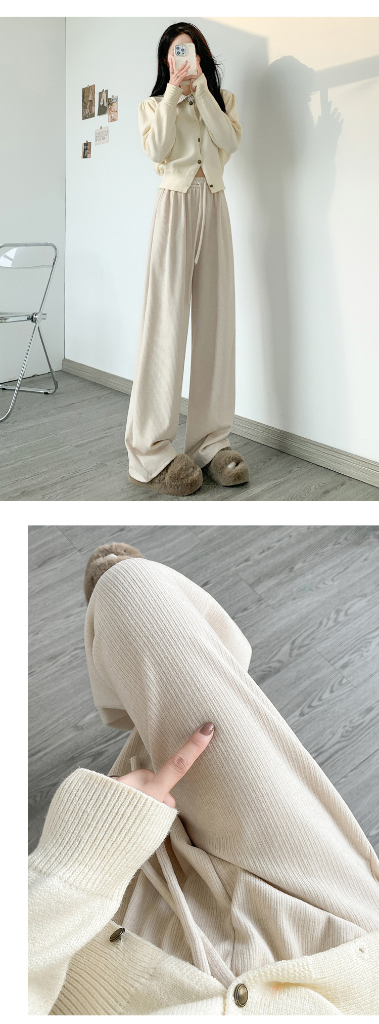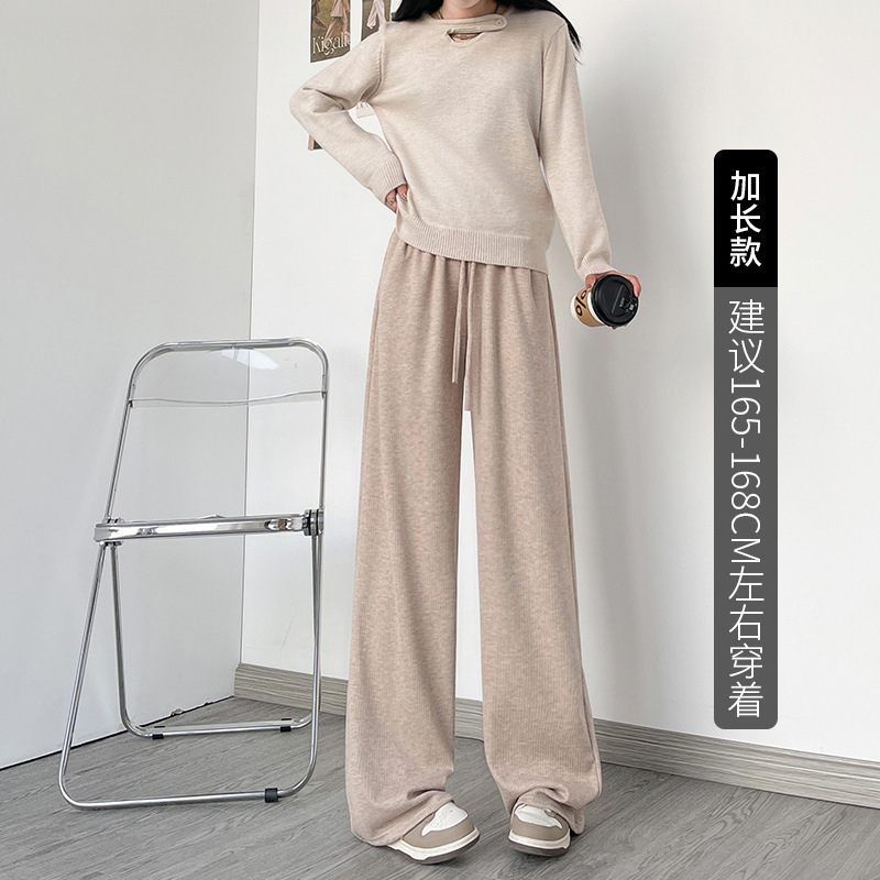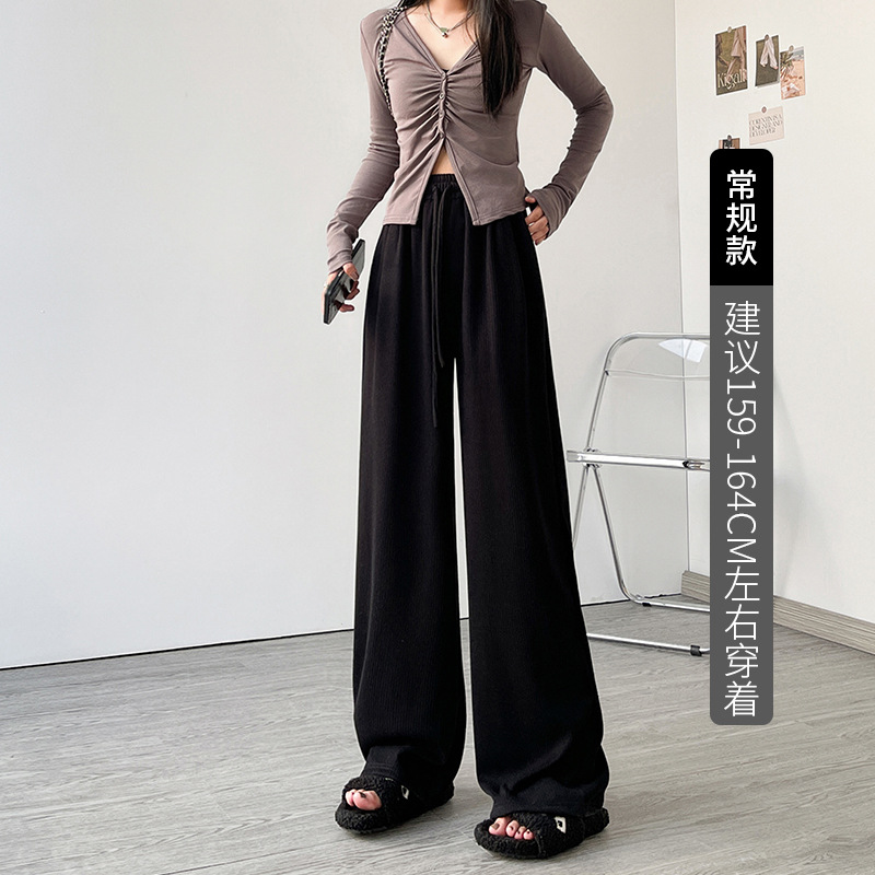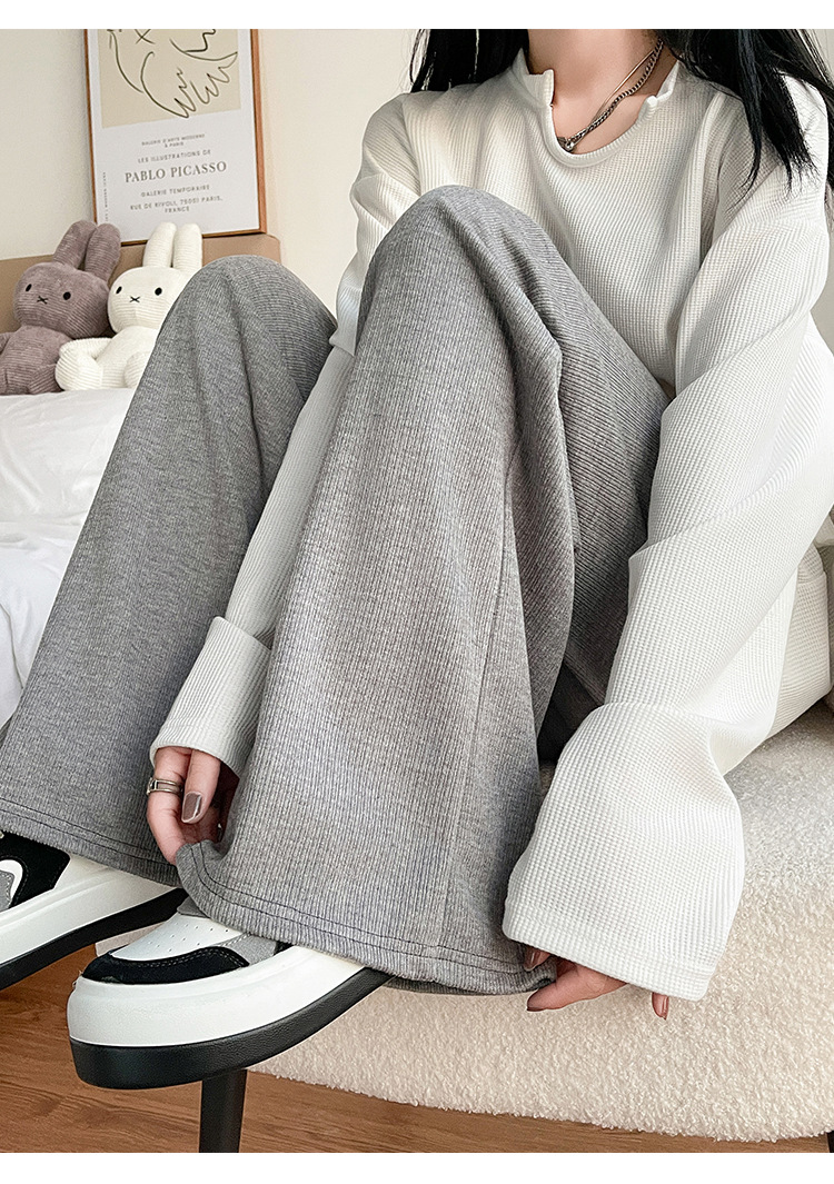 字母条兔毛绒阔腿裤女裤春秋高腰垂感直筒裤显瘦女装拖地休闲裤子