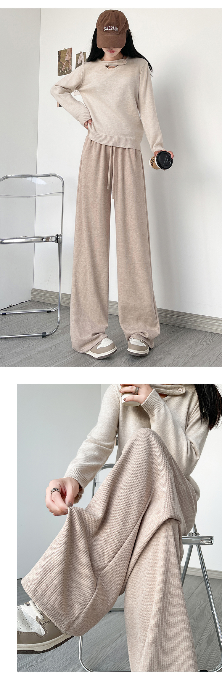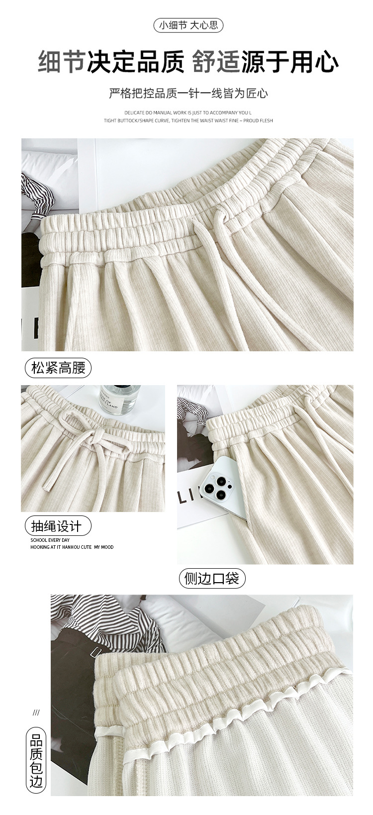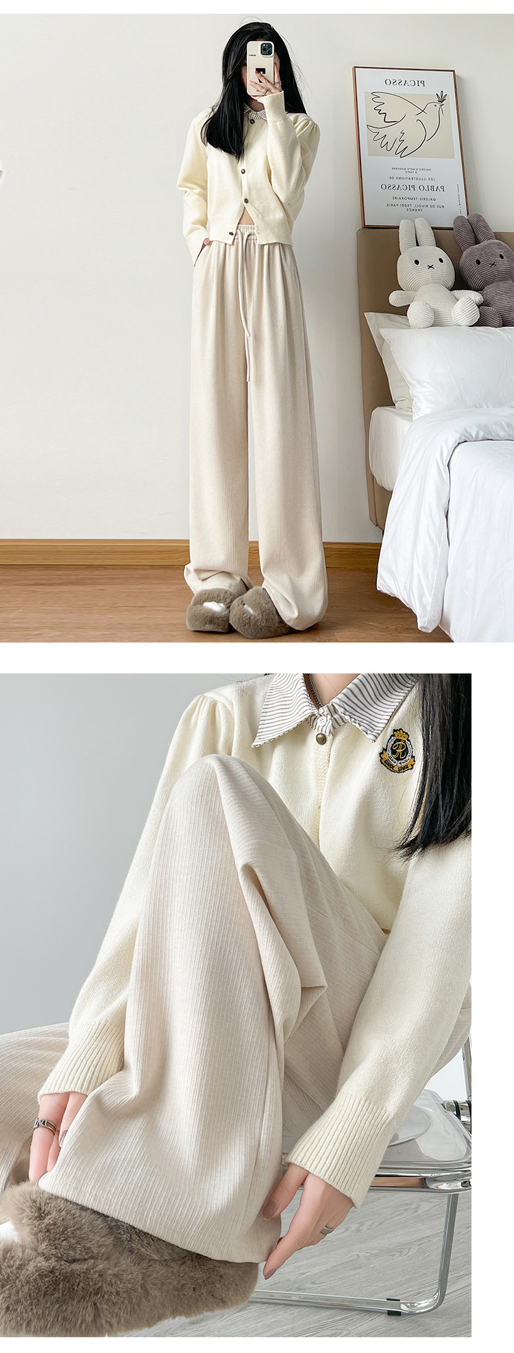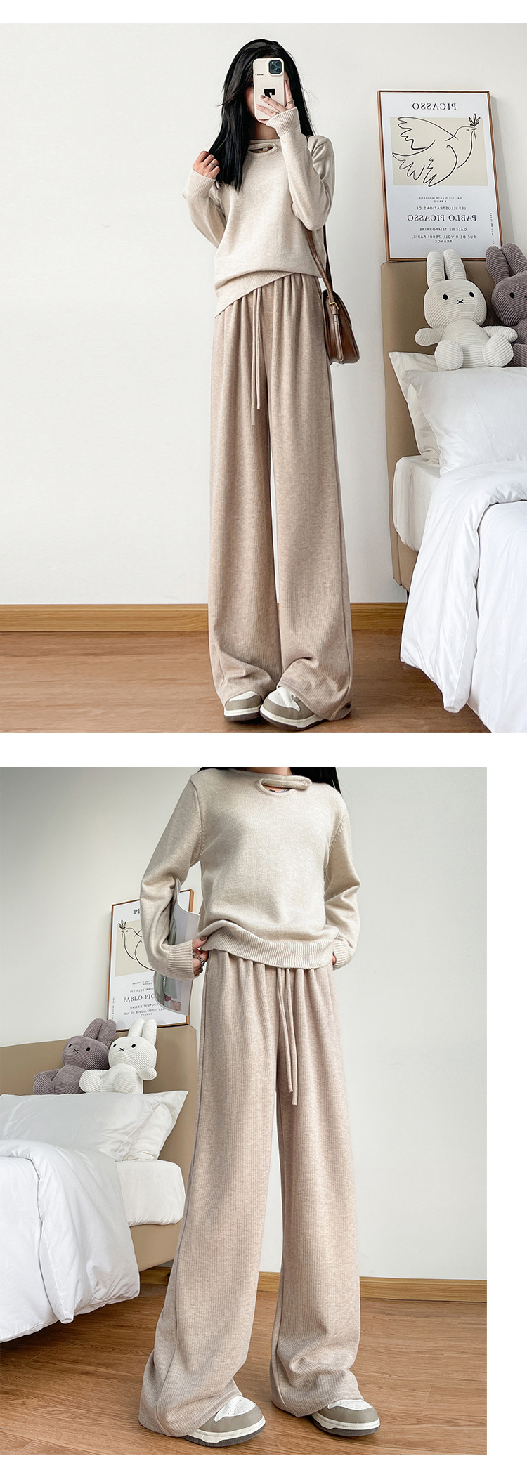 字母条兔毛绒阔腿裤女裤春秋高腰垂感直筒裤显瘦女装拖地休闲裤子