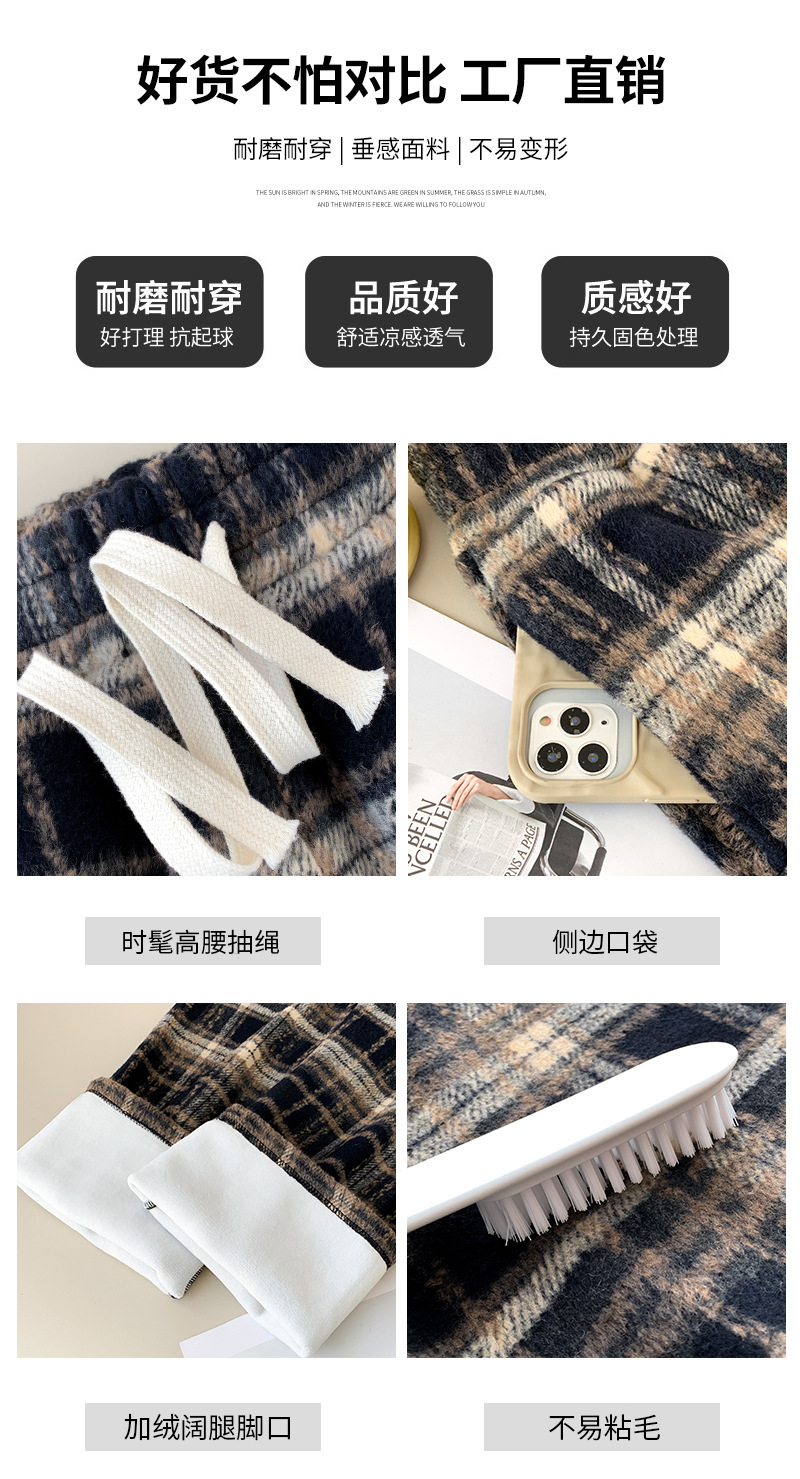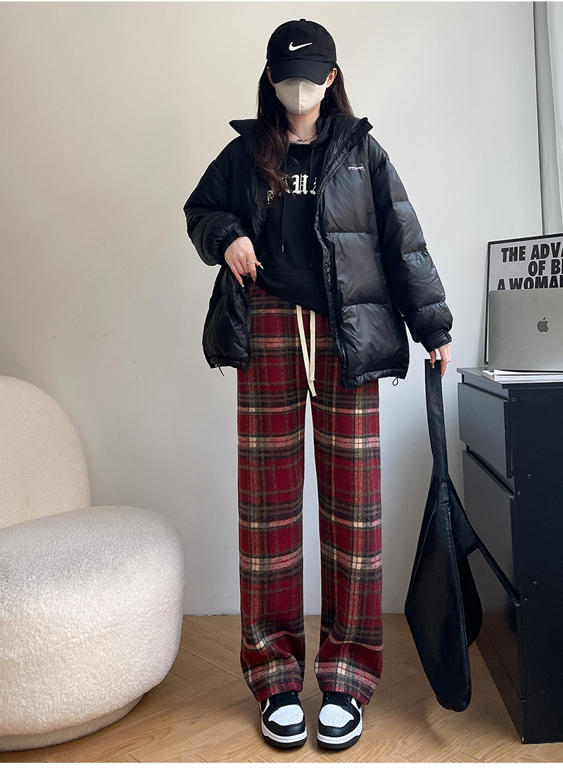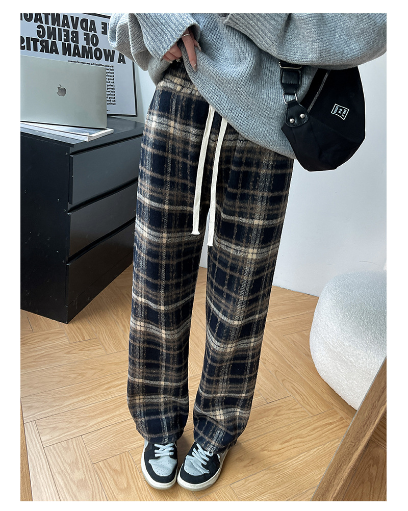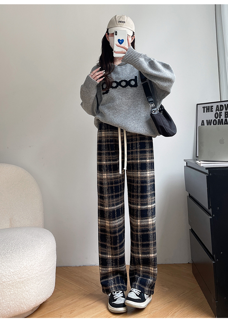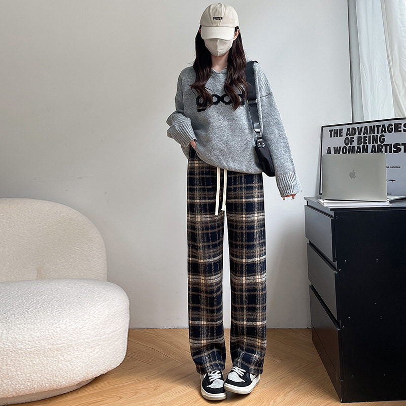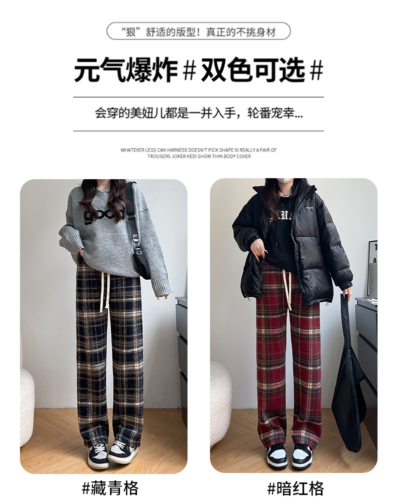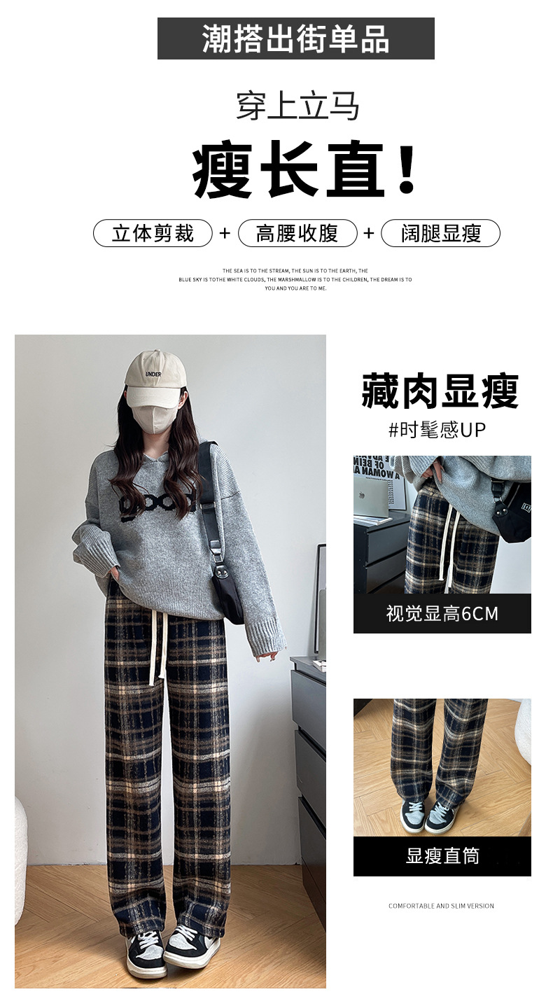 毛呢格子阔腿裤女裤子春秋新款女装复古休闲裤显瘦窄版直筒裤女裤