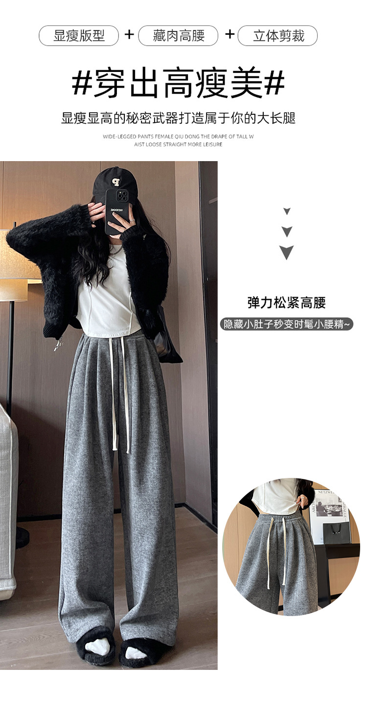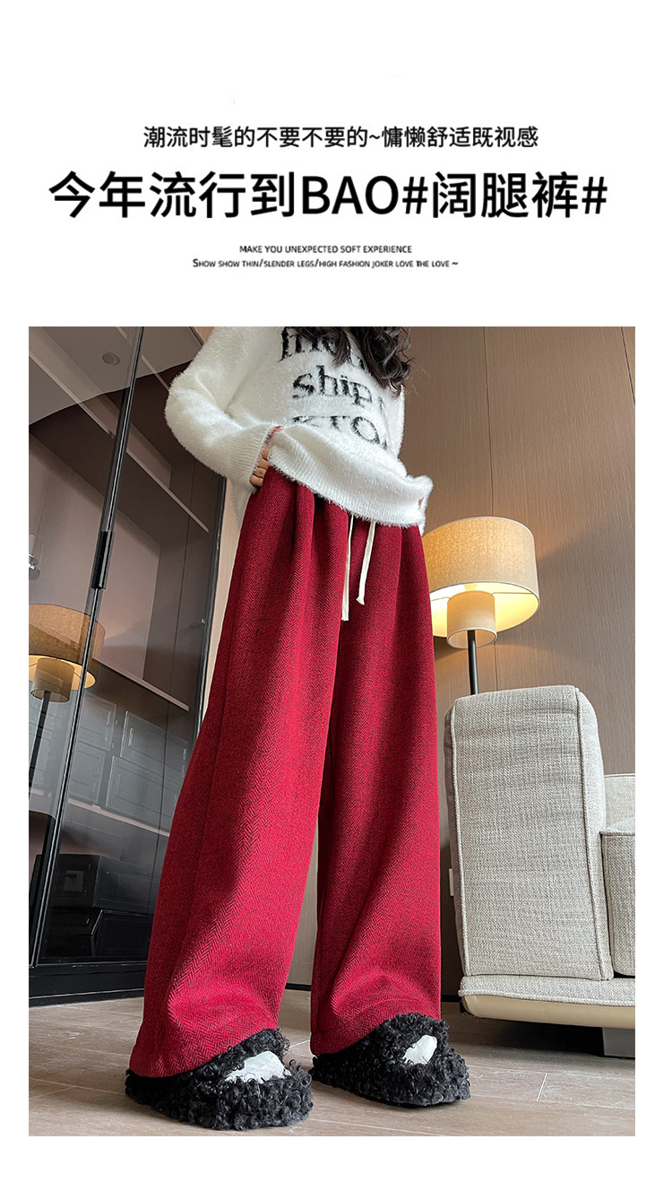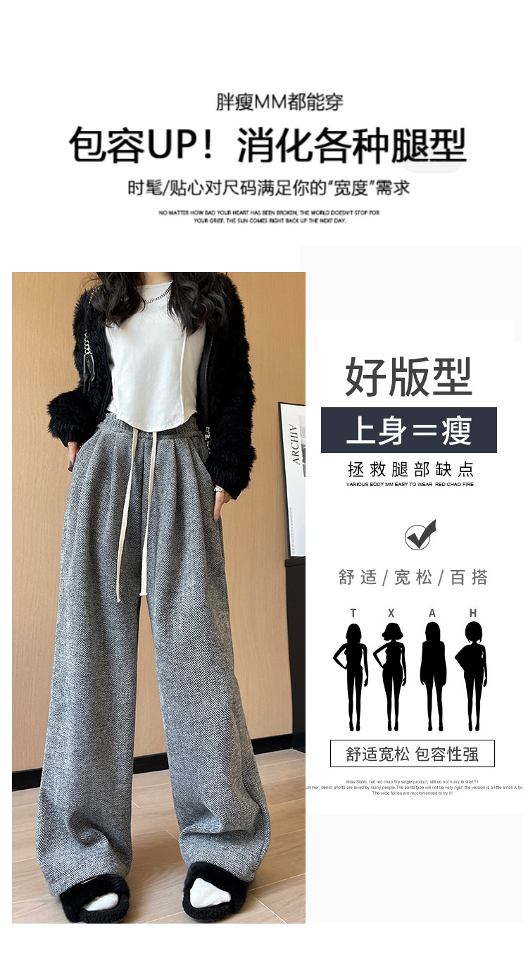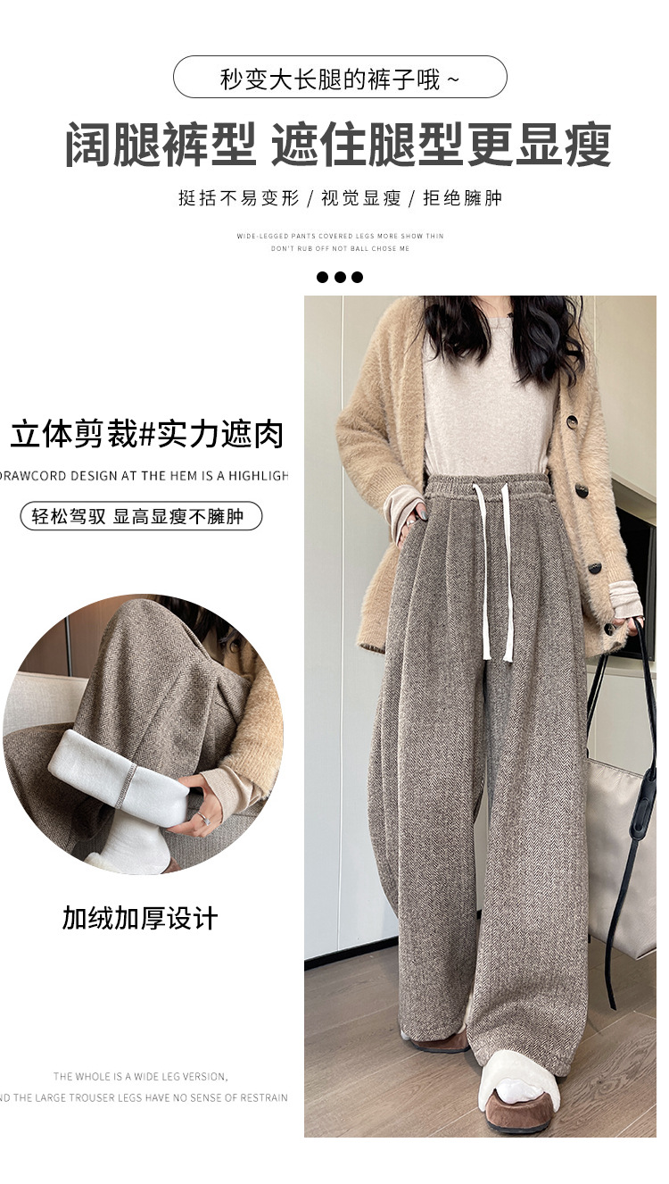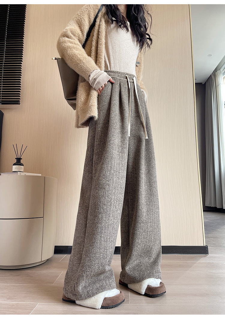 人字纹毛呢阔腿裤女秋冬新款加绒裤子高腰垂感直筒拖地针织休闲裤