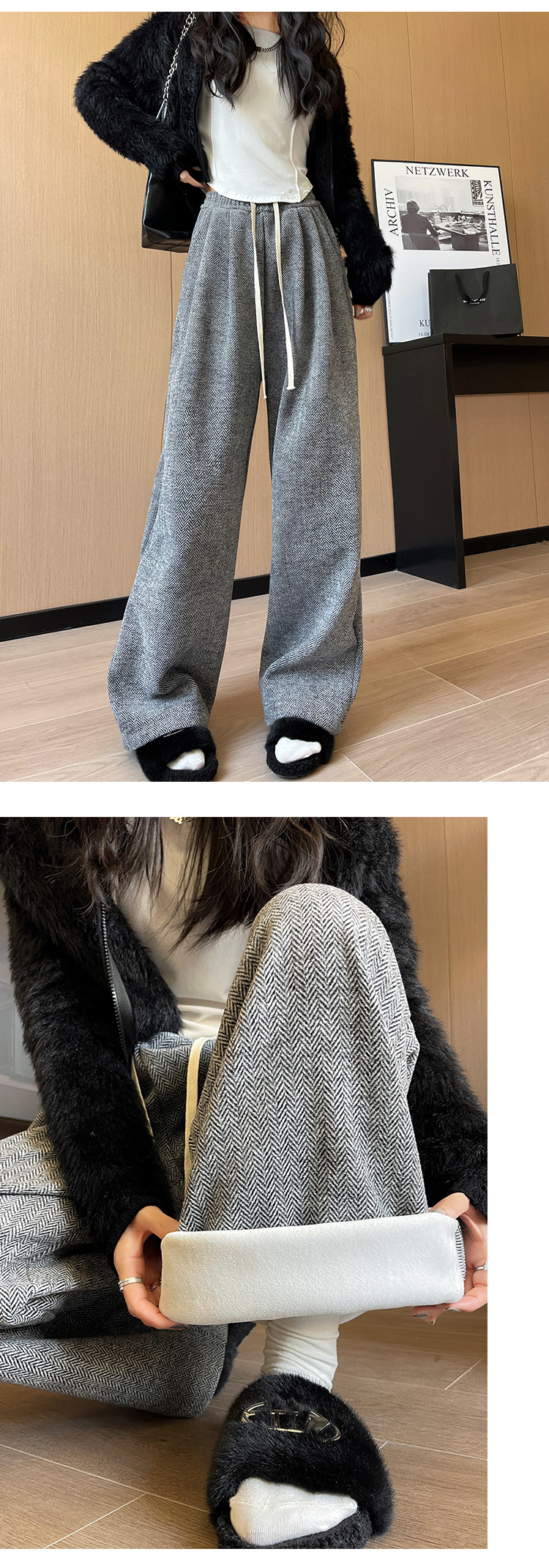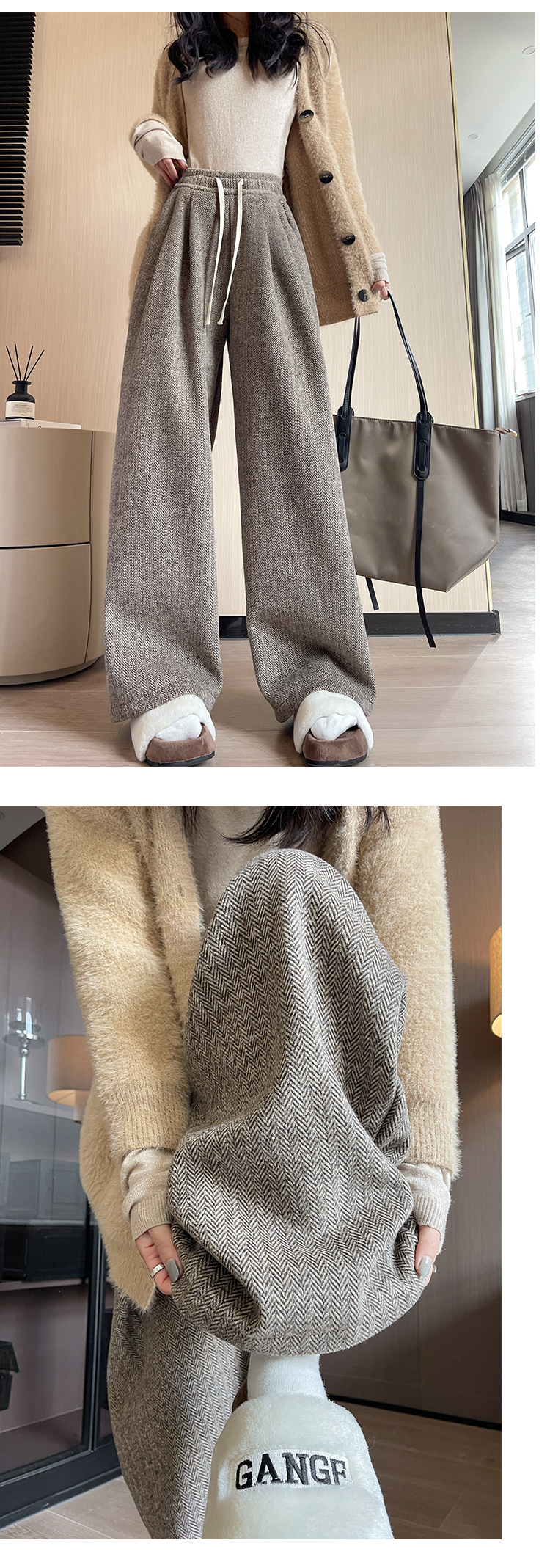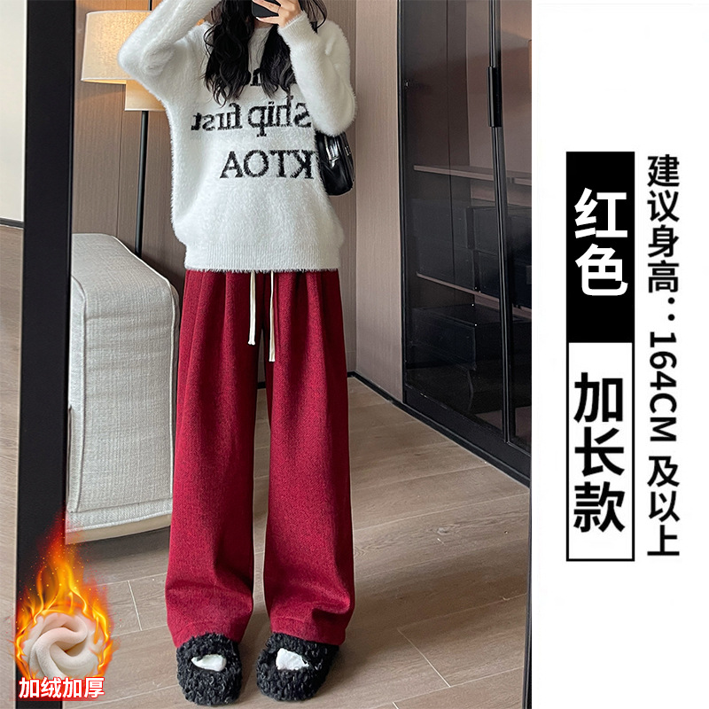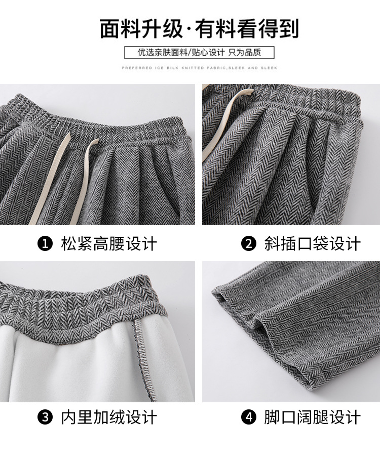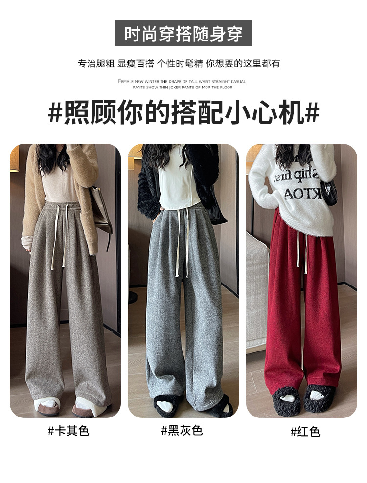 人字纹毛呢阔腿裤女秋冬新款加绒裤子高腰垂感直筒拖地针织休闲裤