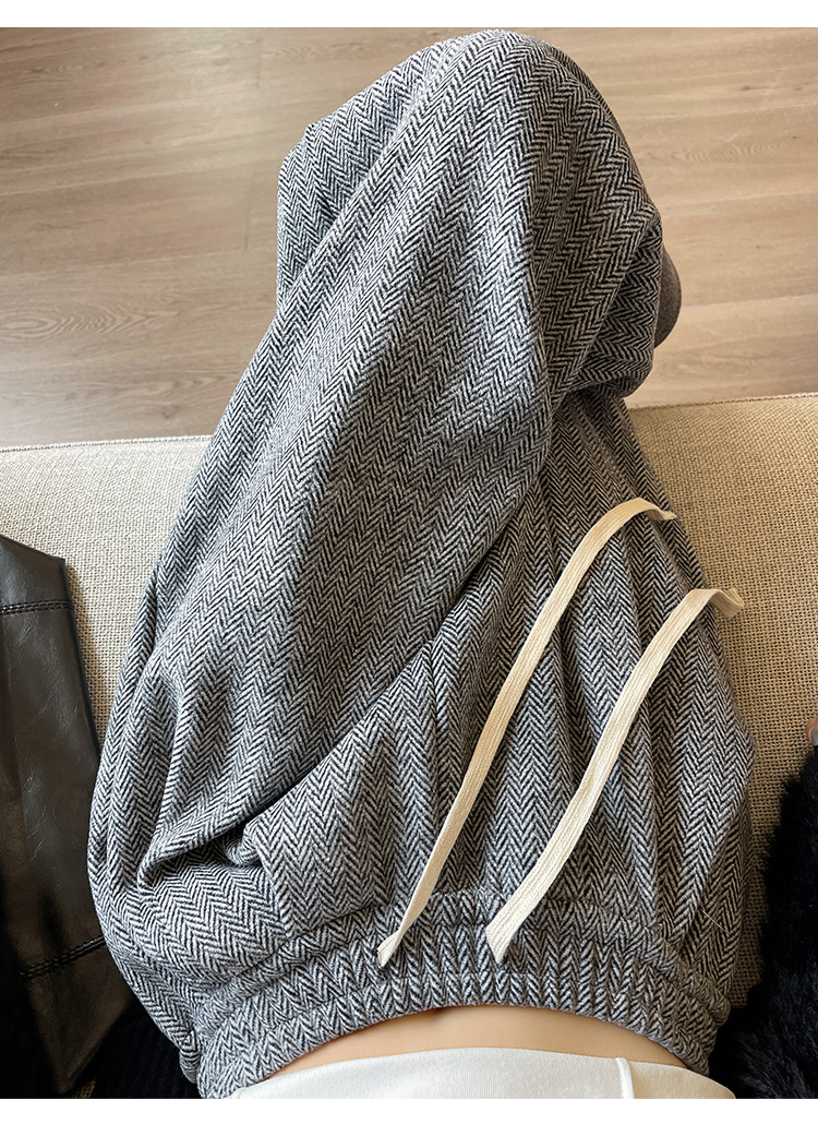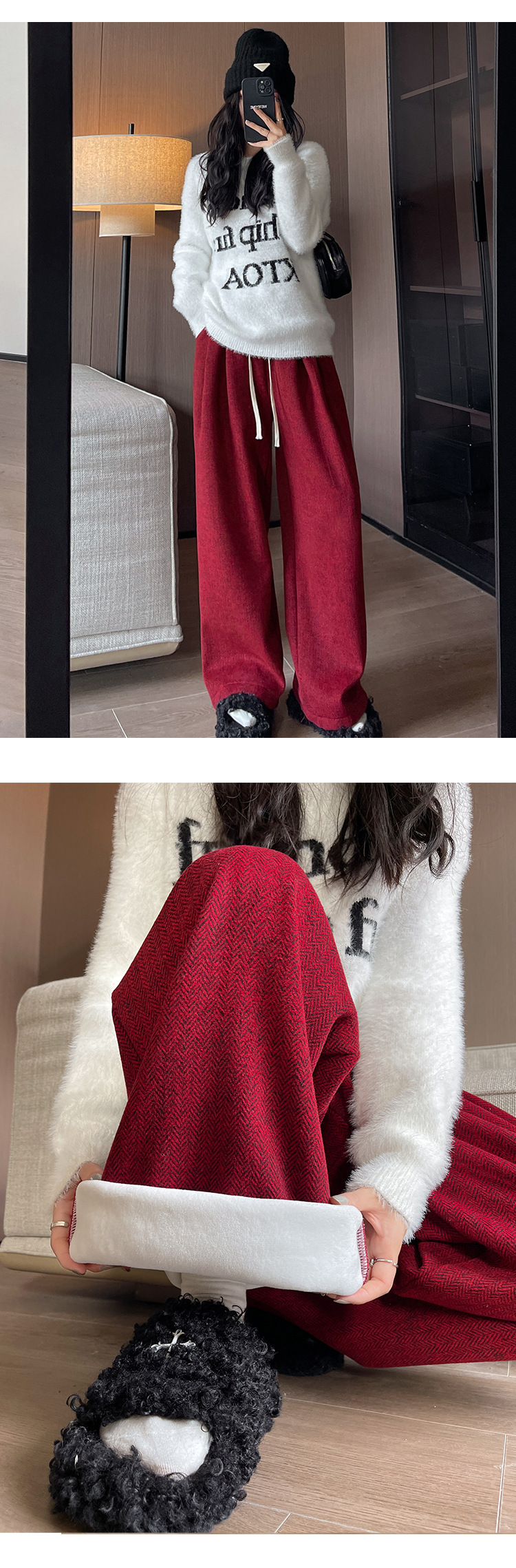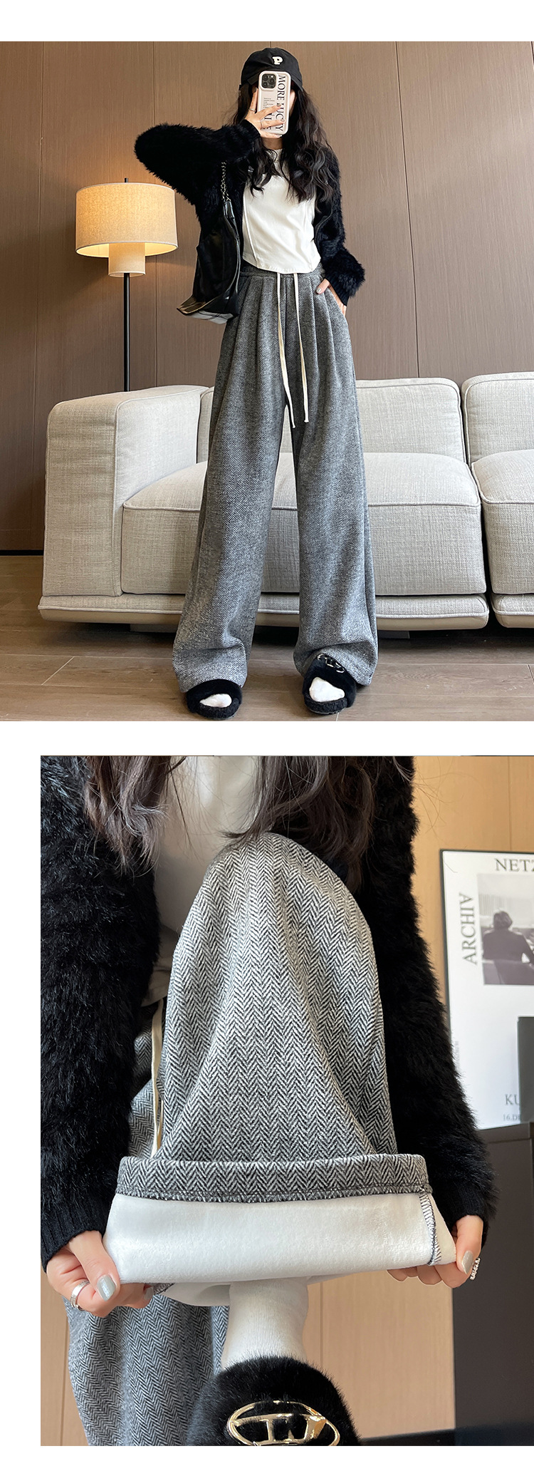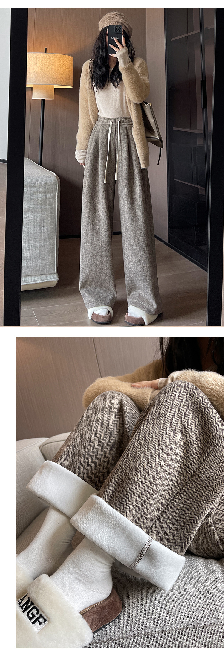 人字纹毛呢阔腿裤女秋冬新款加绒裤子高腰垂感直筒拖地针织休闲裤