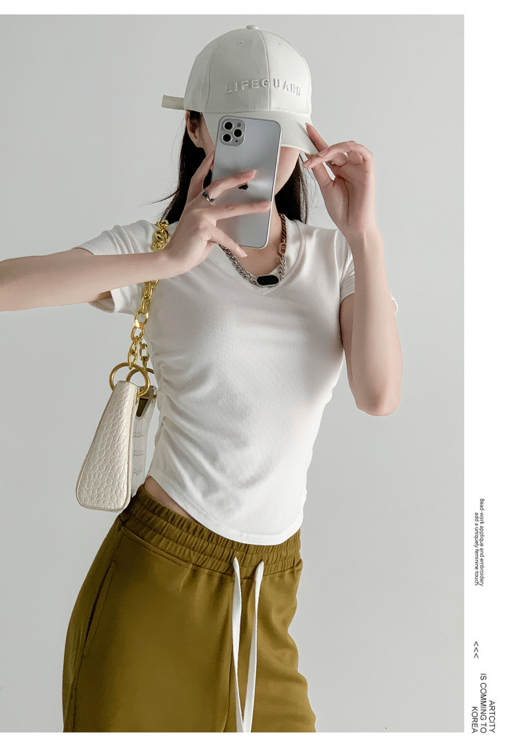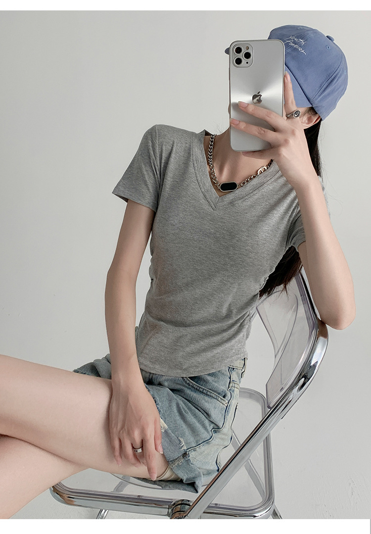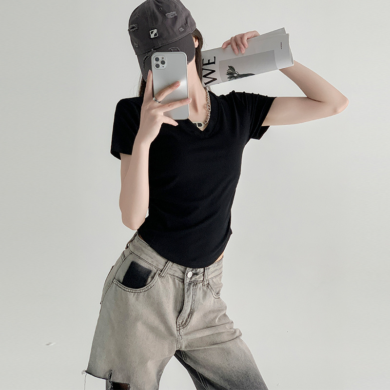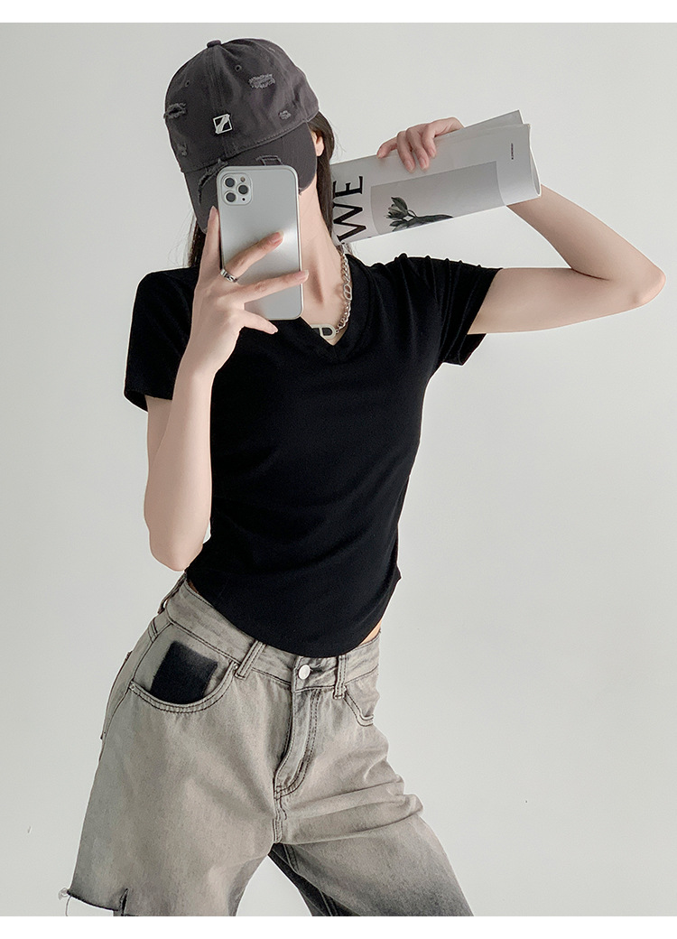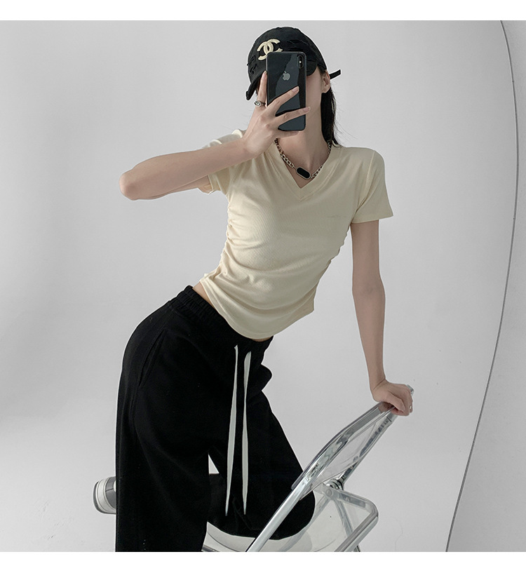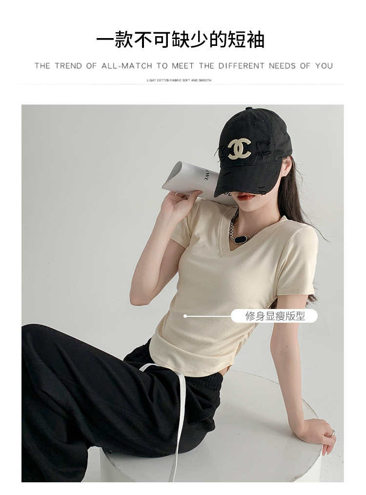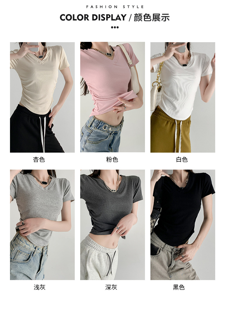 螺纹V领正肩短袖T恤女春夏新款露脐内搭打底衫性感辣妹修身上衣女