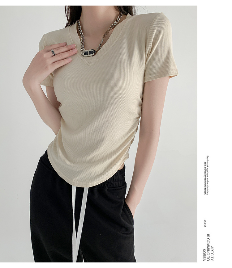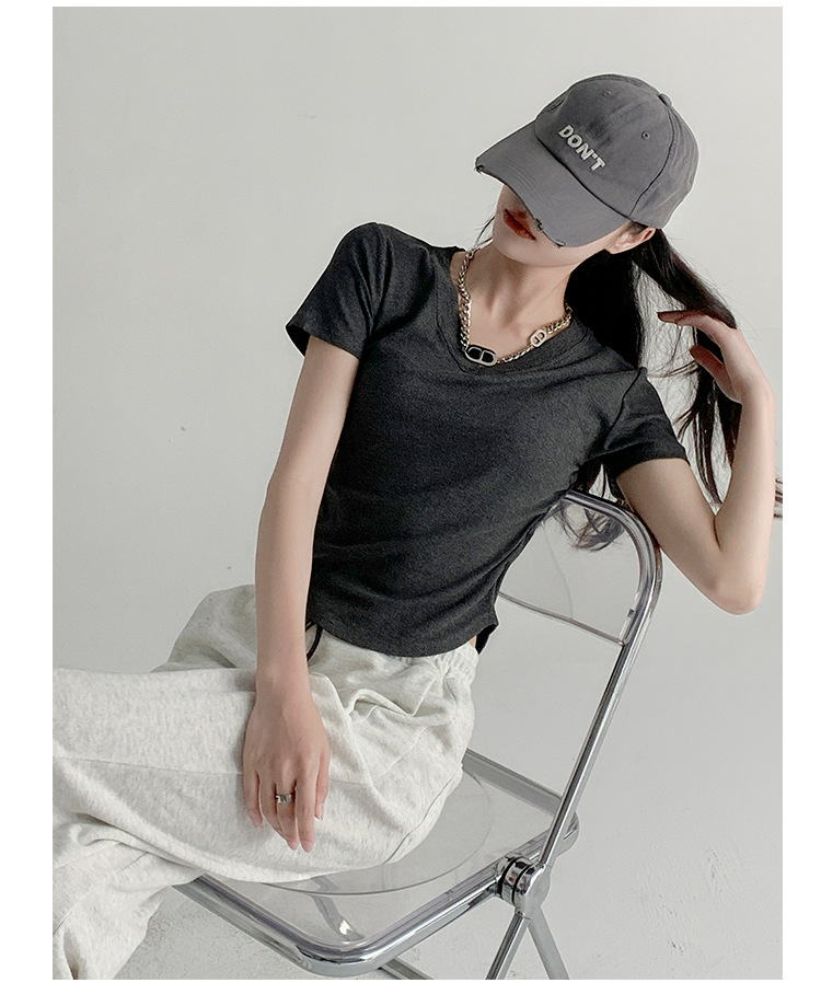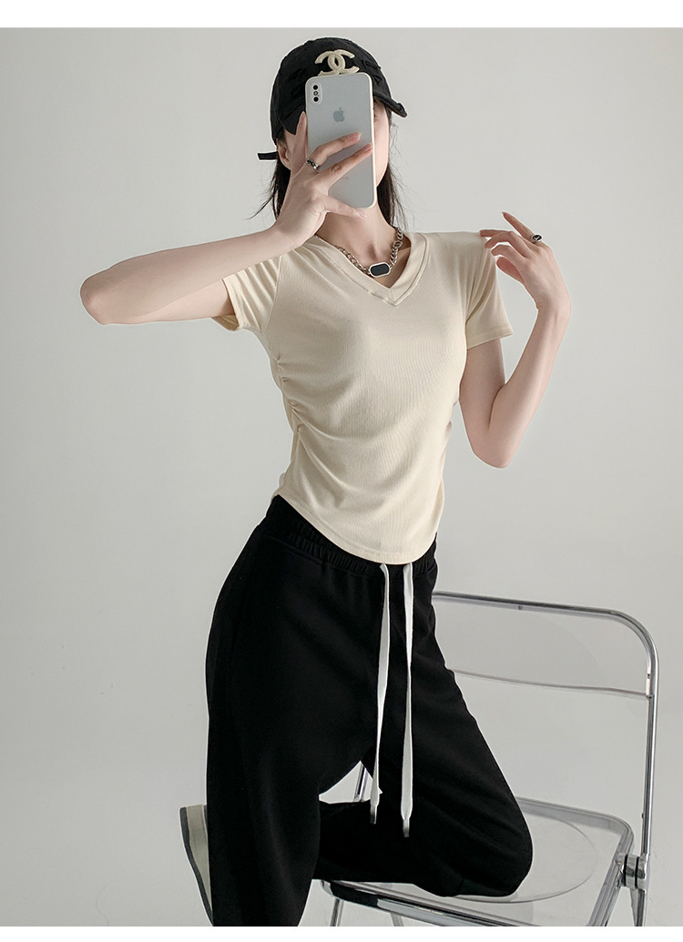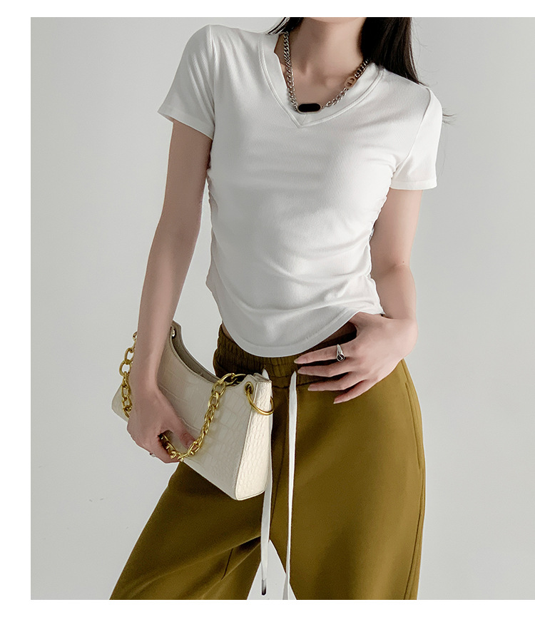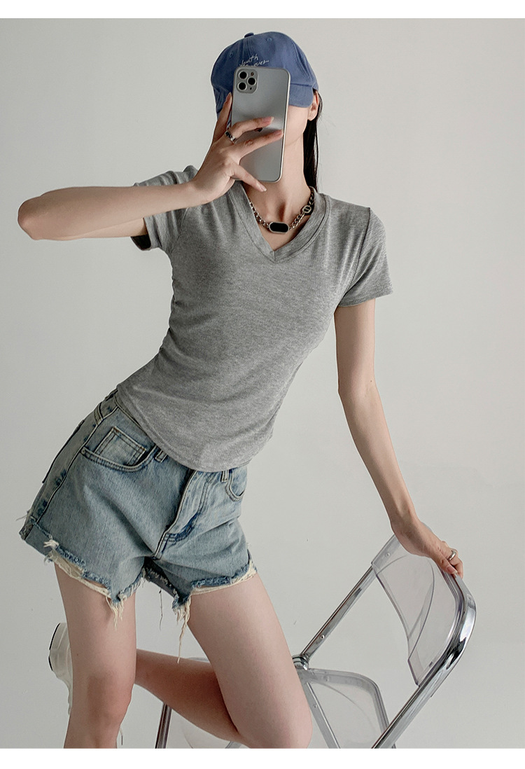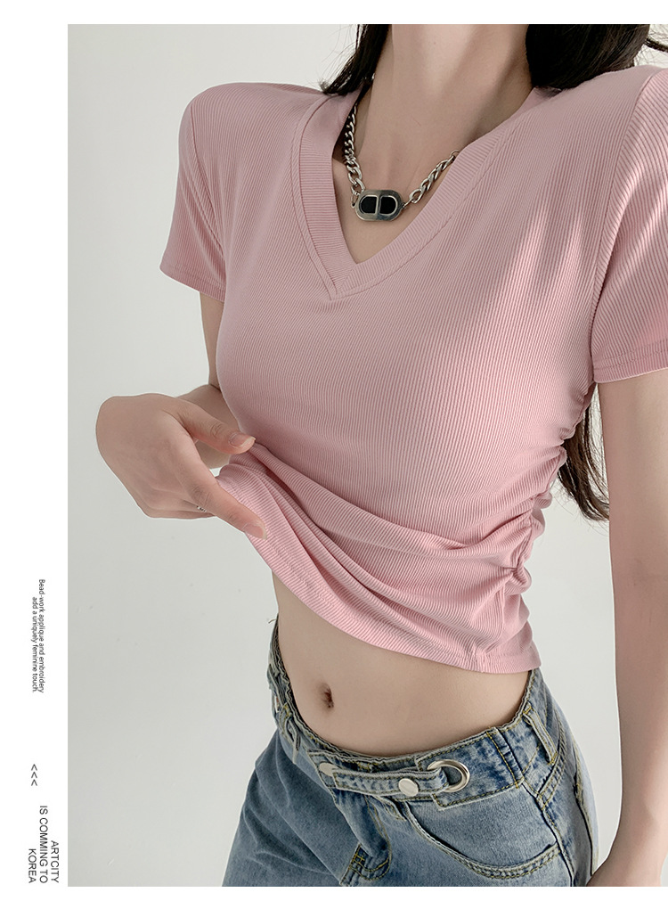 螺纹V领正肩短袖T恤女春夏新款露脐内搭打底衫性感辣妹修身上衣女