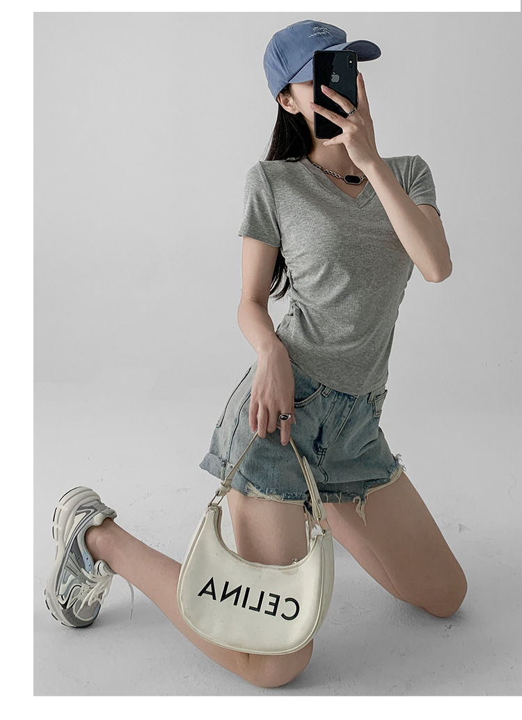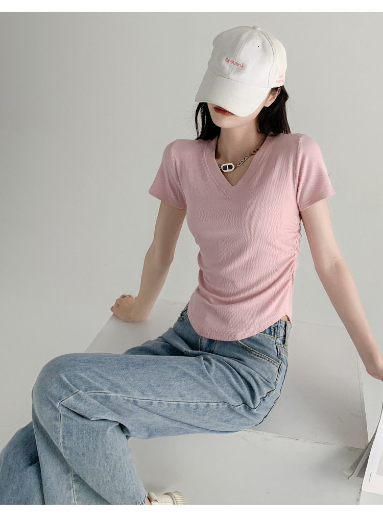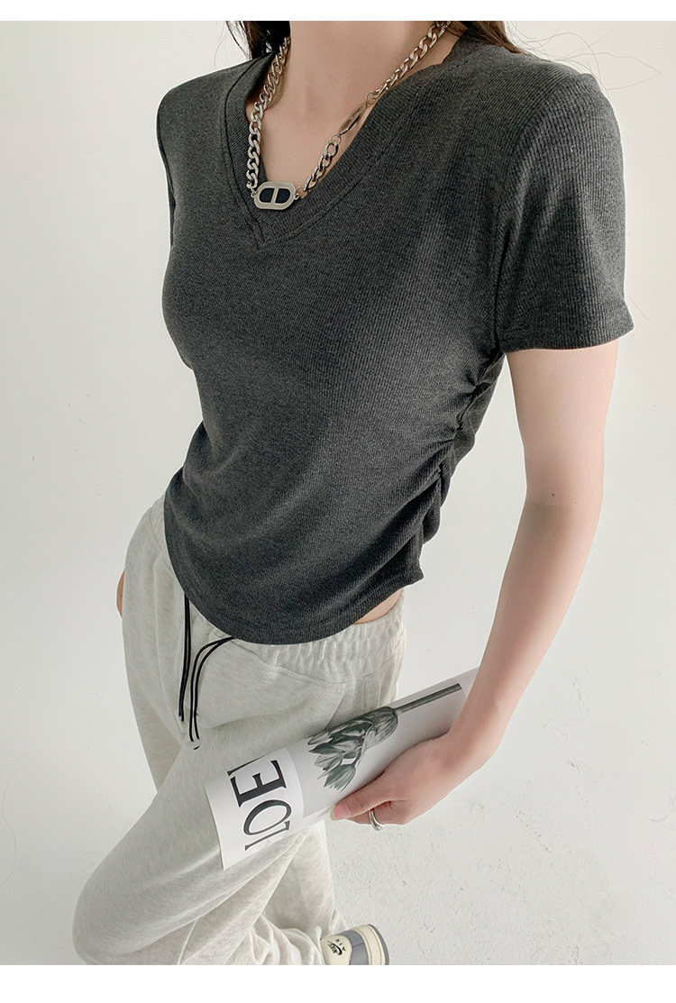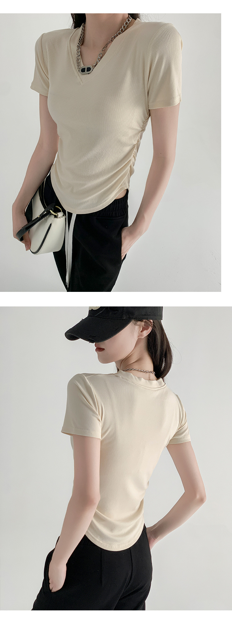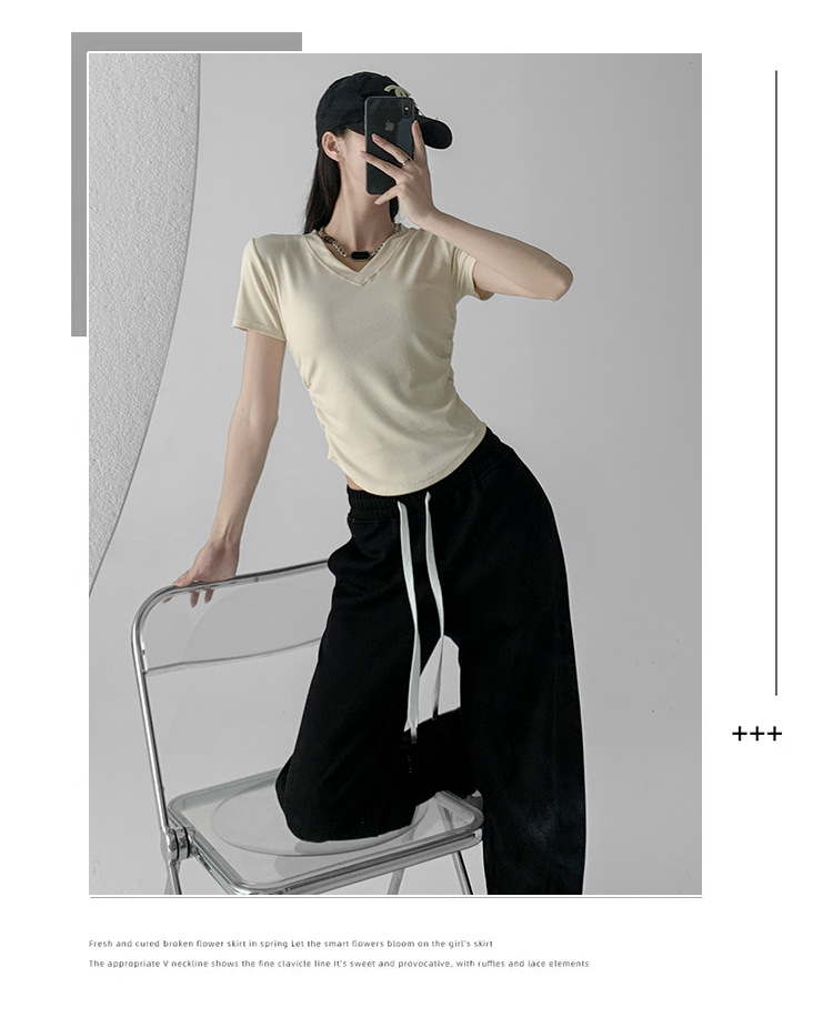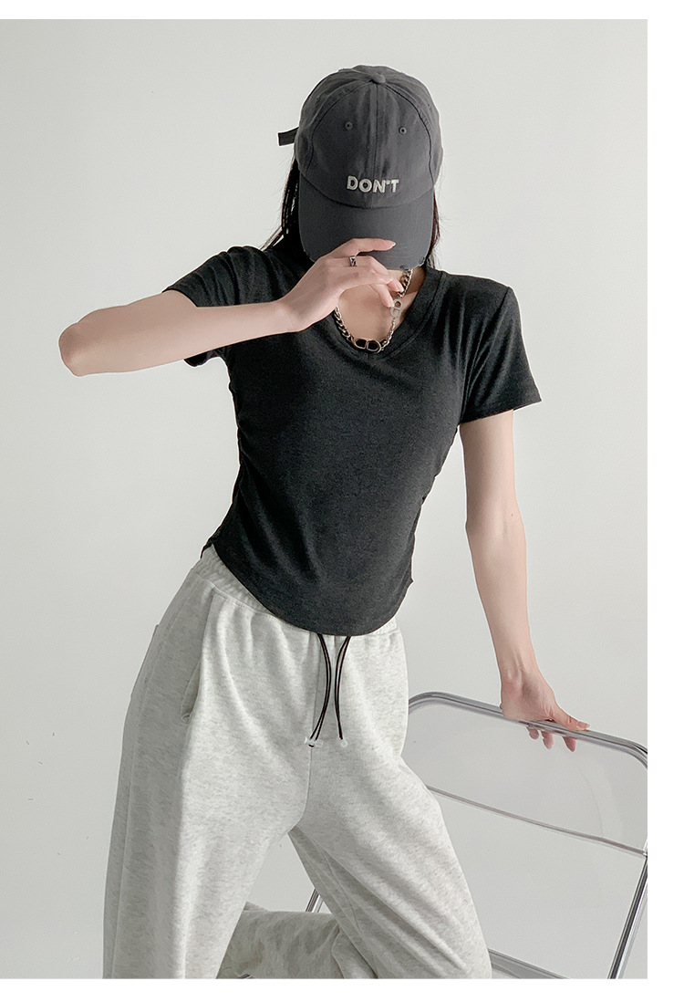 螺纹V领正肩短袖T恤女春夏新款露脐内搭打底衫性感辣妹修身上衣女