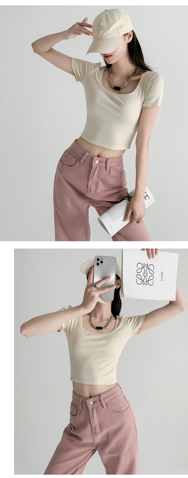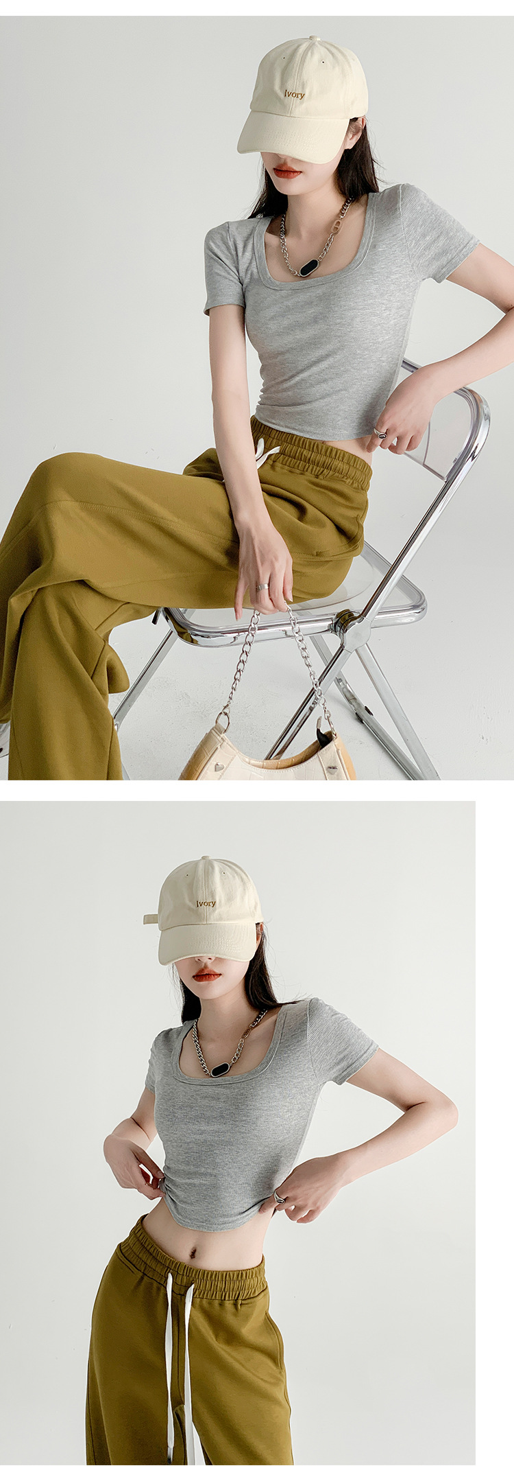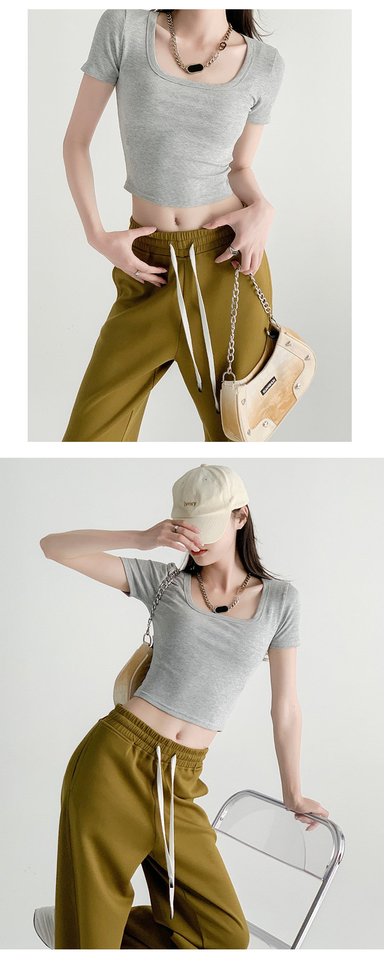 辣妹方领短袖T恤女夏季新款小众设计感打底衫修身露脐短款上衣潮