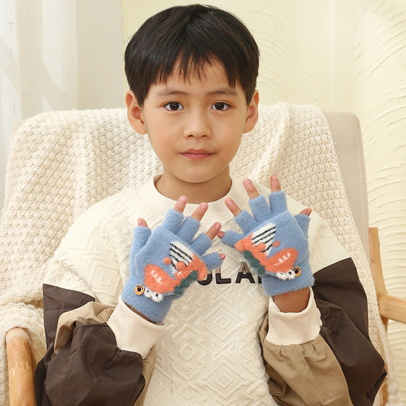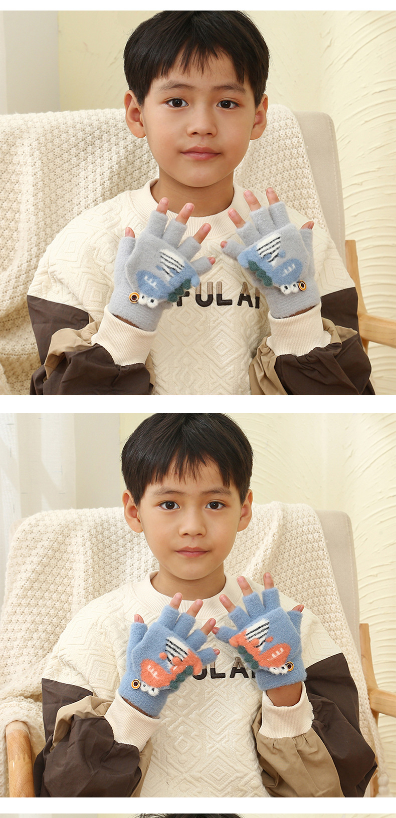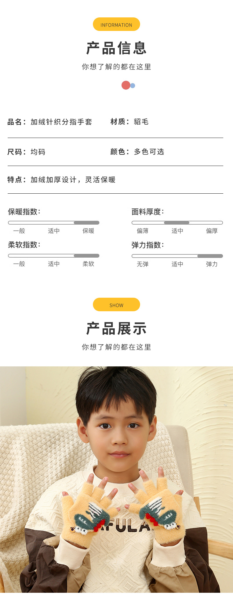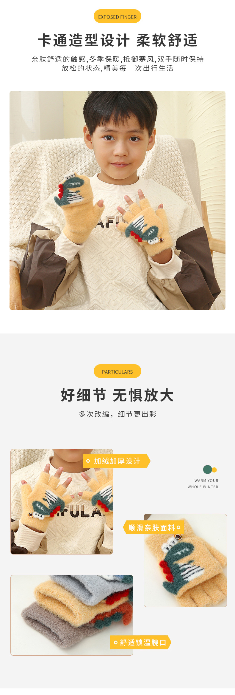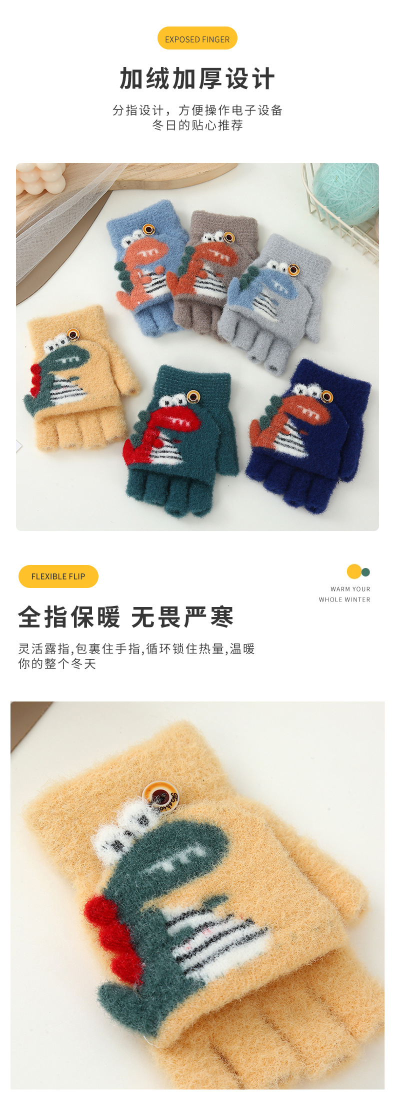 儿童手套冬季保暖手套学生加绒针织分指手套可爱卡通恐龙半指手套