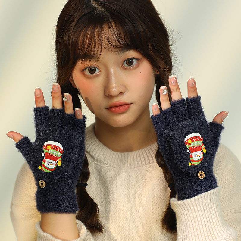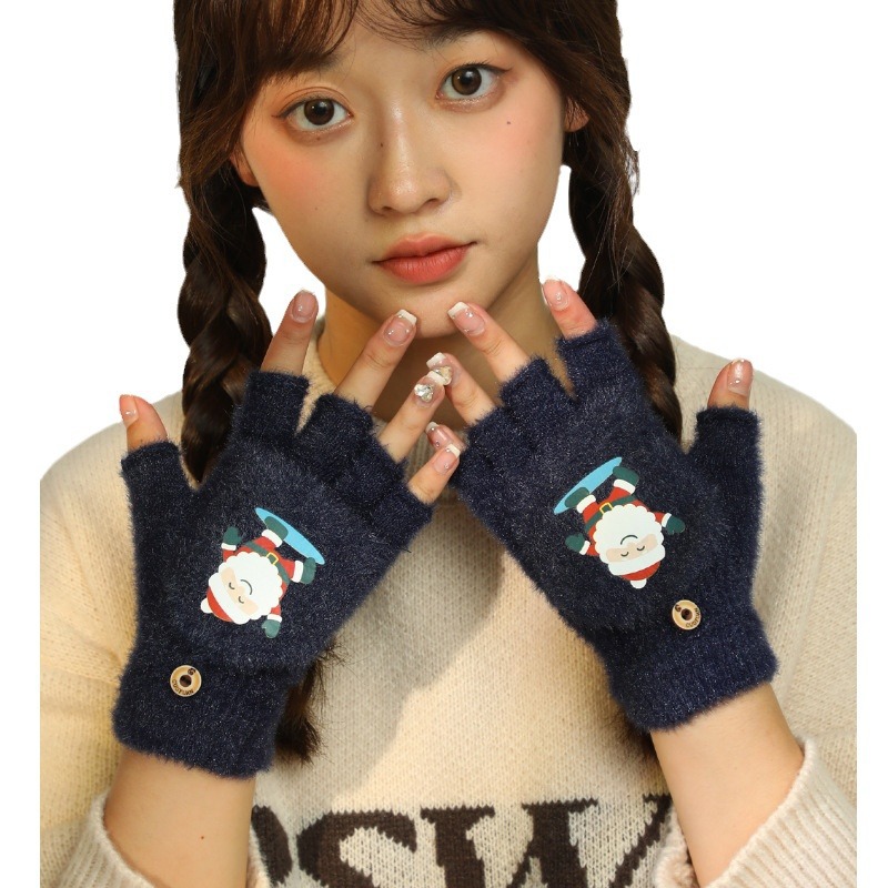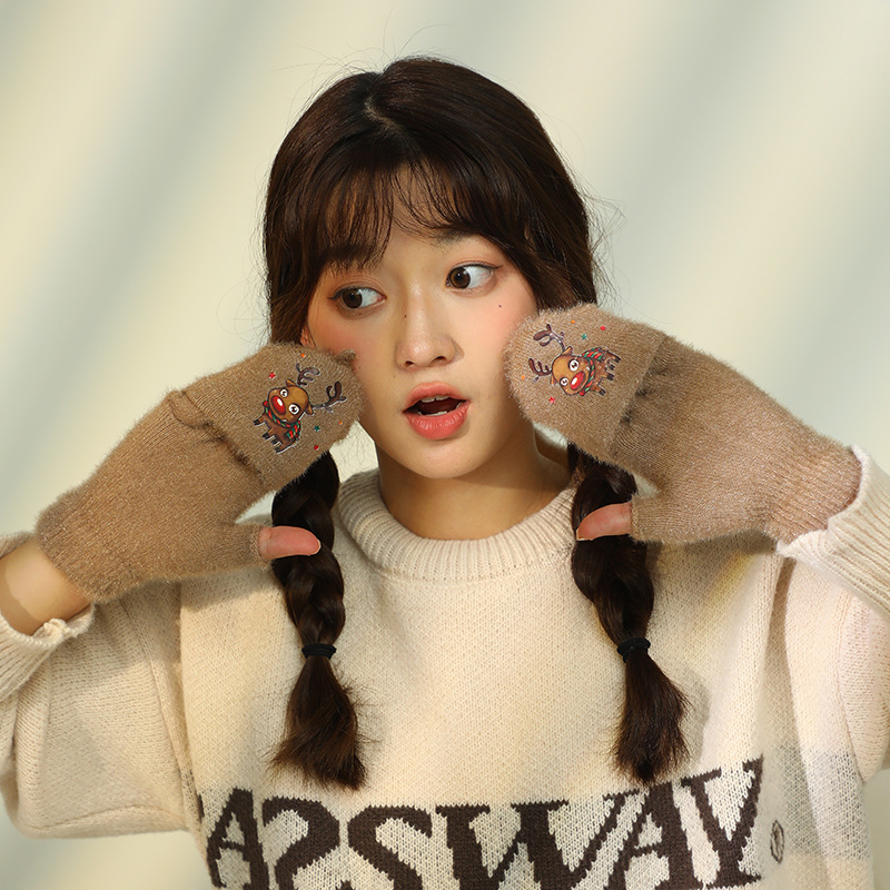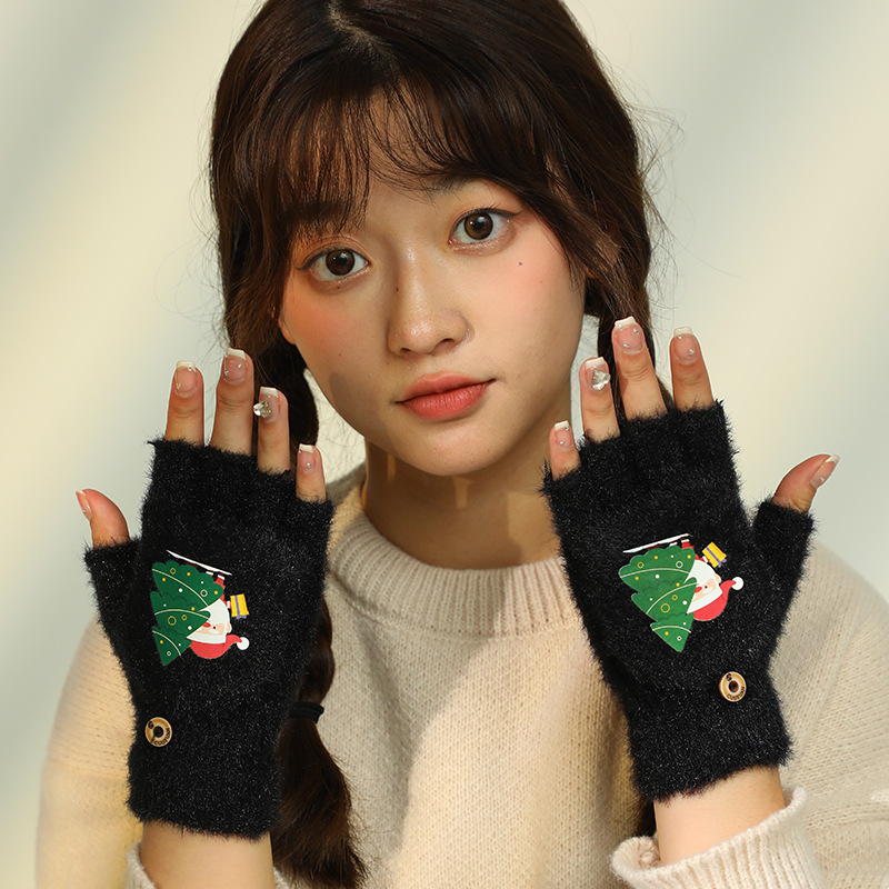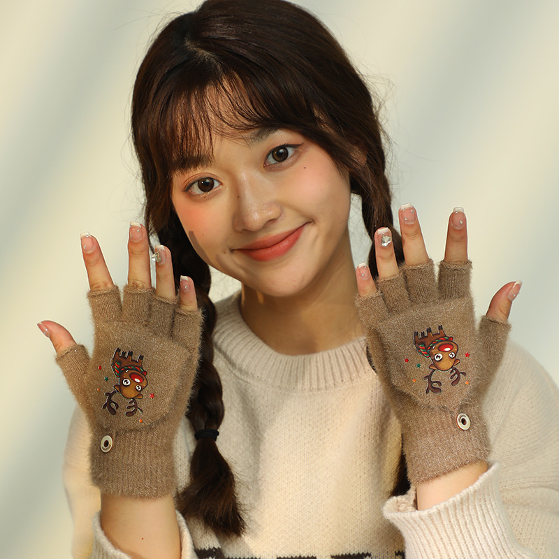 冬季新款可爱卡通毛绒保暖翻盖露指女学生写字防寒半指圣诞节手套