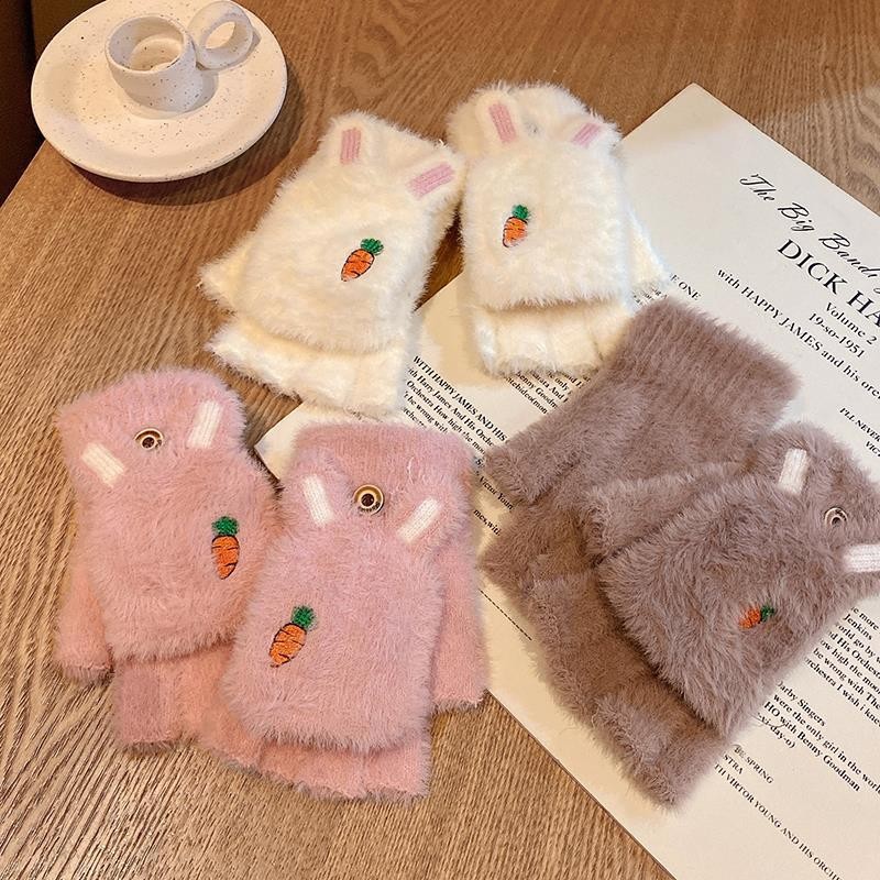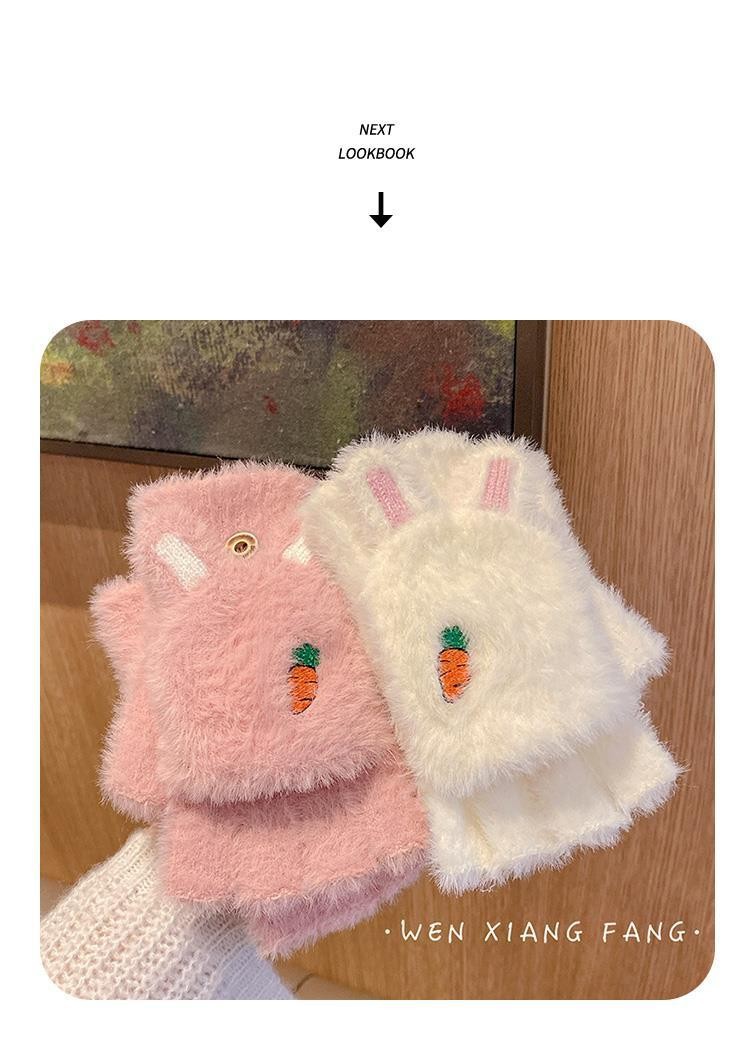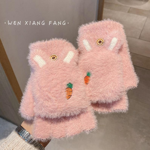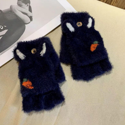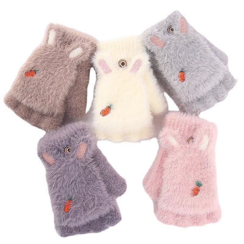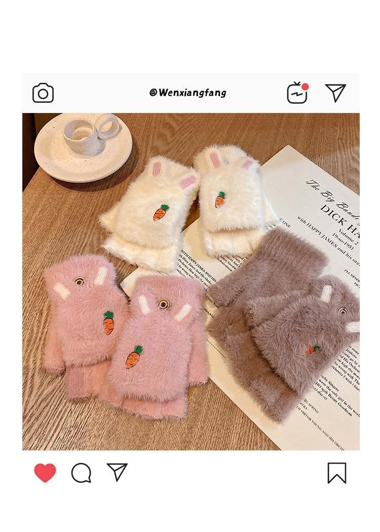 秋冬季女生学生款毛绒针织保暧翻盖半指萝卜新款露指兔耳朵手套女