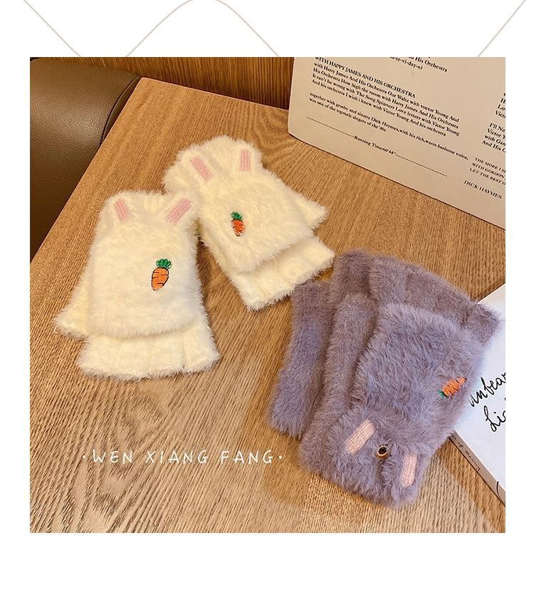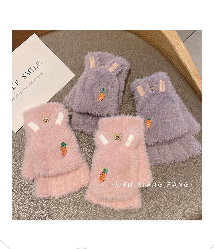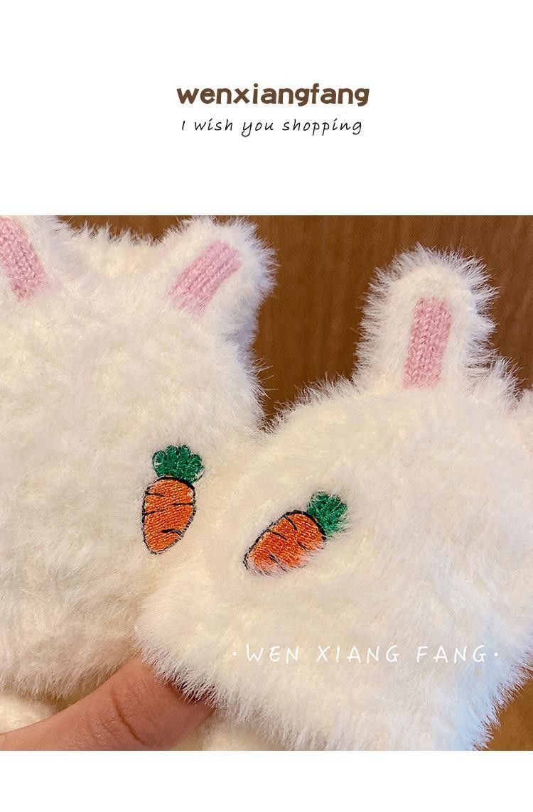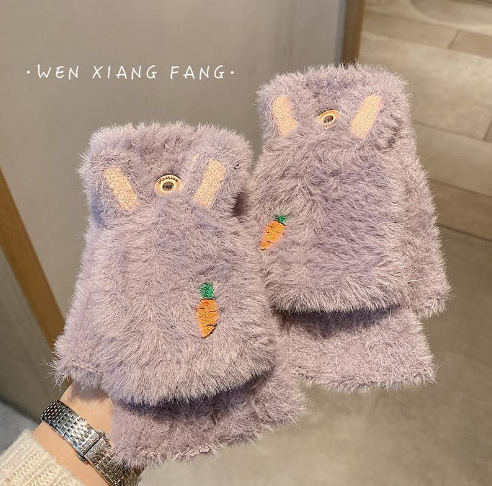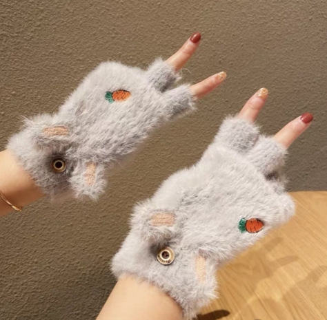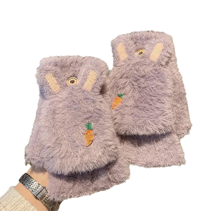 秋冬季女生学生款毛绒针织保暧翻盖半指萝卜新款露指兔耳朵手套女