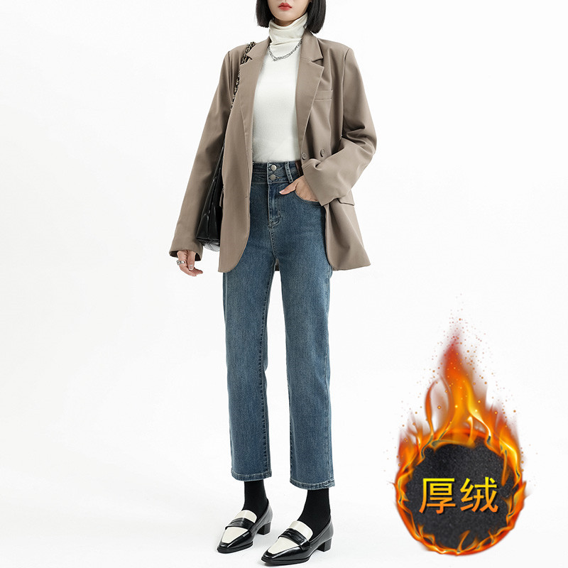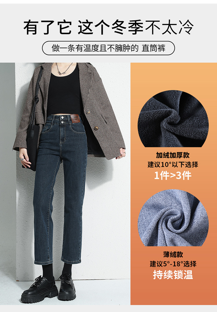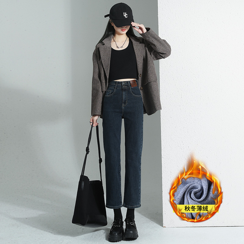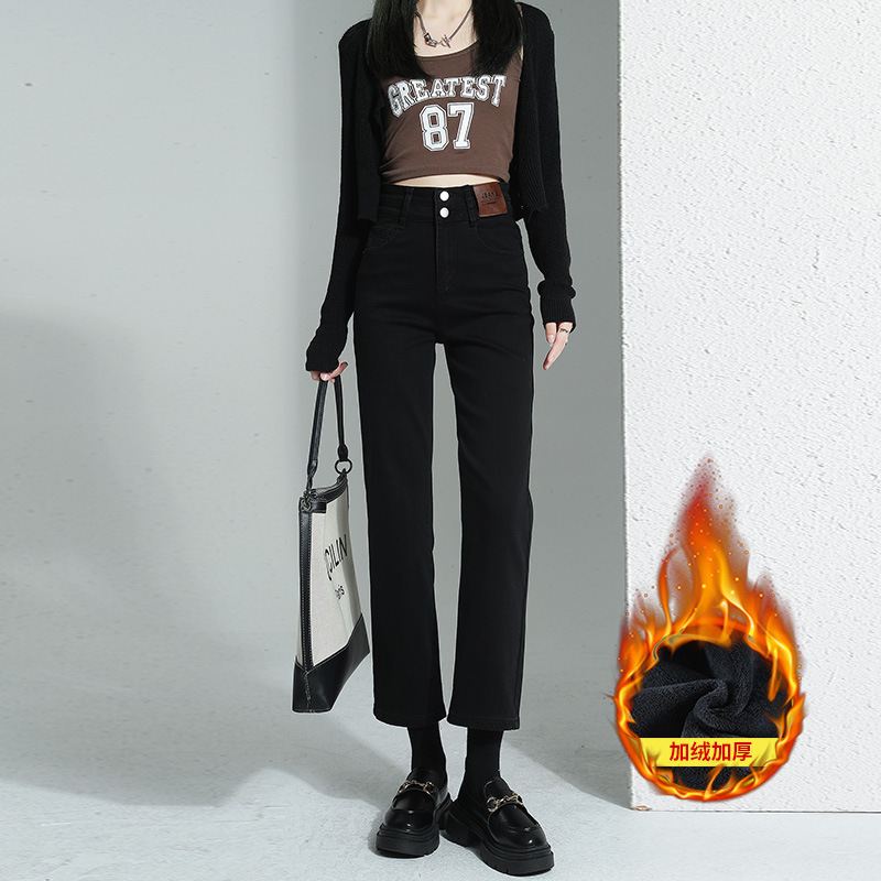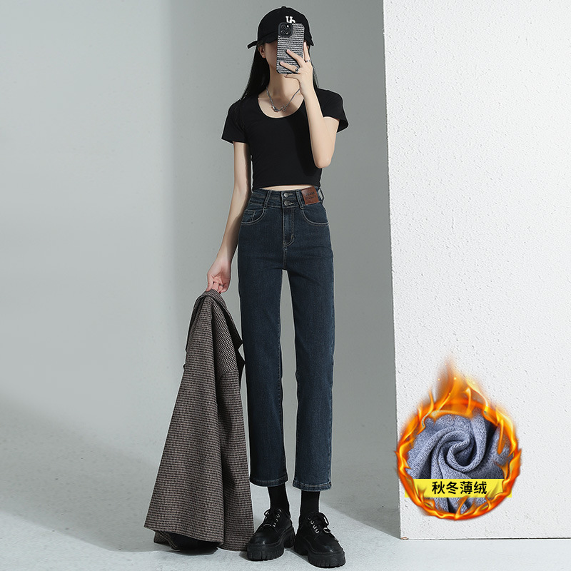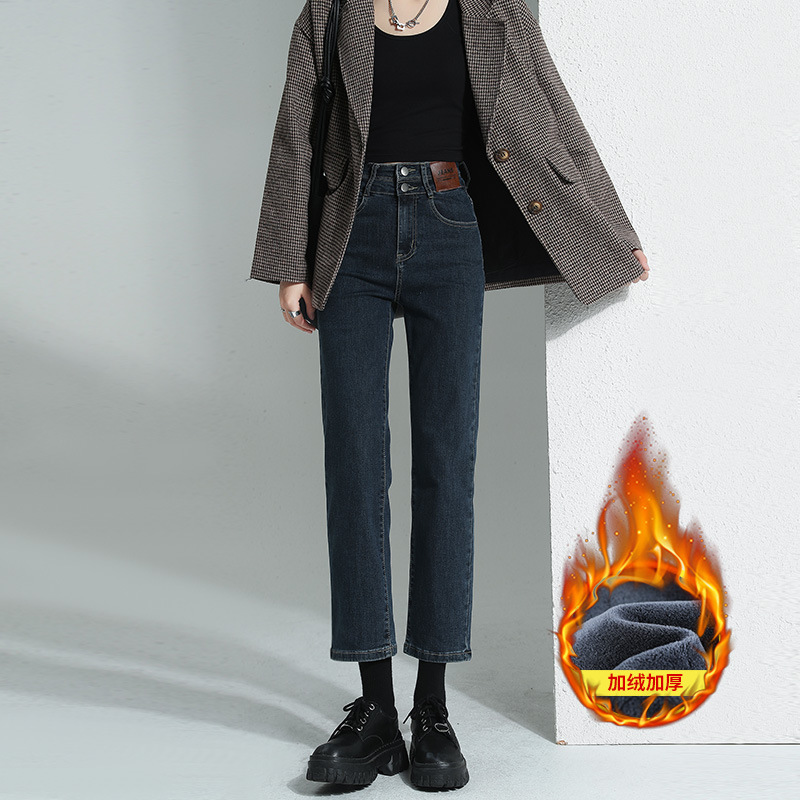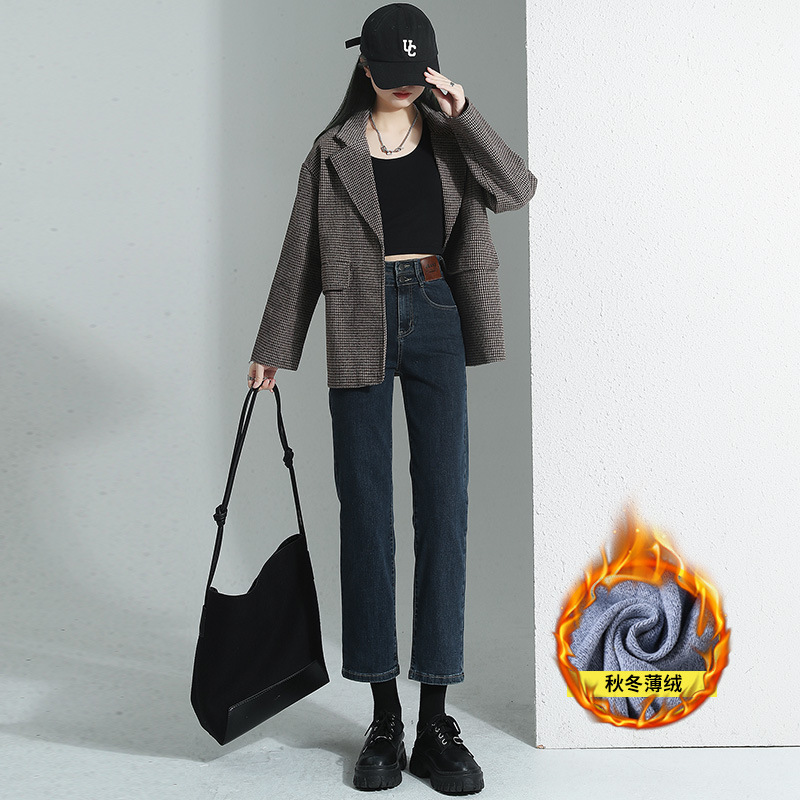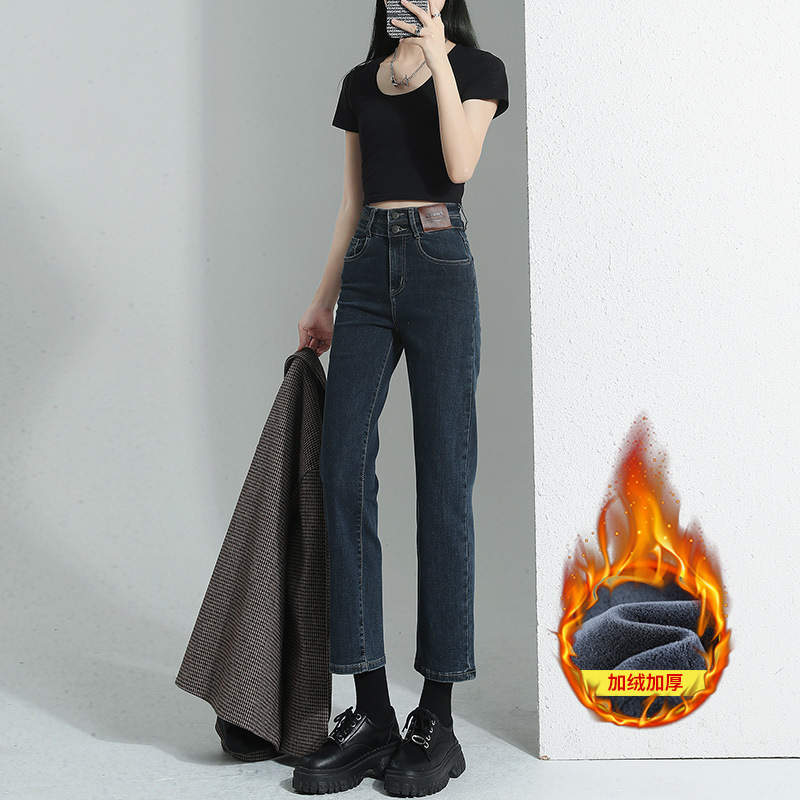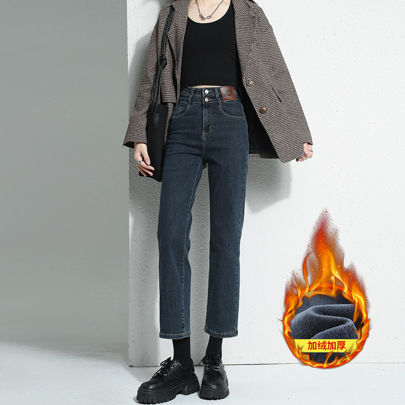 加绒加厚高腰九分直筒牛仔裤女2023秋冬新款弹力修身显瘦烟管裤子