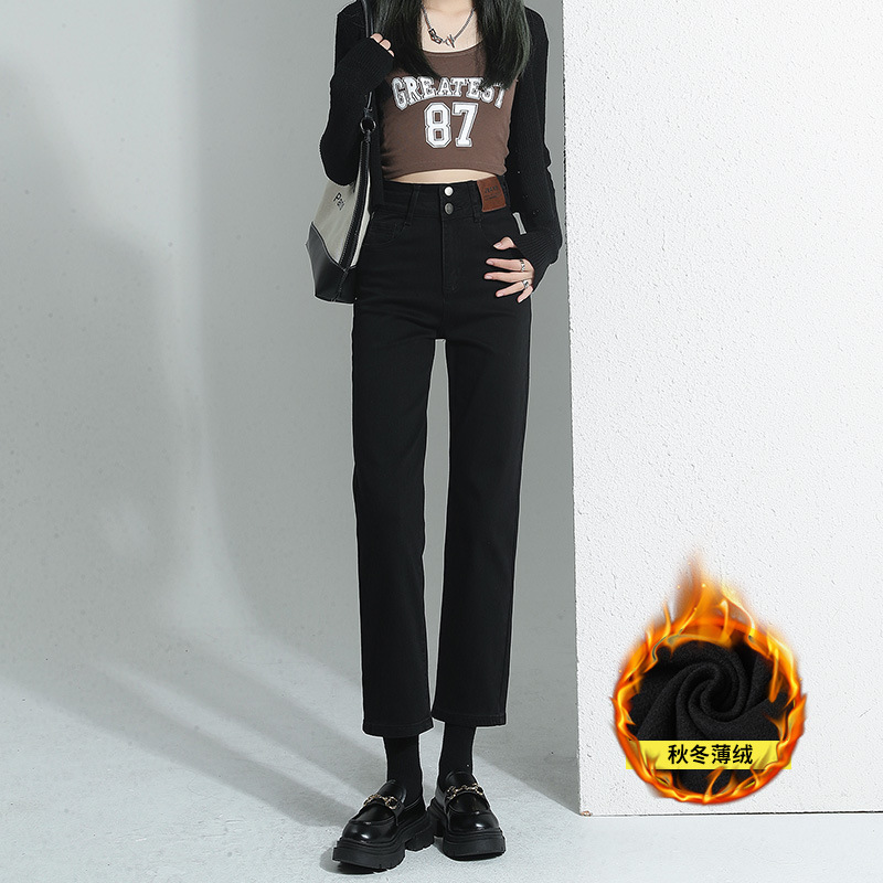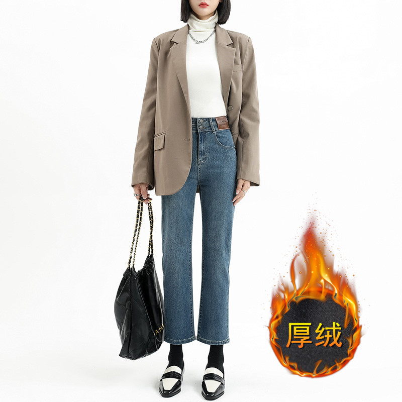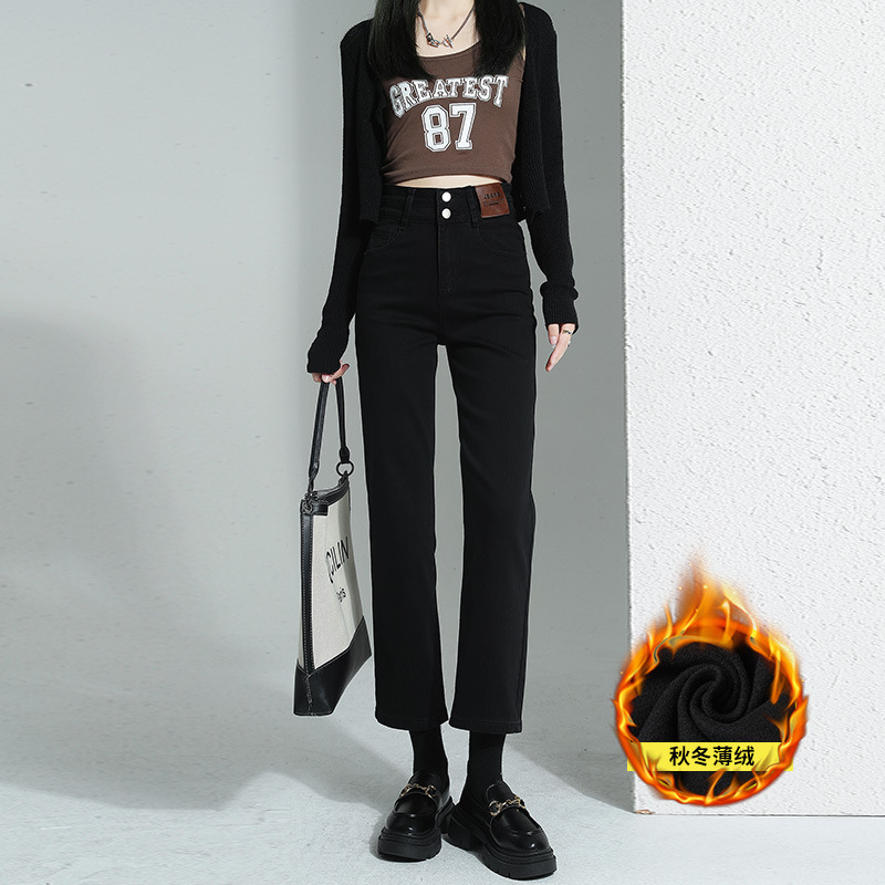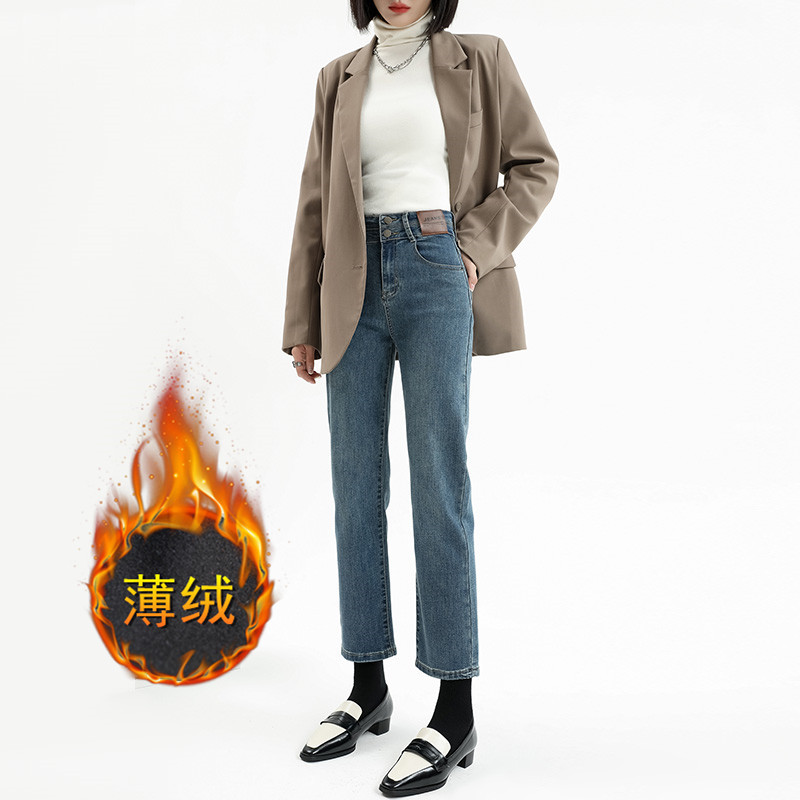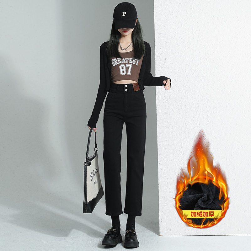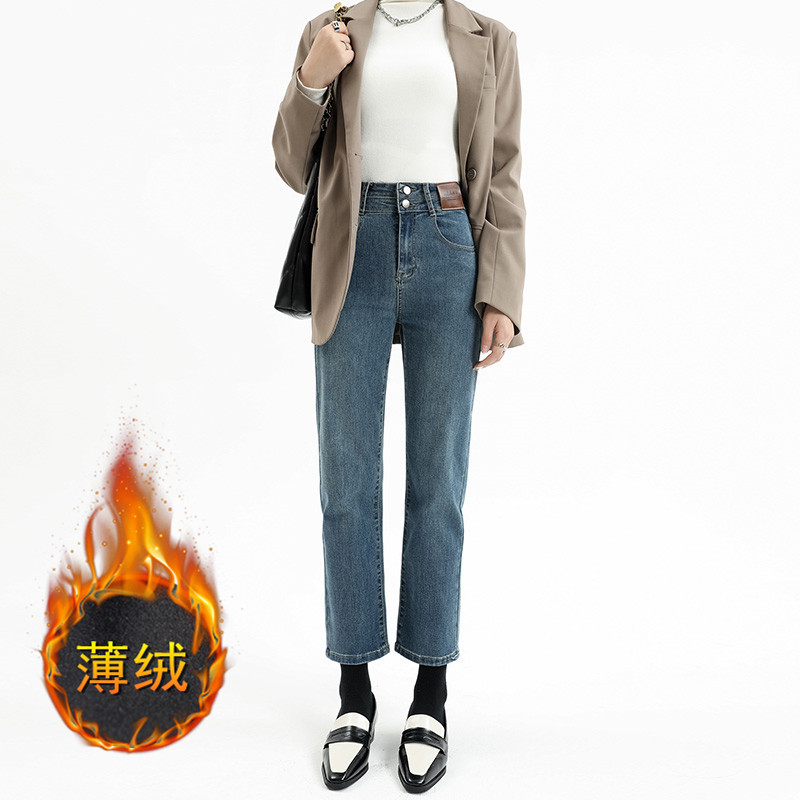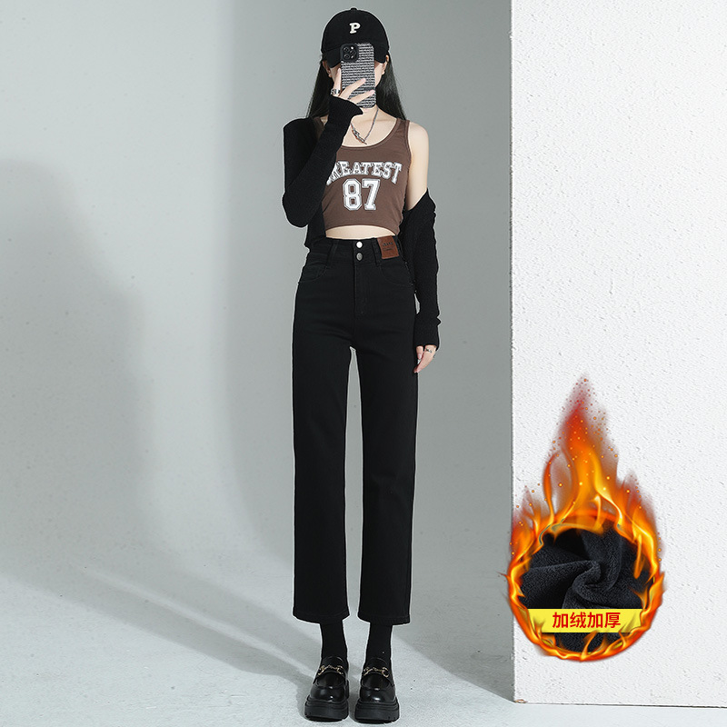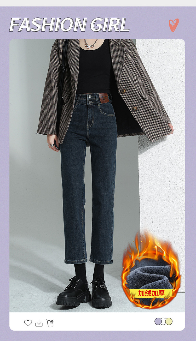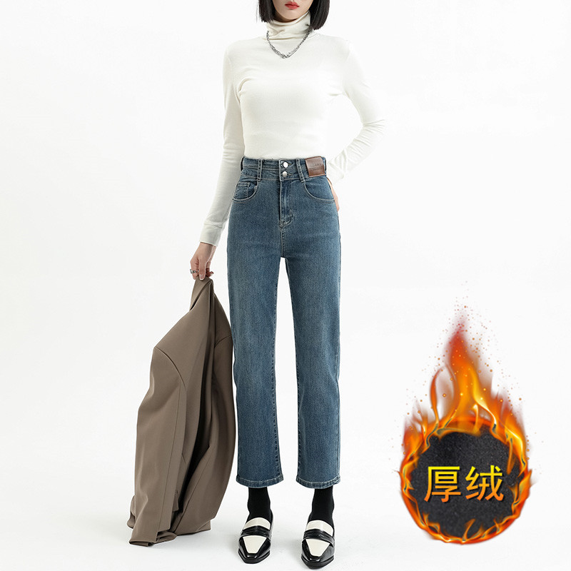 加绒加厚高腰九分直筒牛仔裤女2023秋冬新款弹力修身显瘦烟管裤子