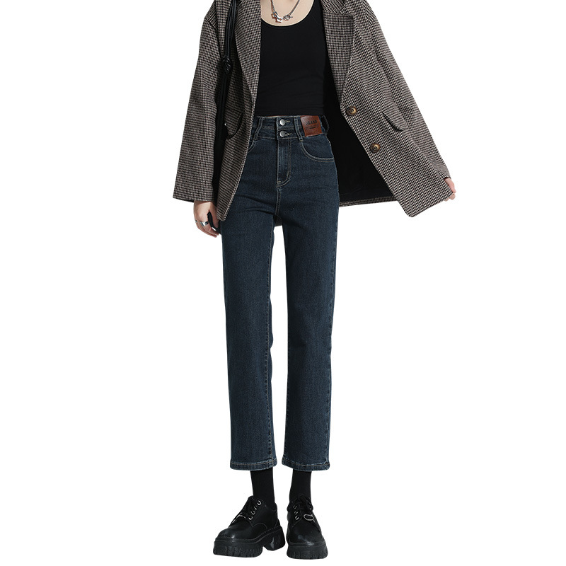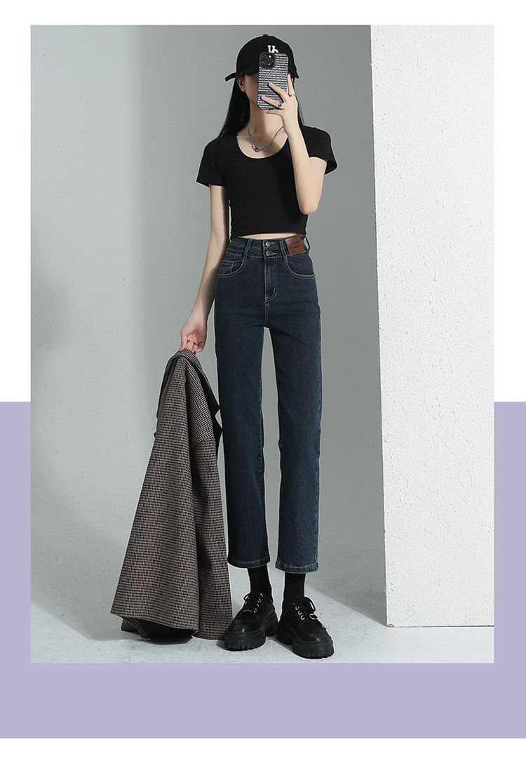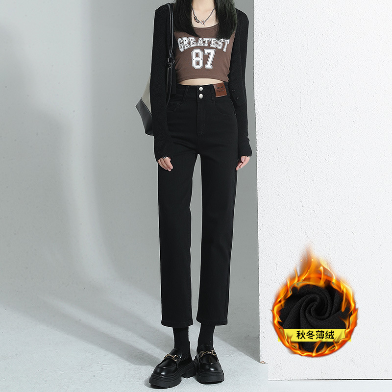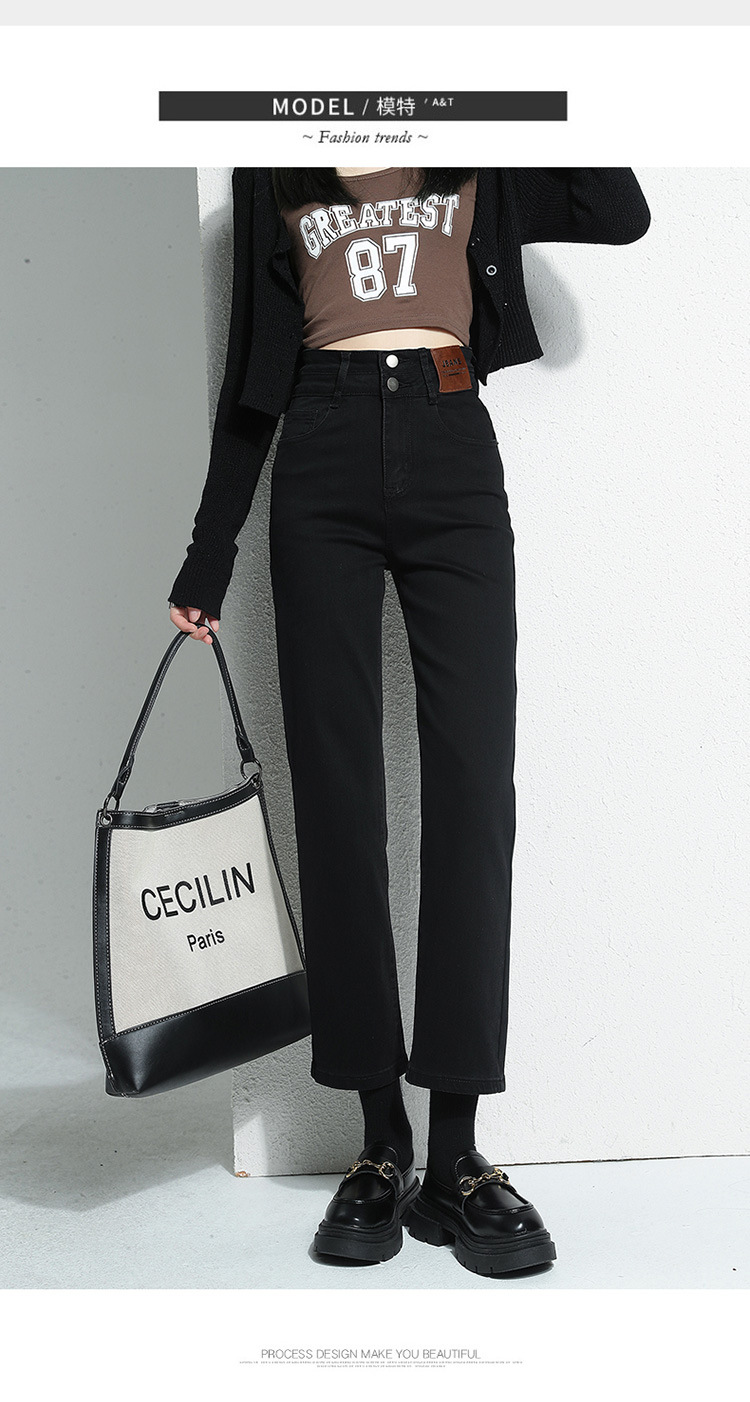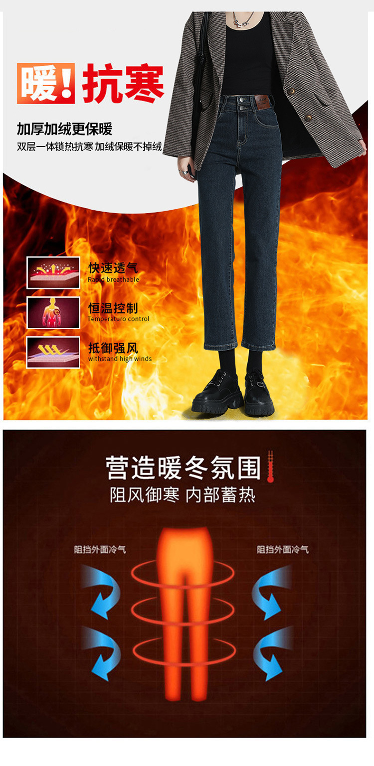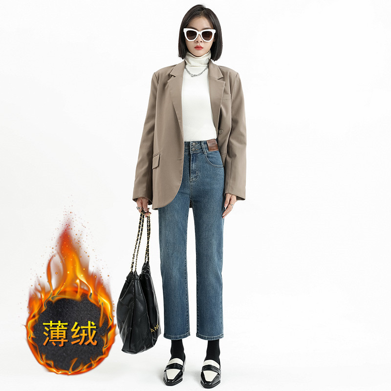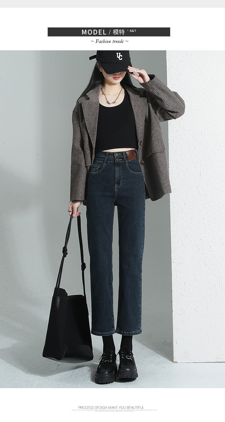 加绒加厚高腰九分直筒牛仔裤女2023秋冬新款弹力修身显瘦烟管裤子