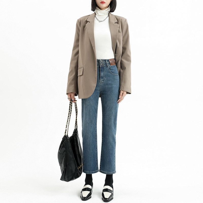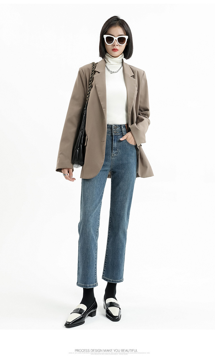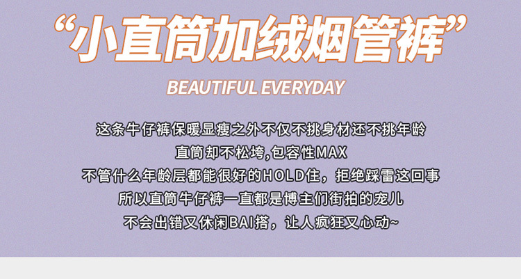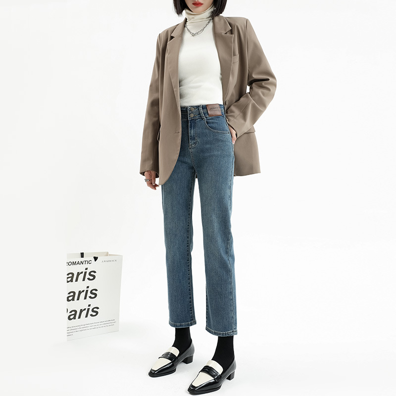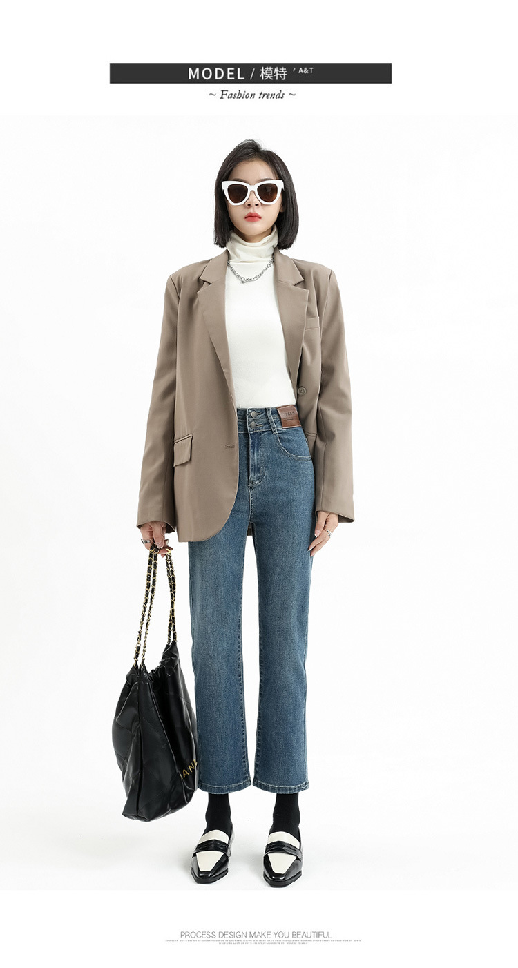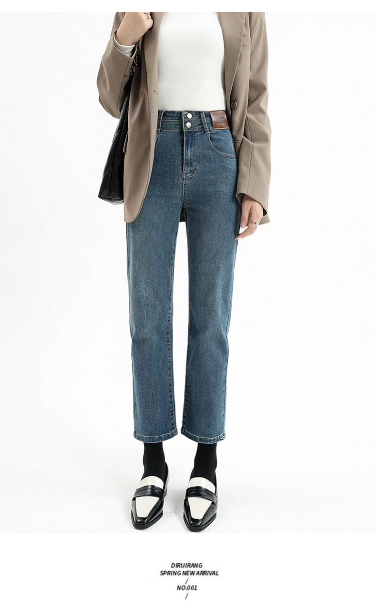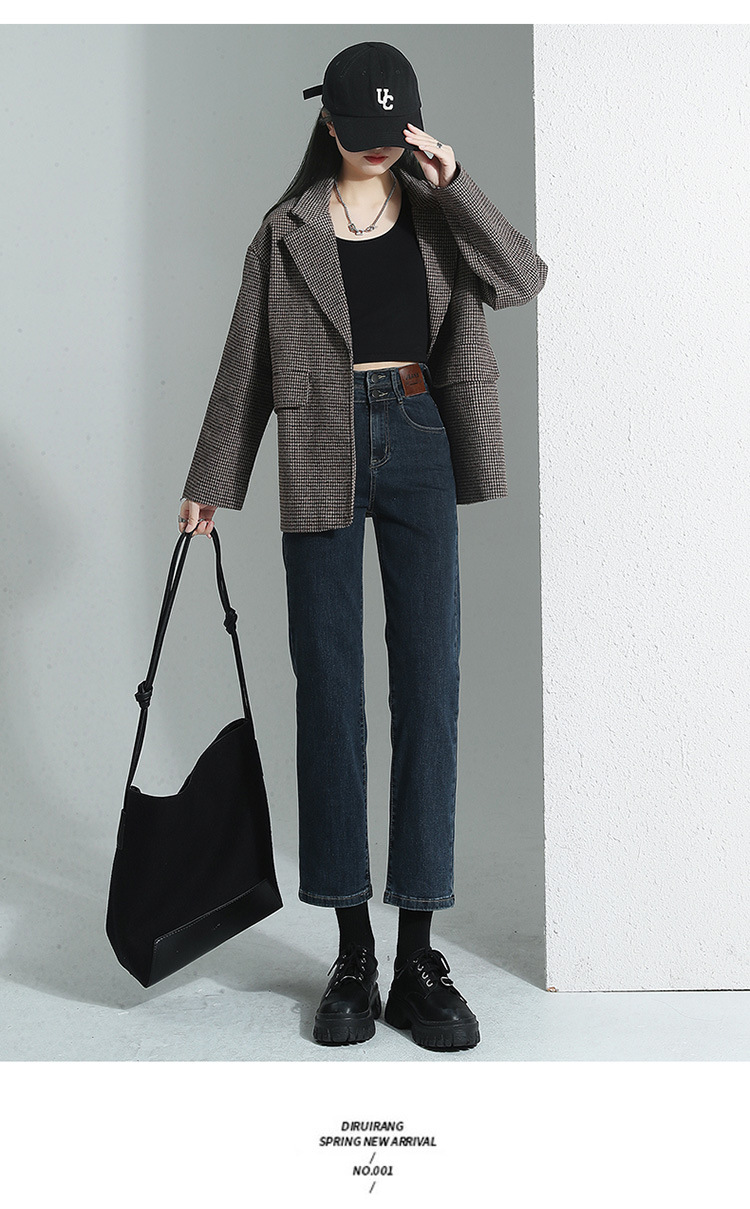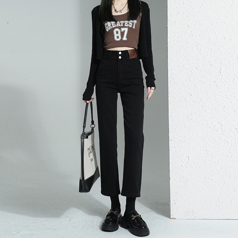 加绒加厚高腰九分直筒牛仔裤女2023秋冬新款弹力修身显瘦烟管裤子