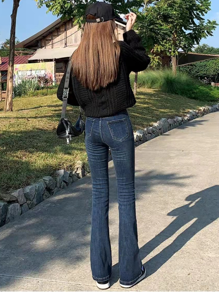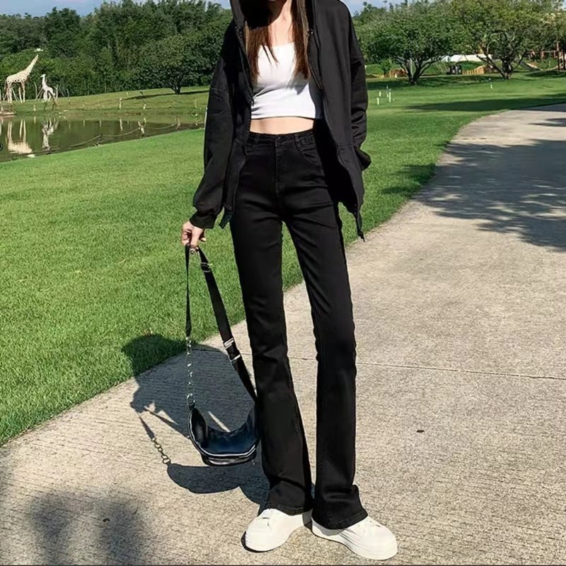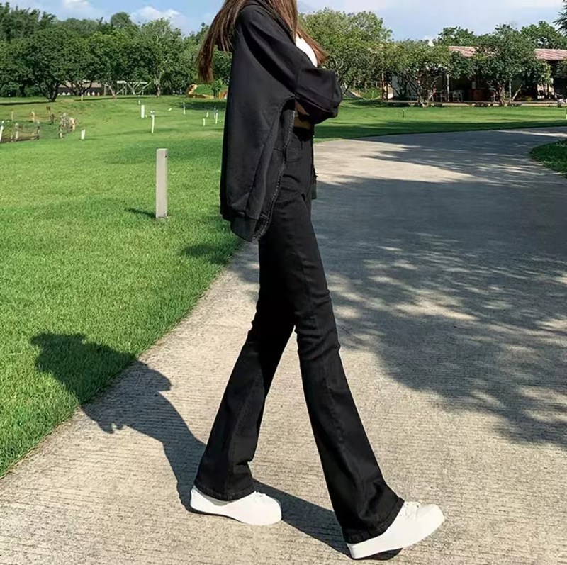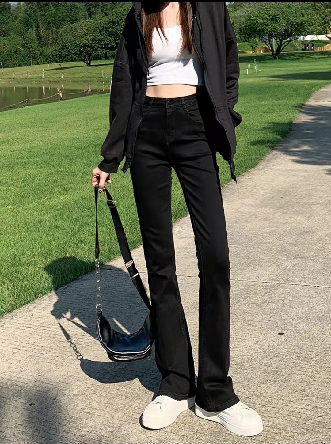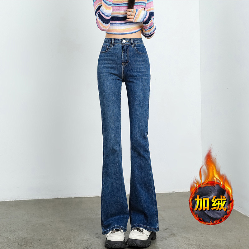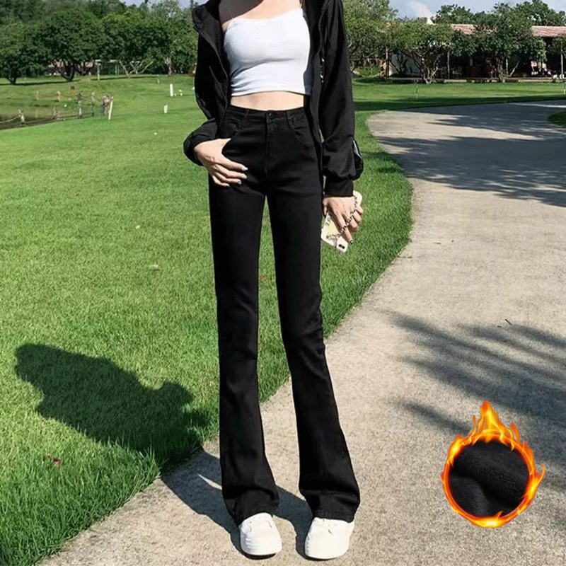 加绒牛仔裤女士马蹄微喇叭裤秋冬季2023新款高腰弹力阔腿黑色显瘦