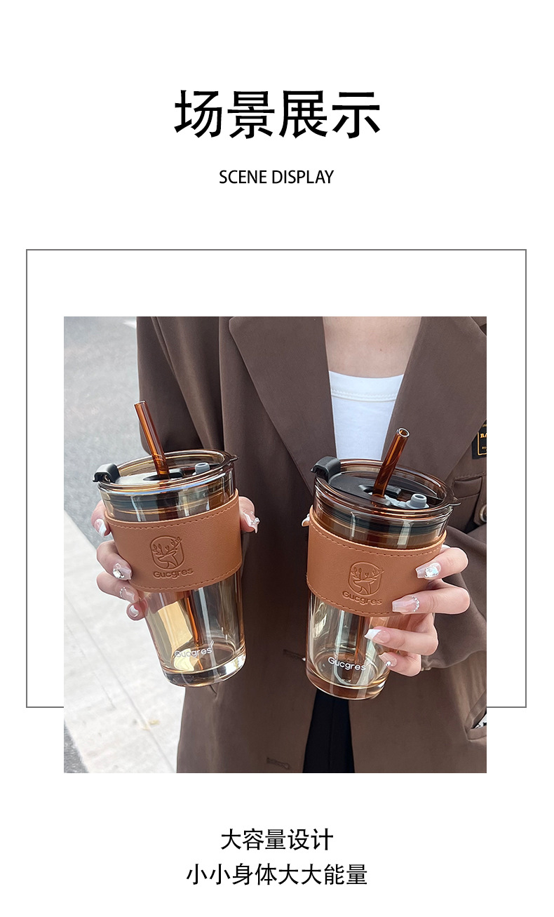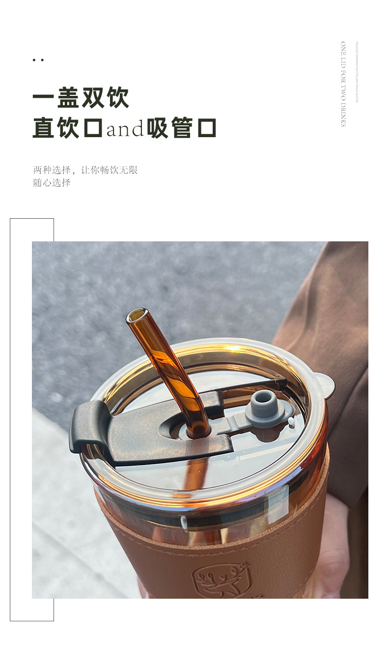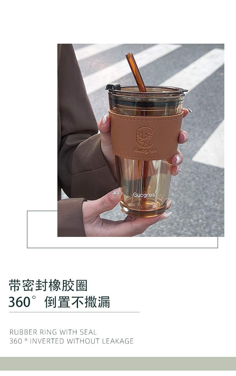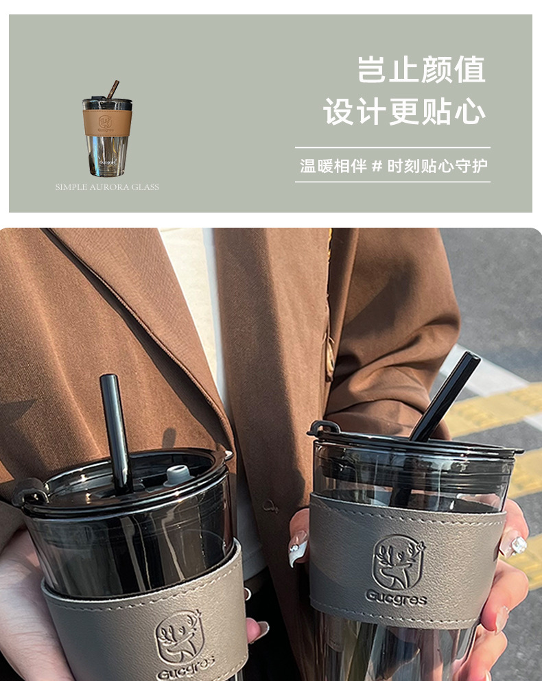 北极光玻璃杯带盖ins风真皮皮套吸管水杯早餐杯咖啡杯外贸批发