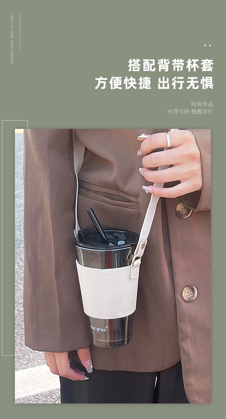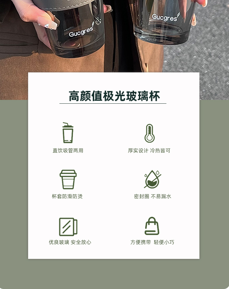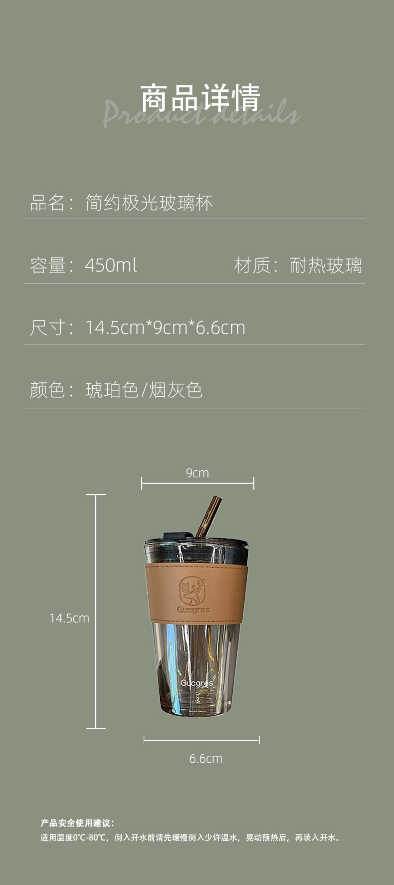 北极光玻璃杯带盖ins风真皮皮套吸管水杯早餐杯咖啡杯外贸批发