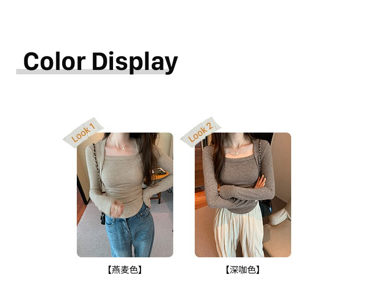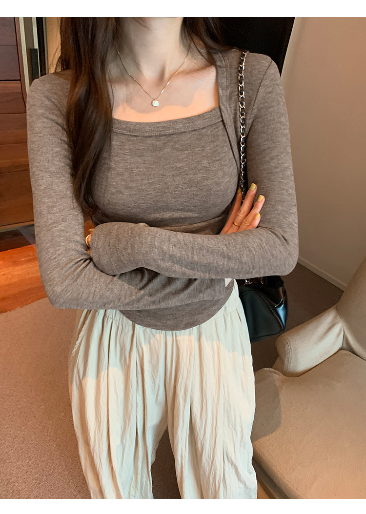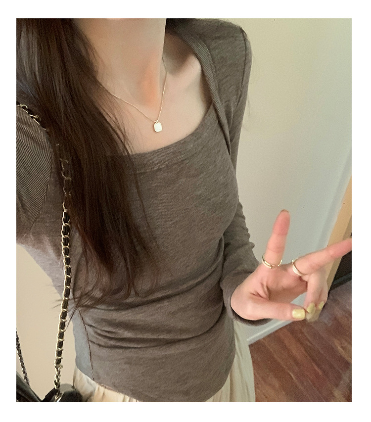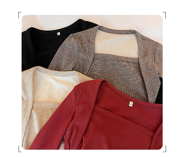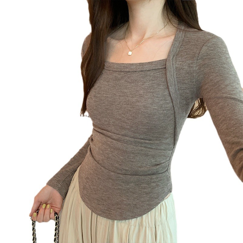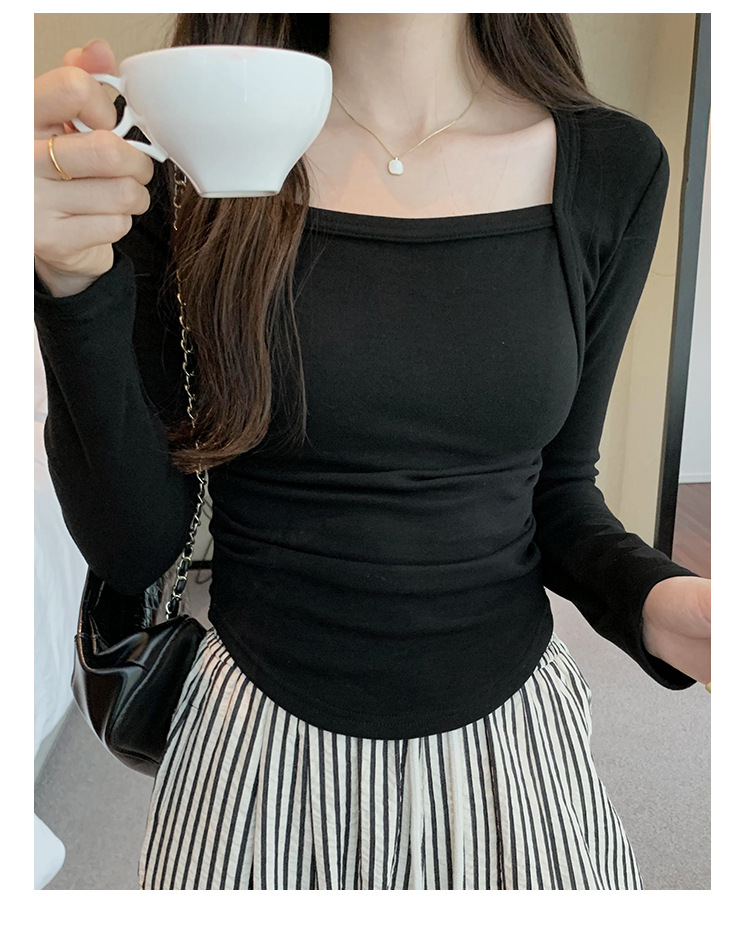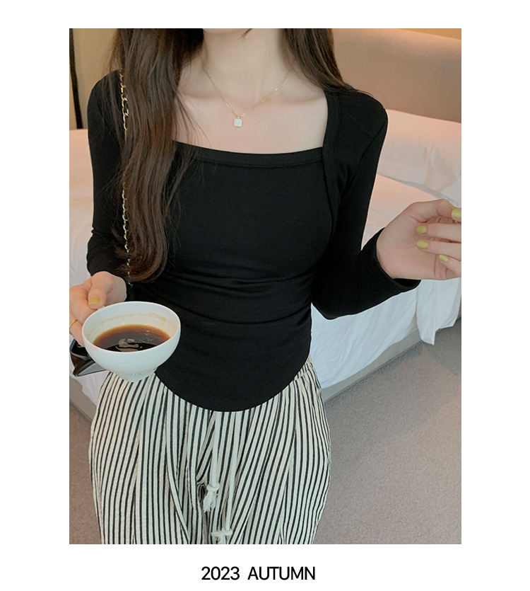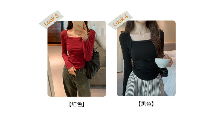 纯欲甜辣妹不规则方领加绒t恤女长袖秋冬内搭打底衫修身短款上衣