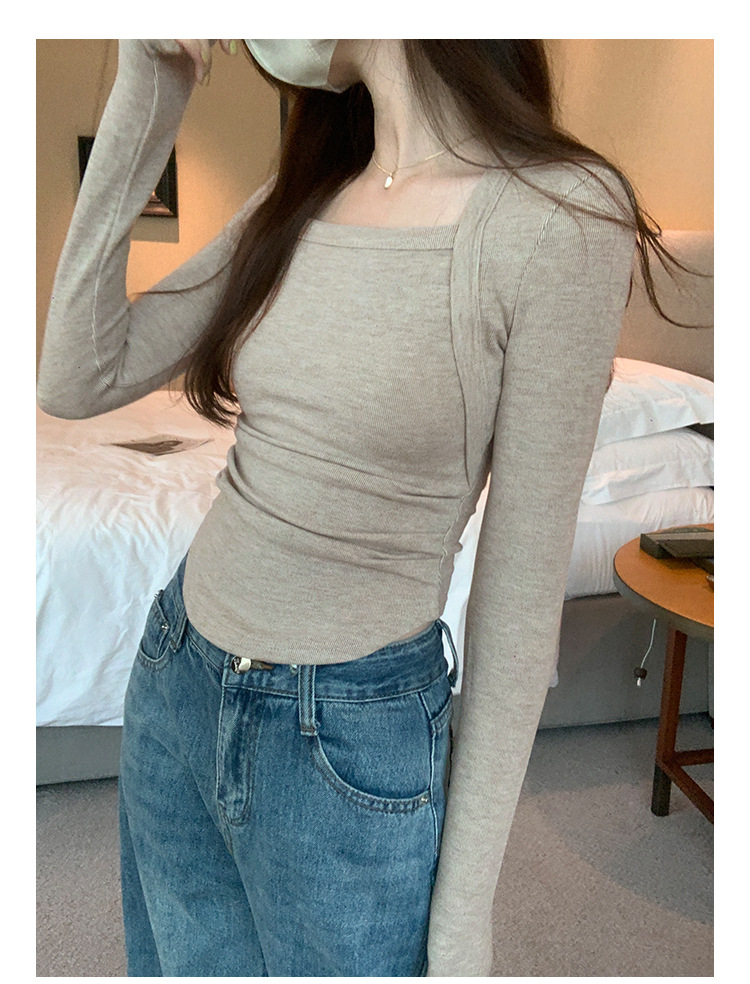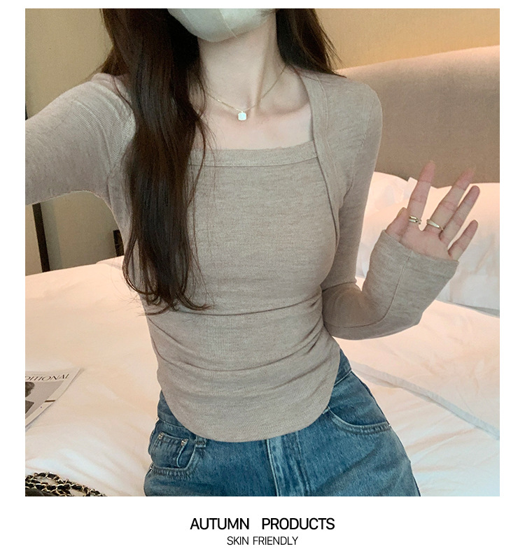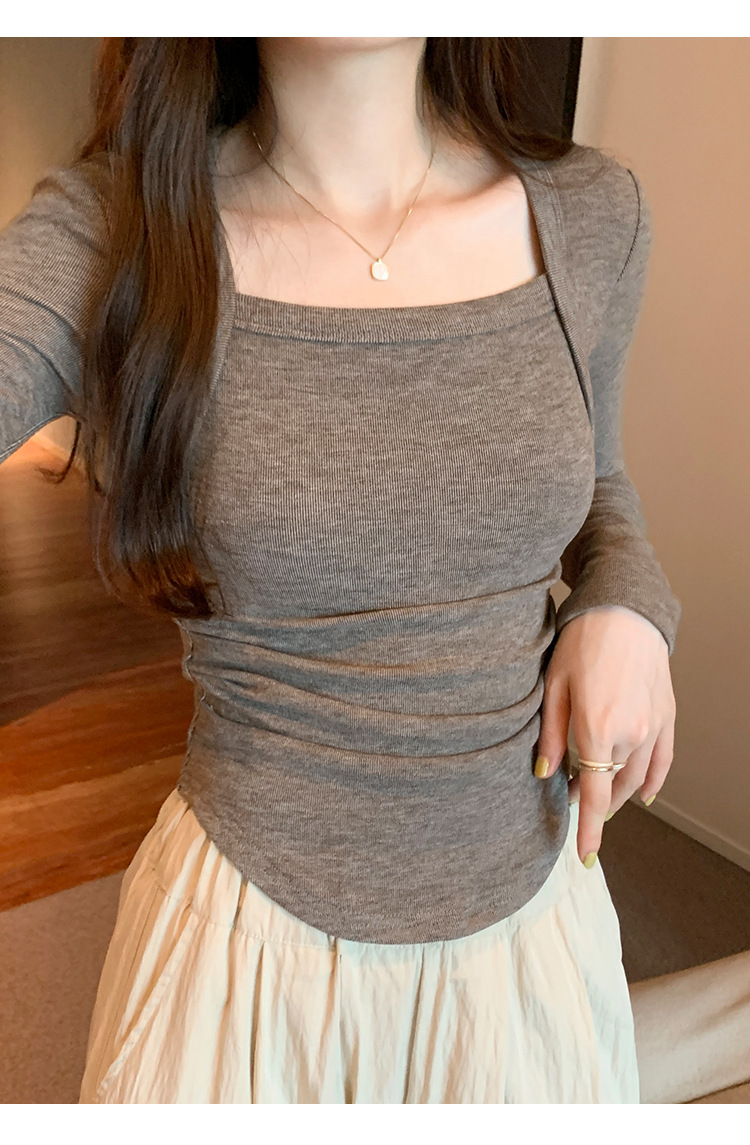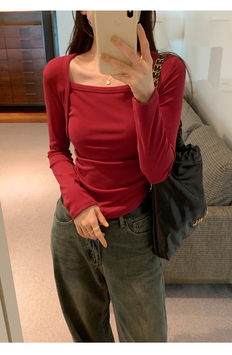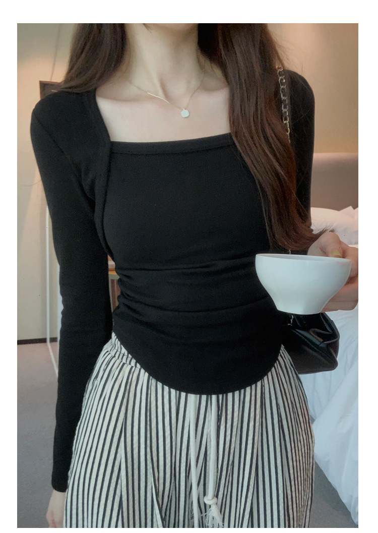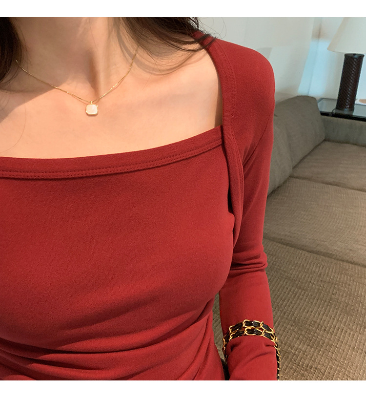 纯欲甜辣妹不规则方领加绒t恤女长袖秋冬内搭打底衫修身短款上衣