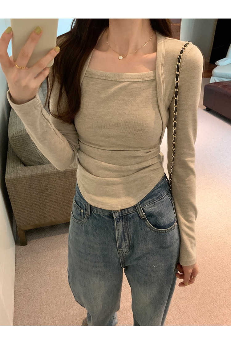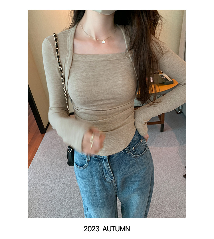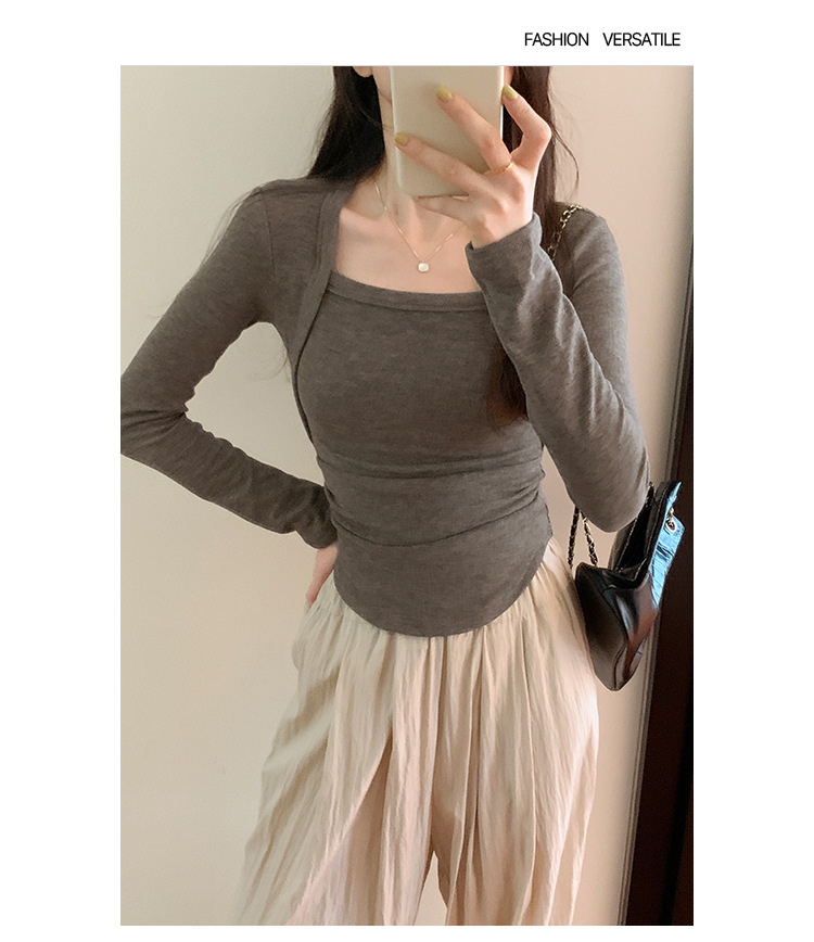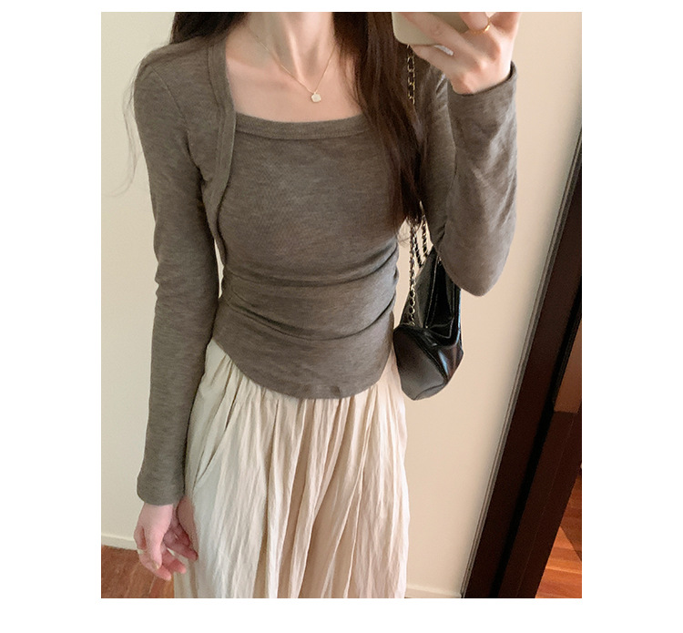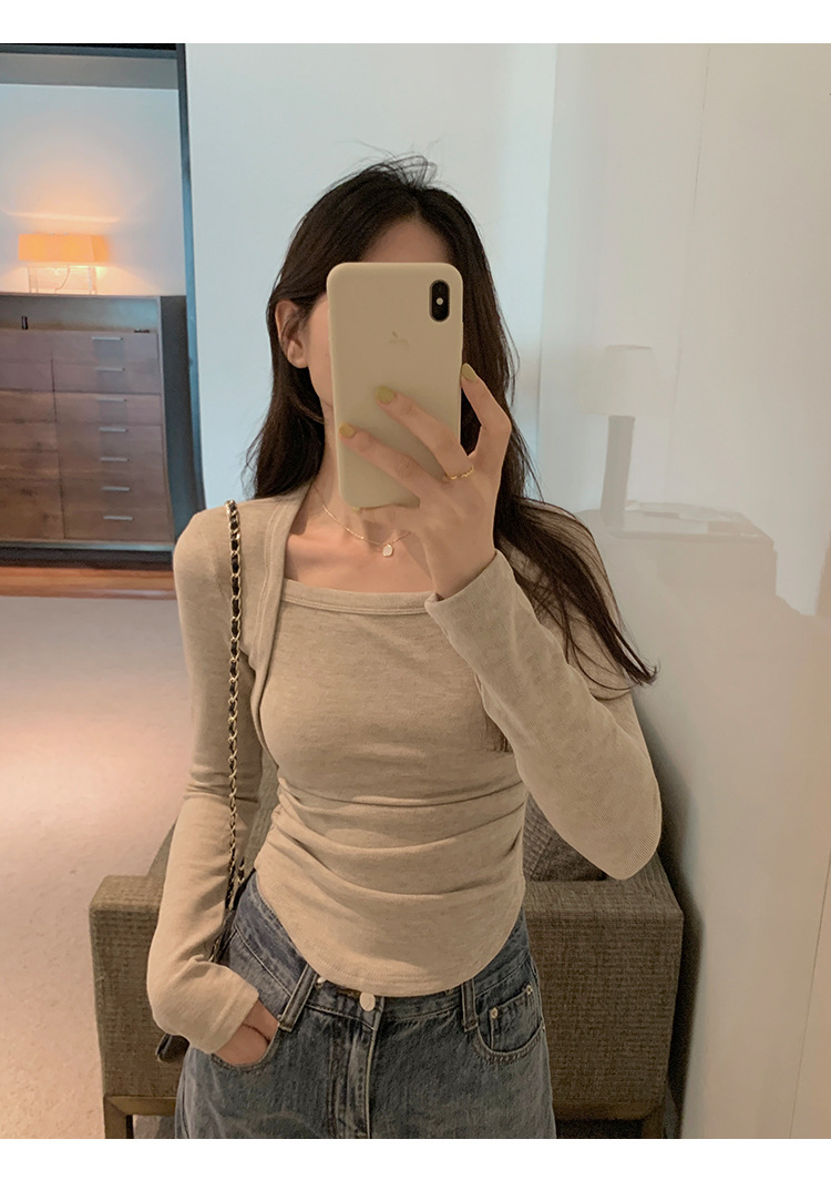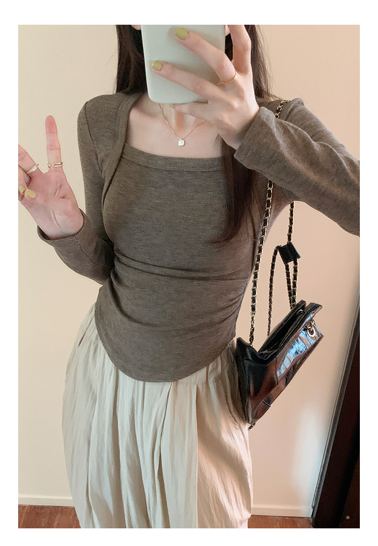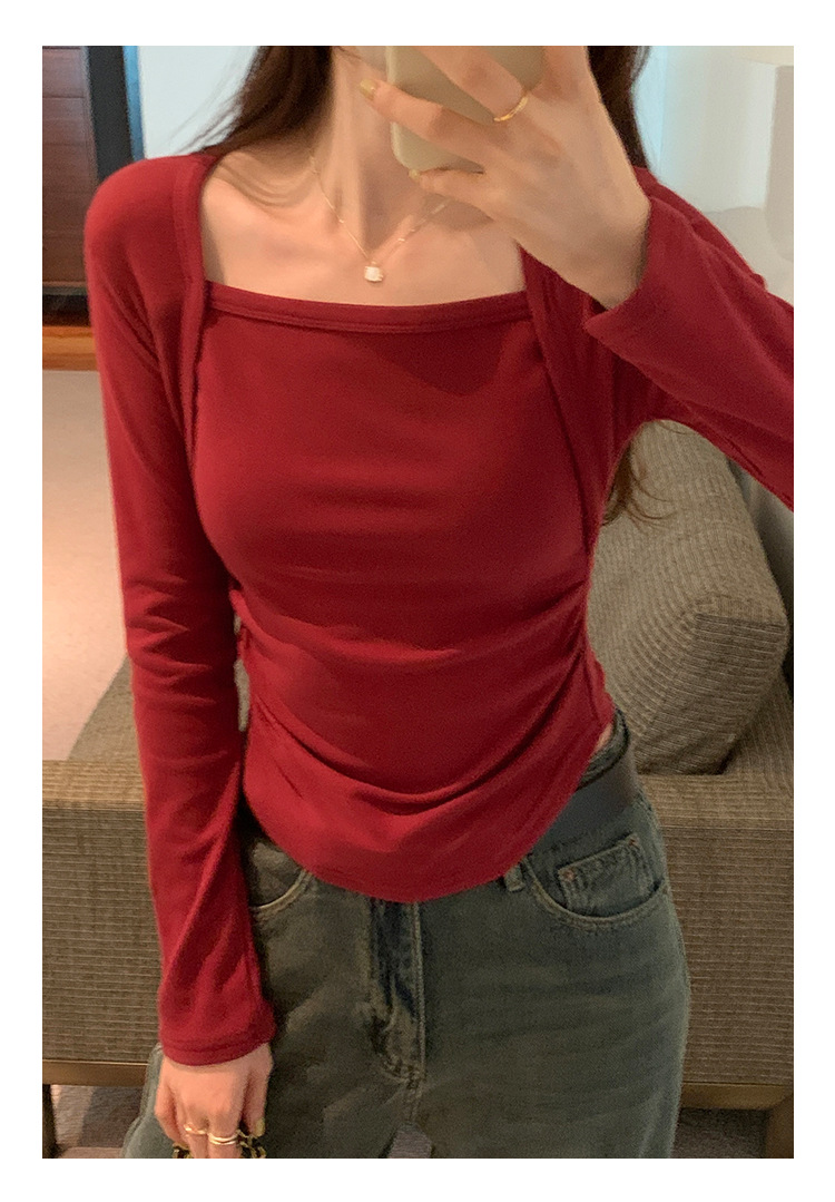 纯欲甜辣妹不规则方领加绒t恤女长袖秋冬内搭打底衫修身短款上衣