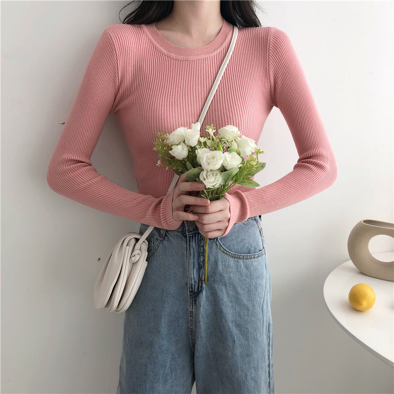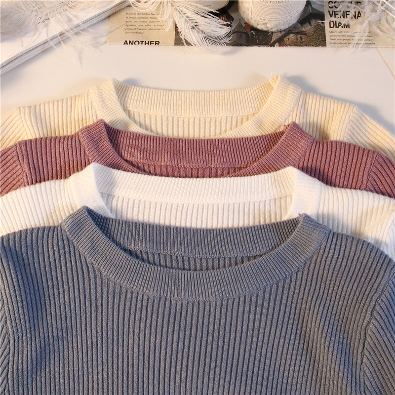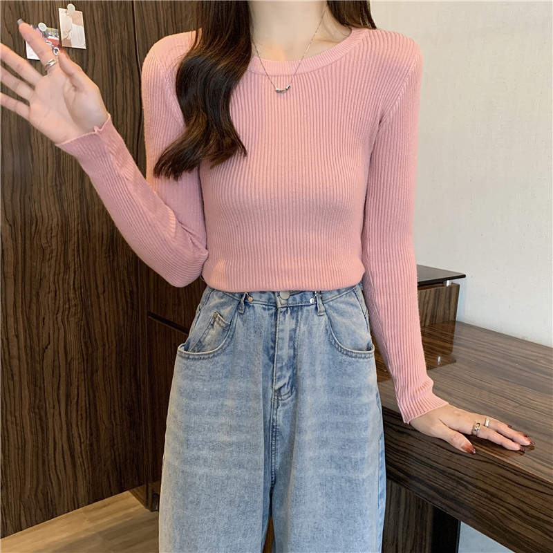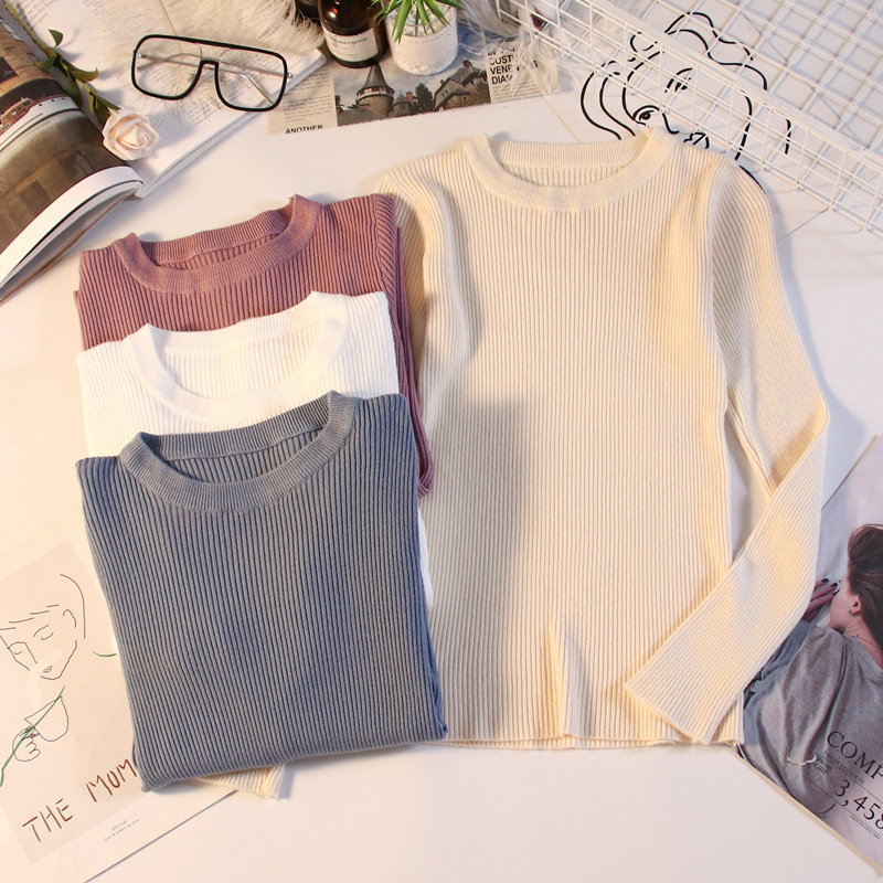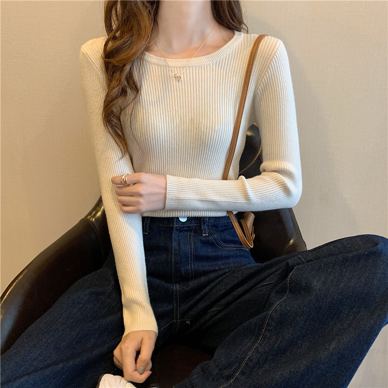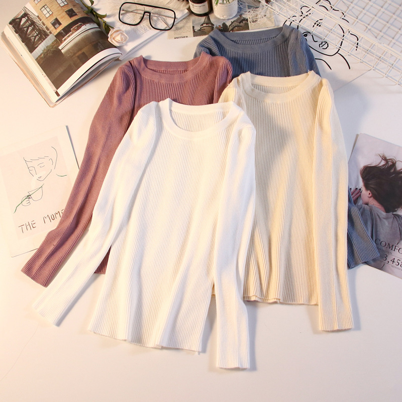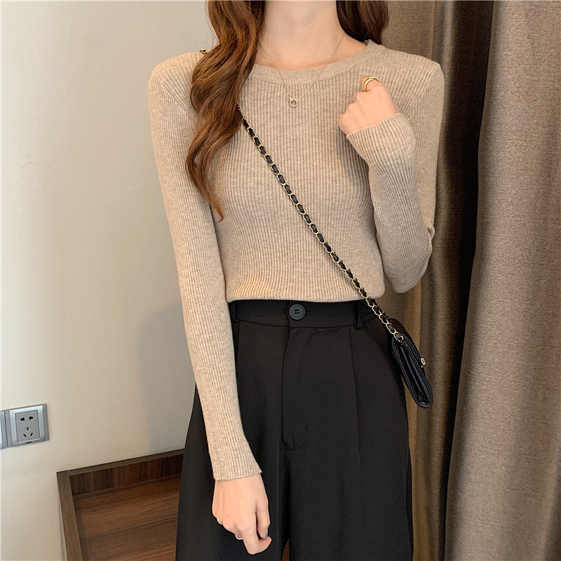 秋冬爆款毛衣内搭打底衫女螺纹圆领设计时尚洋气长袖针织衫女上衣