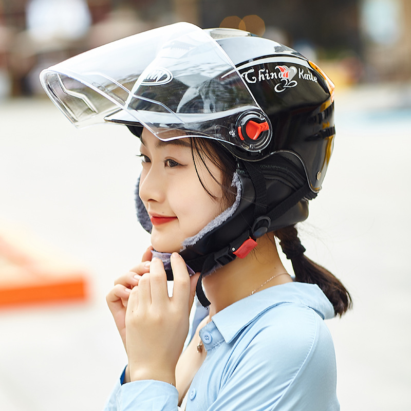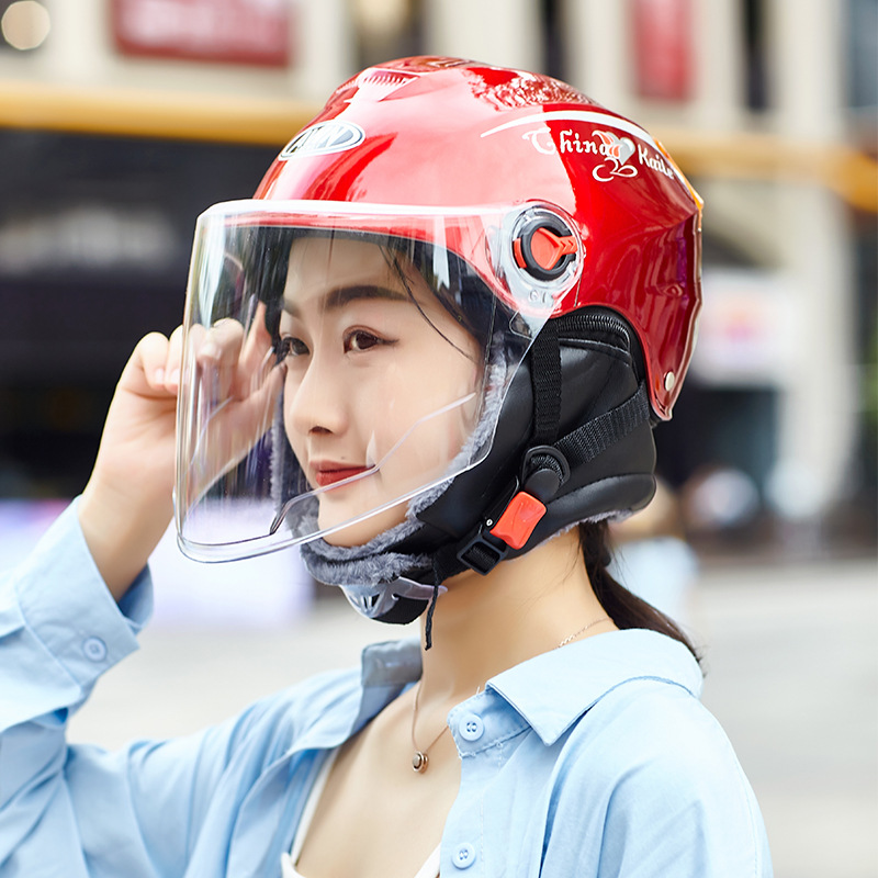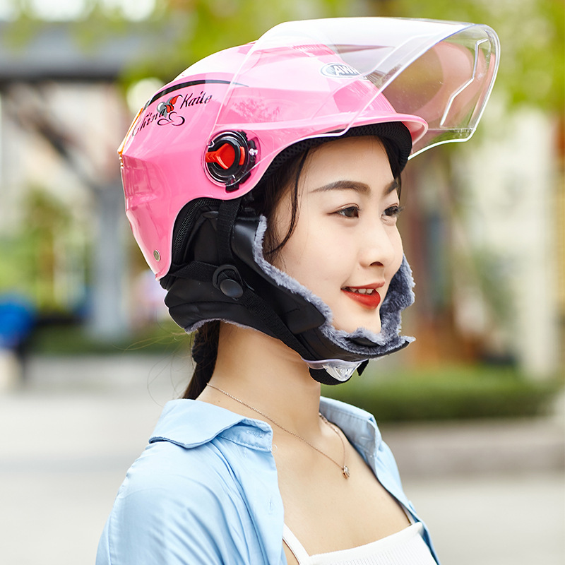 跨境专卖摩托电动车头盔男女士冬季电瓶车半盔带围脖保暖冬盔批发