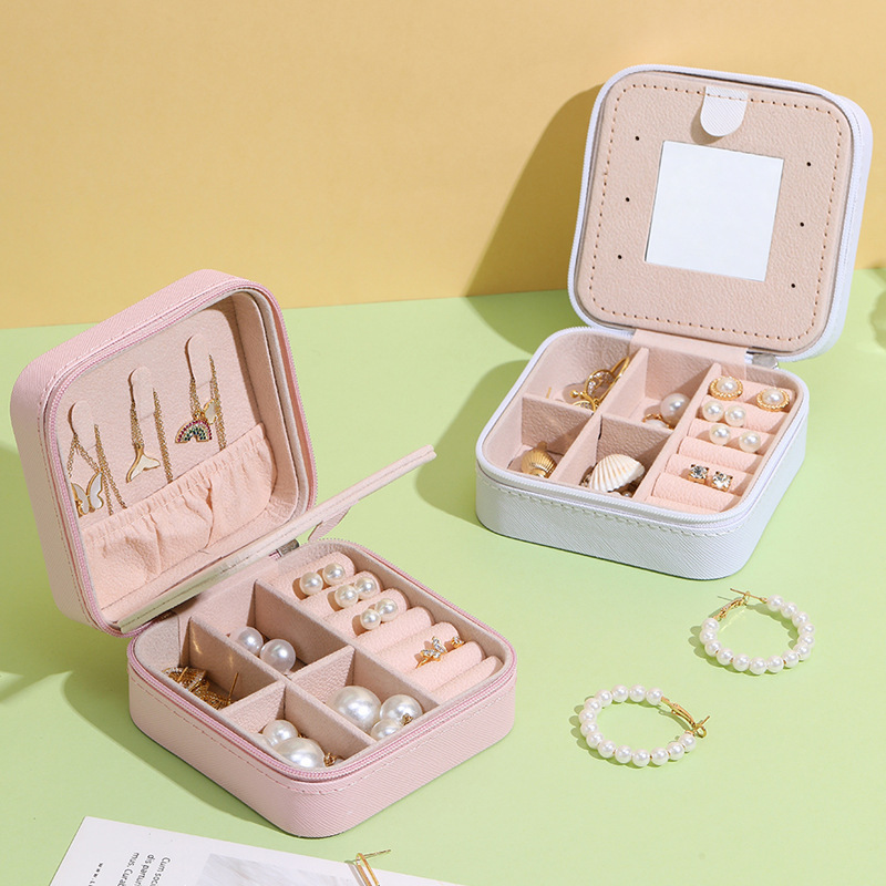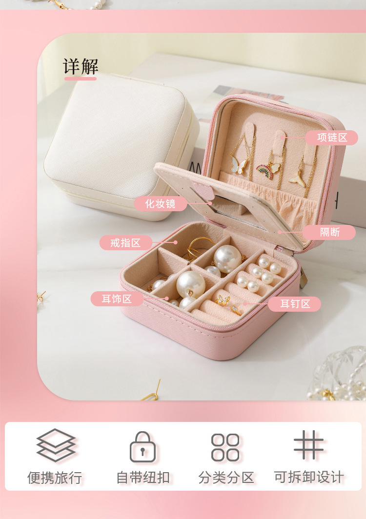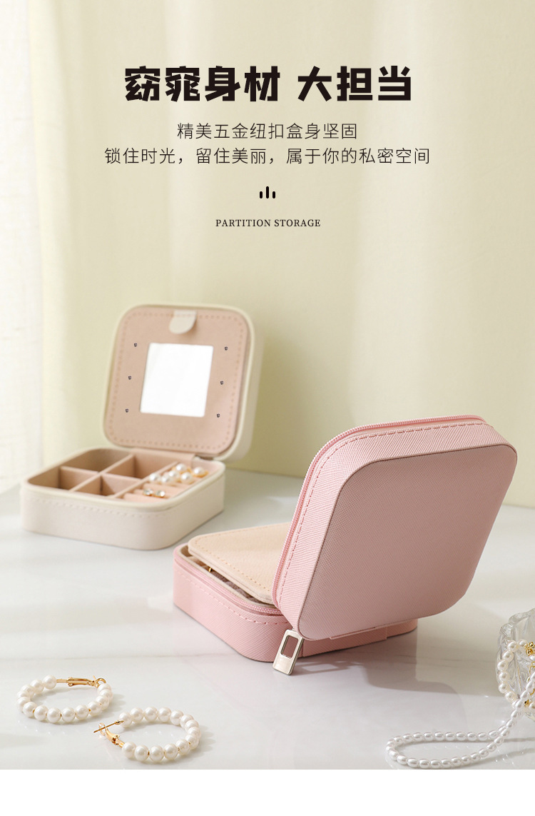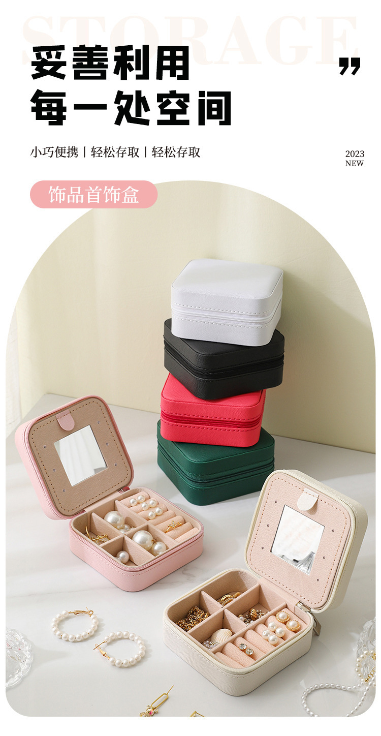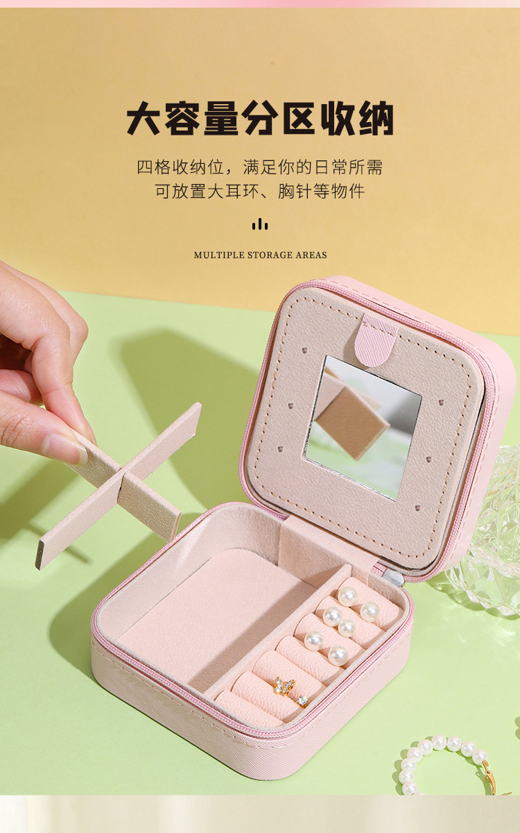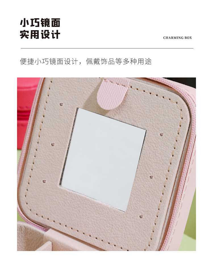 简约高档十字纹镜子收纳耳钉项链分格收纳盒子便携式珠宝首饰盒