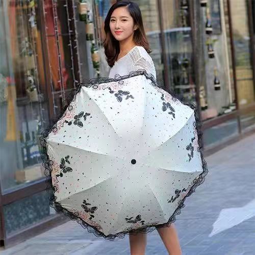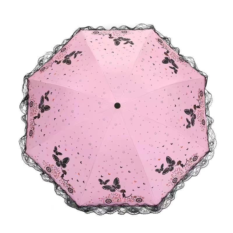 蝴蝶蕾丝印花遮阳伞晴雨两用伞三折抗风防晒黑胶伞厂家直销