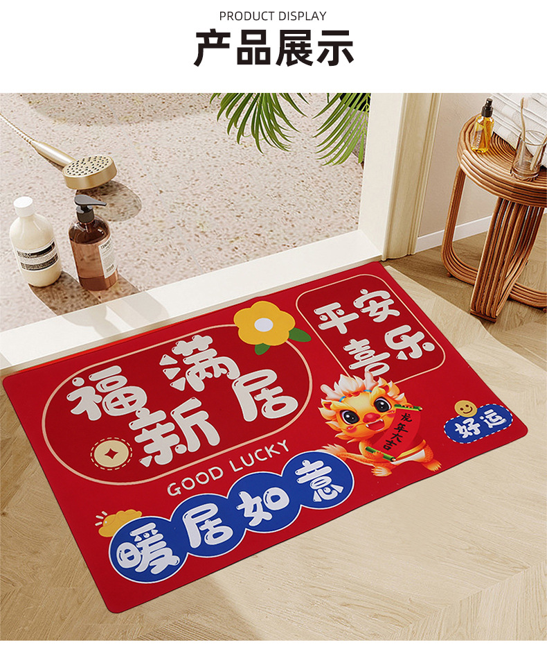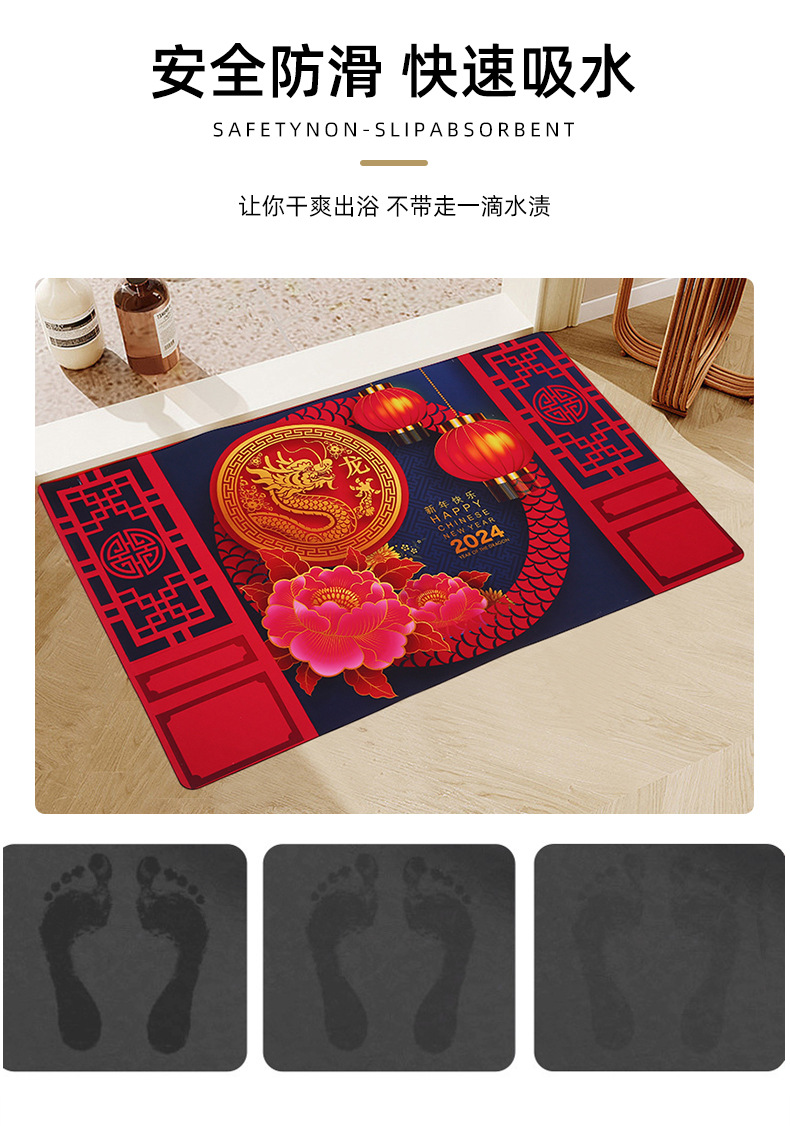 新年国潮龙年红色喜庆硅藻泥地垫入户门水晶绒脚垫吸水防滑地毯