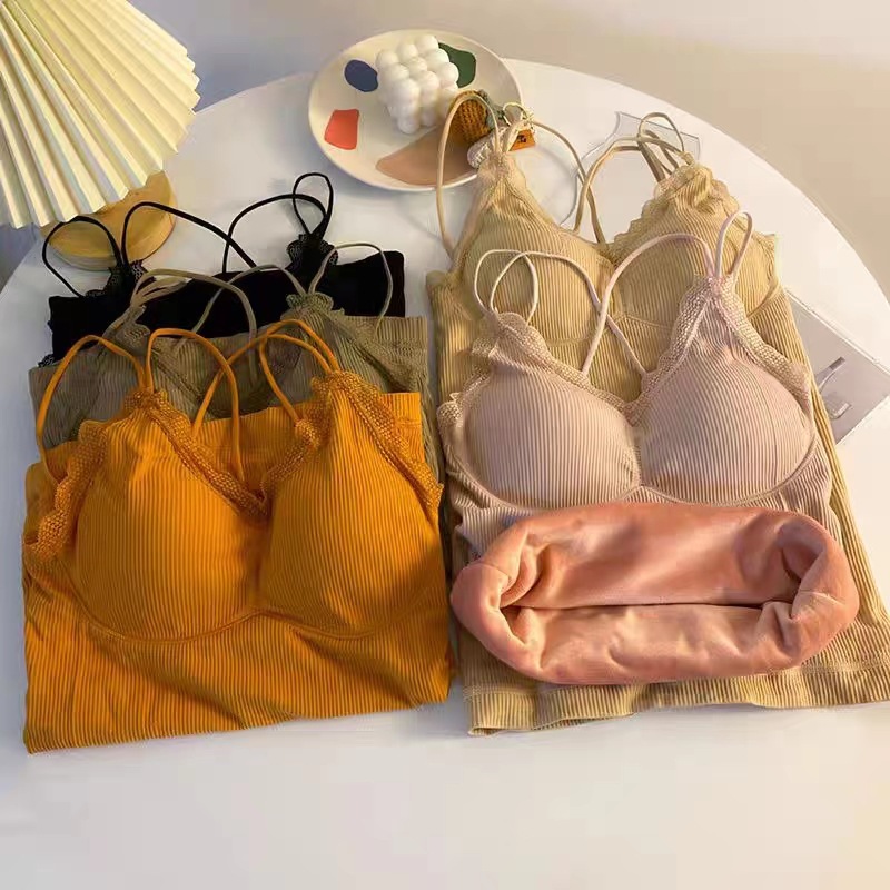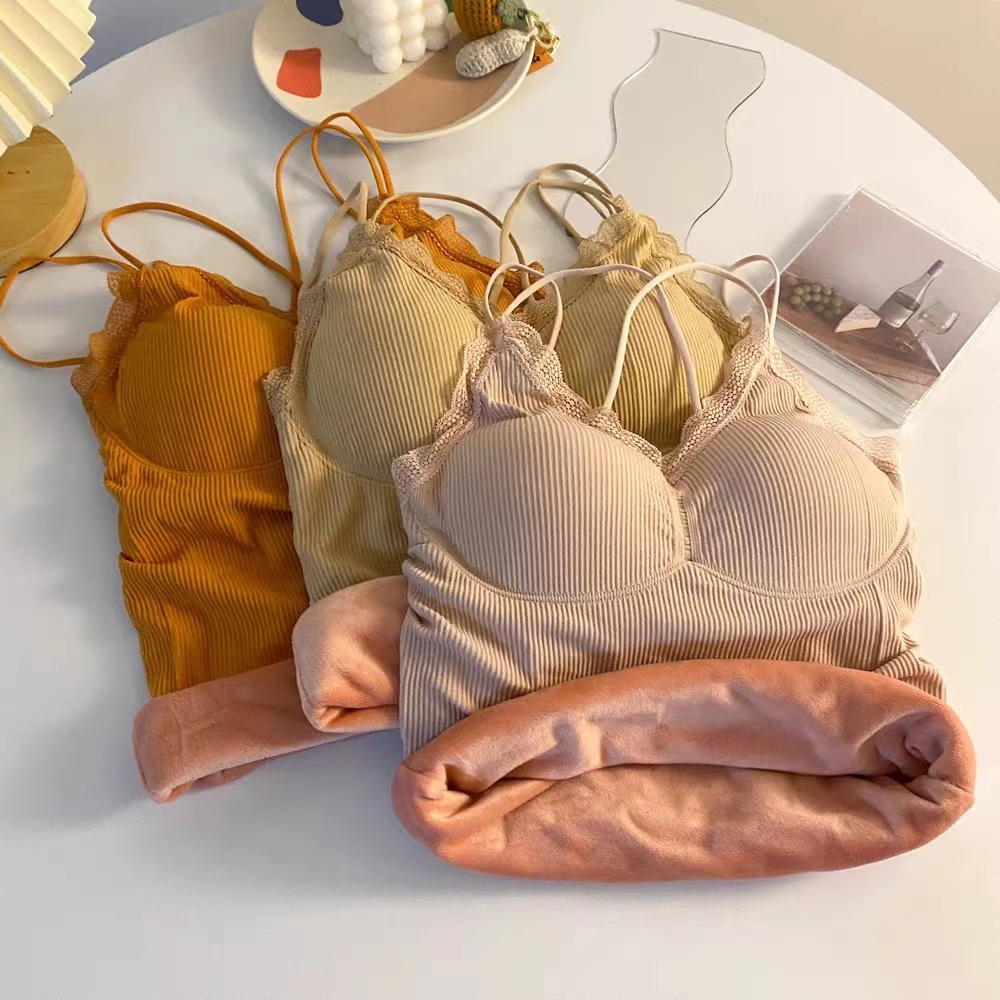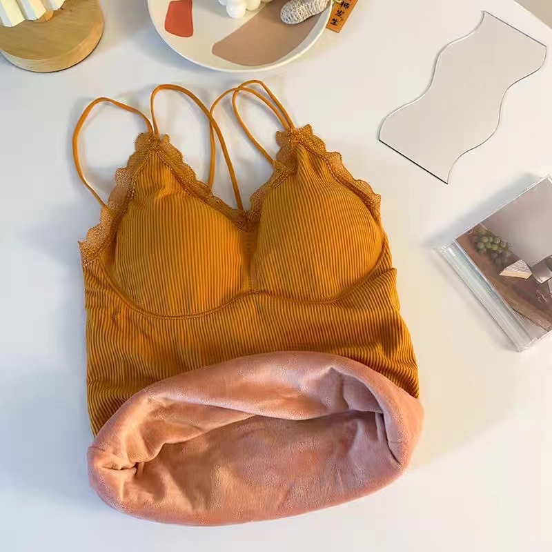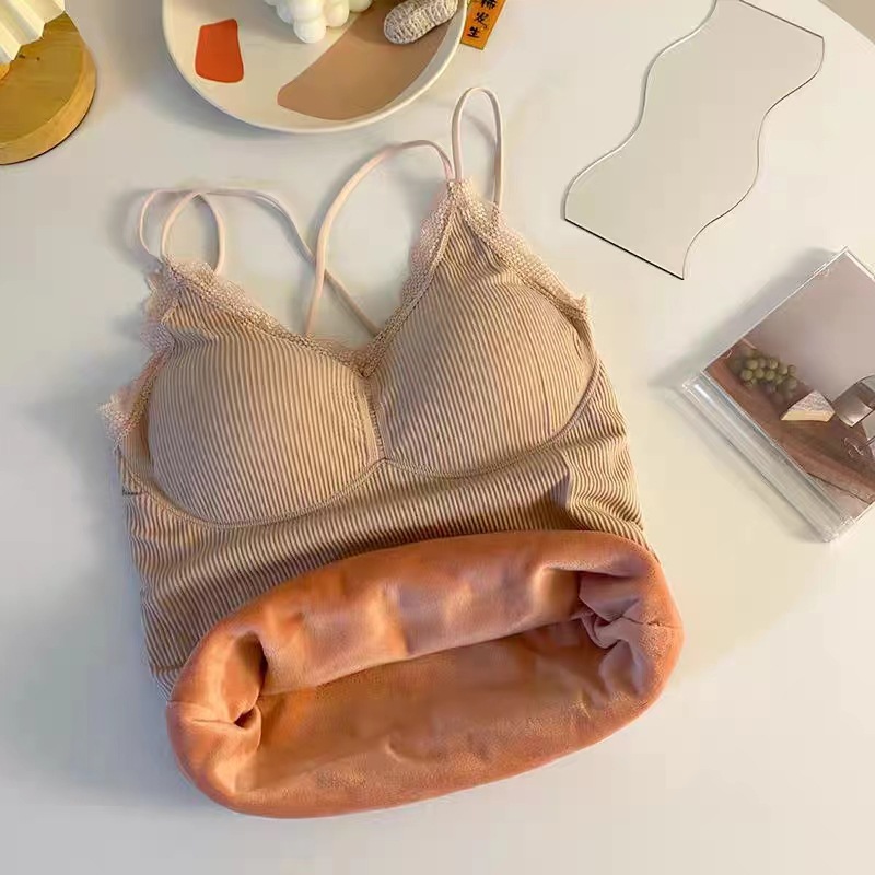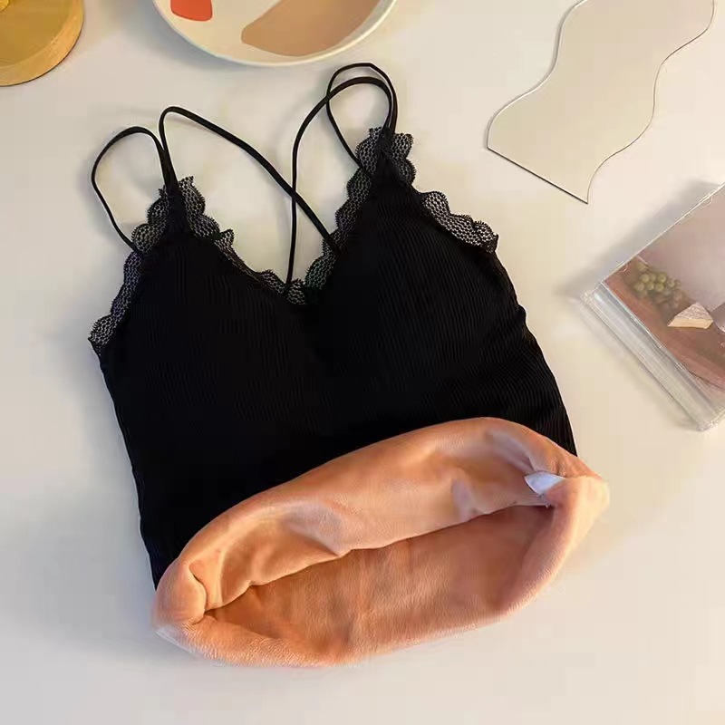 无缝V领蕾丝保暖内衣 细肩带交叉美背加绒加厚发热吊带保暖上衣女