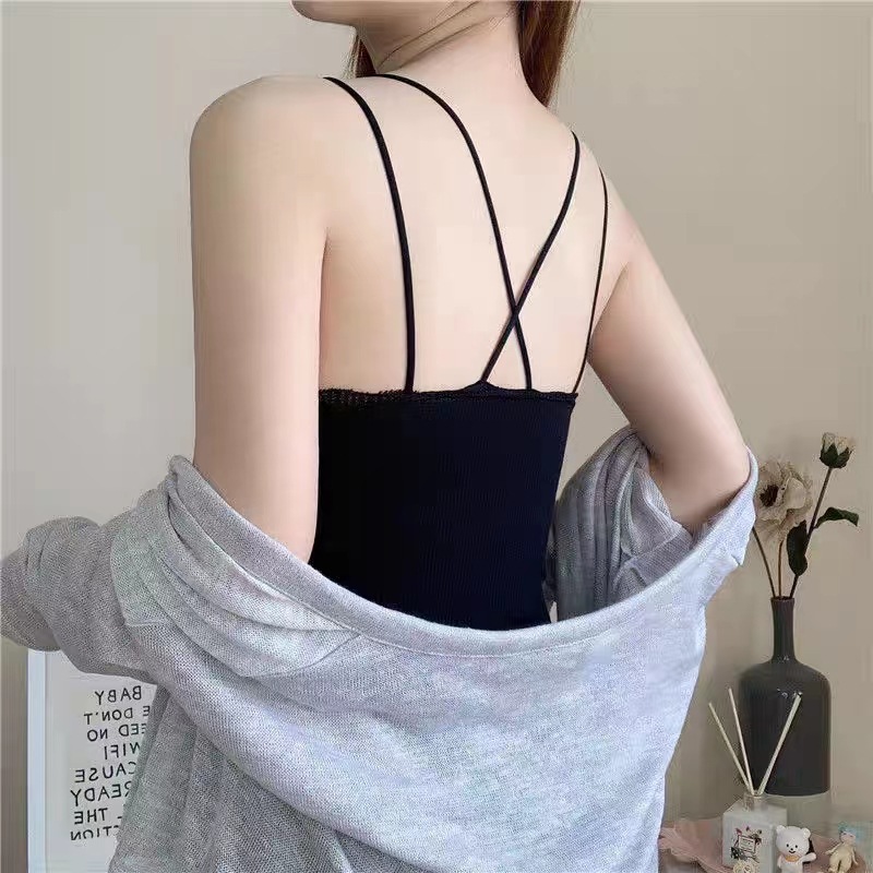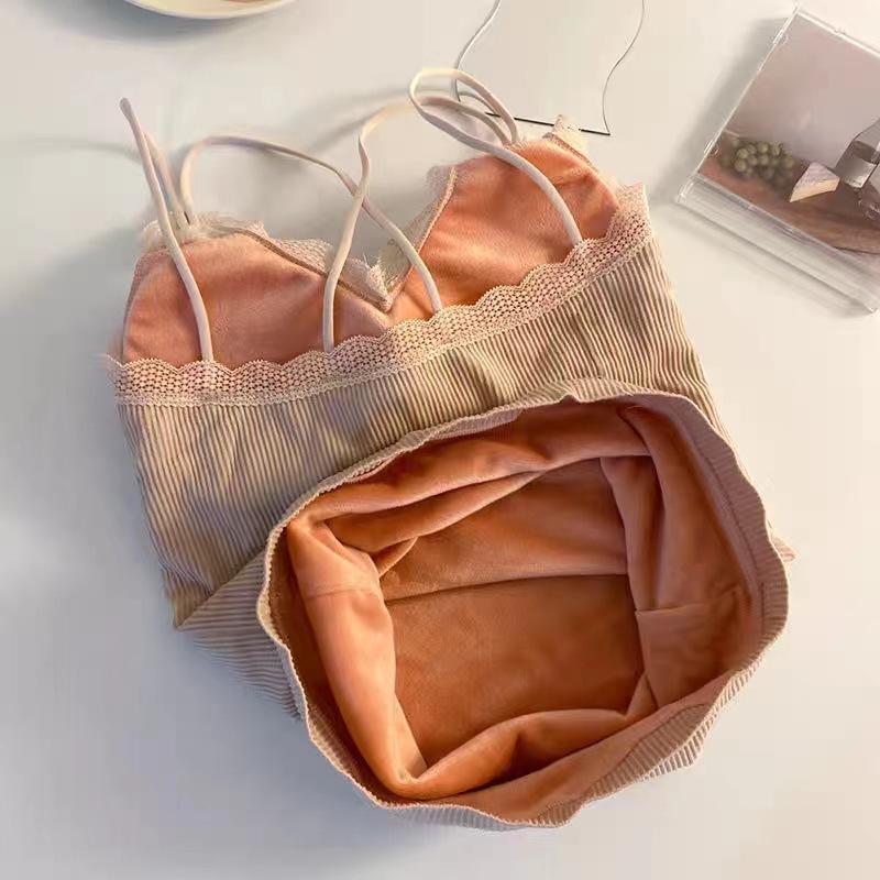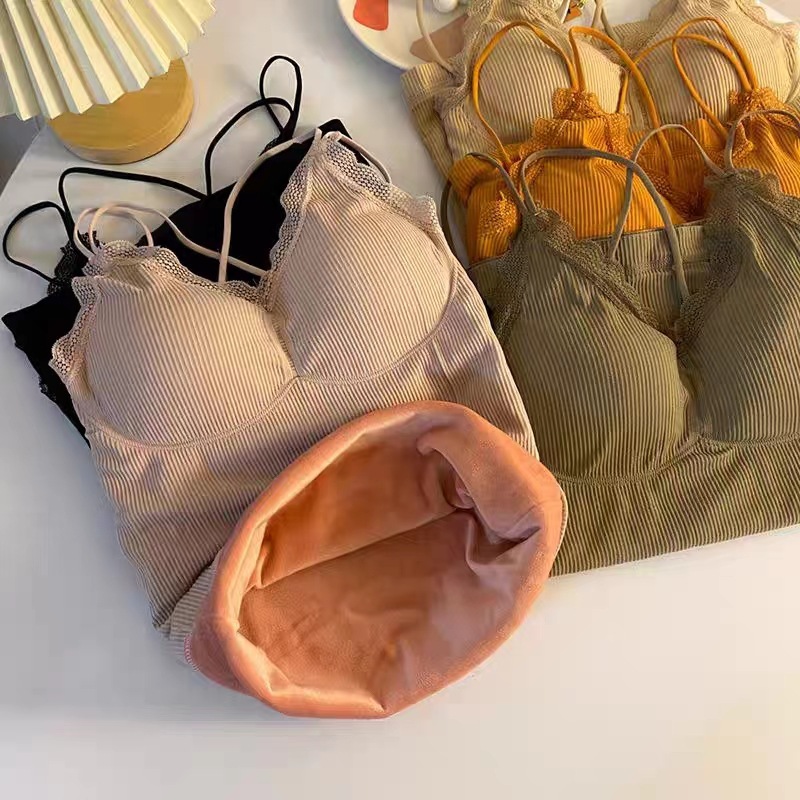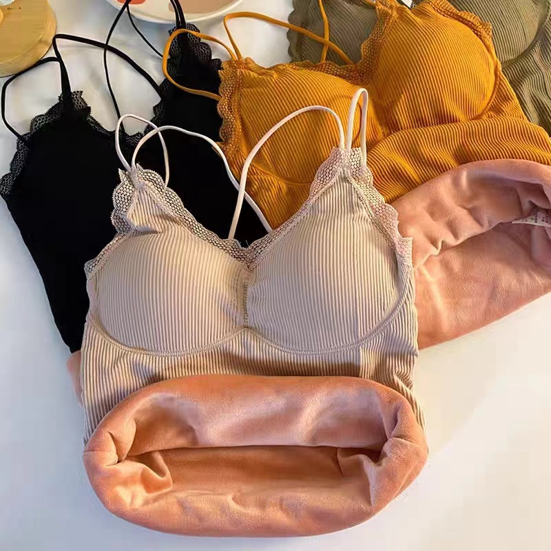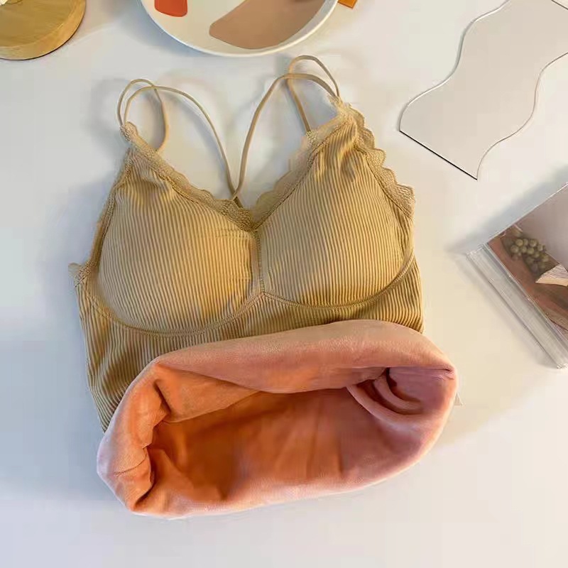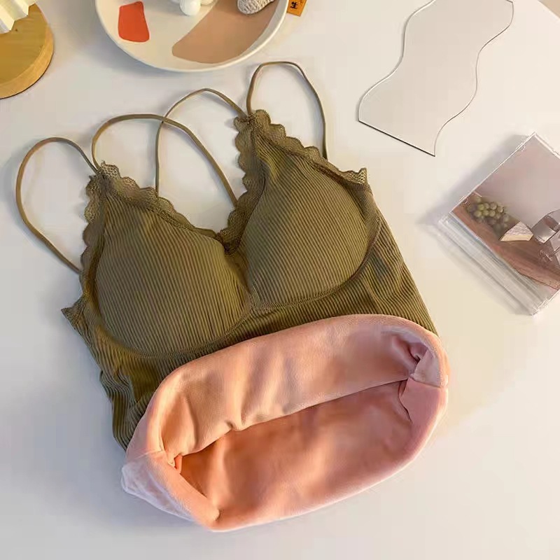 无缝V领蕾丝保暖内衣 细肩带交叉美背加绒加厚发热吊带保暖上衣女