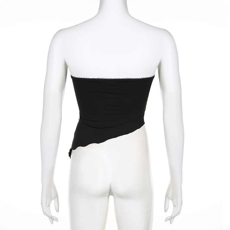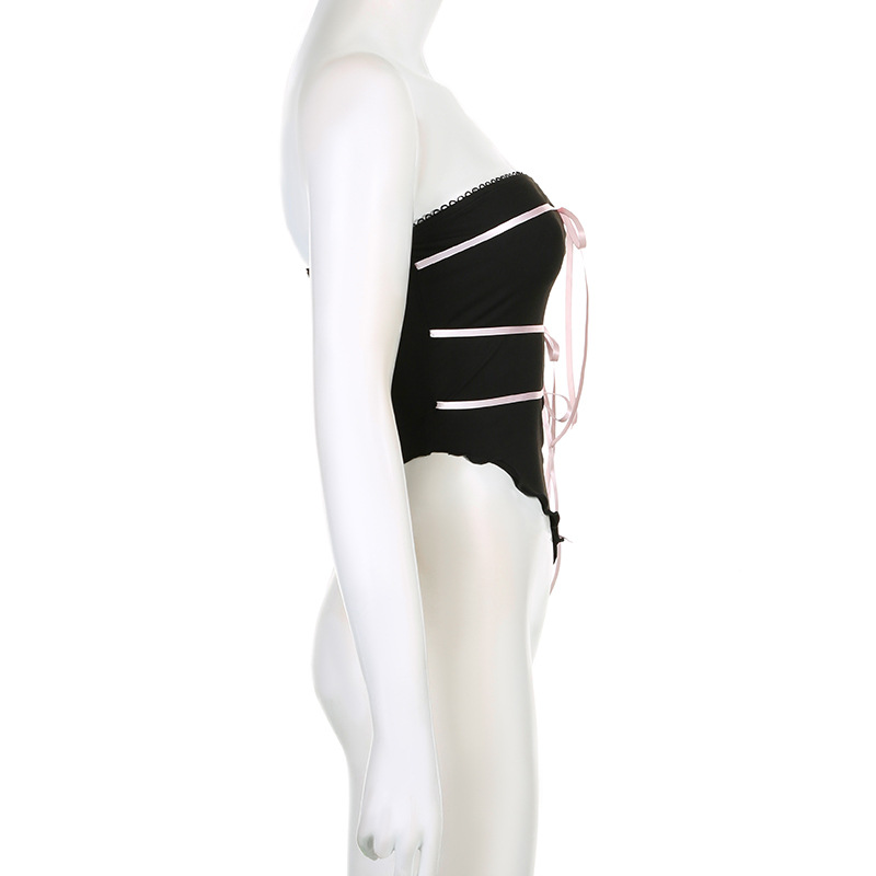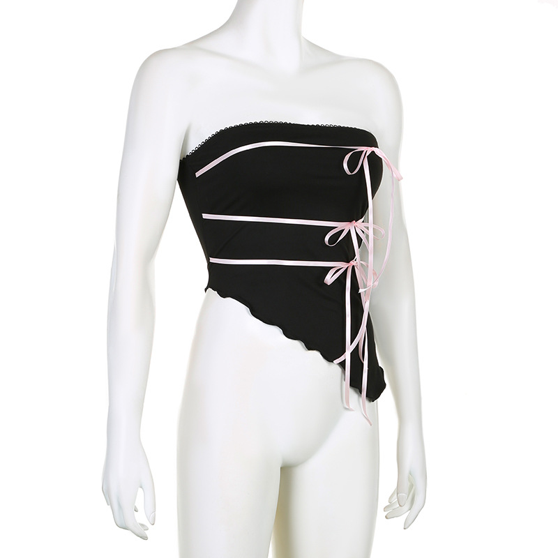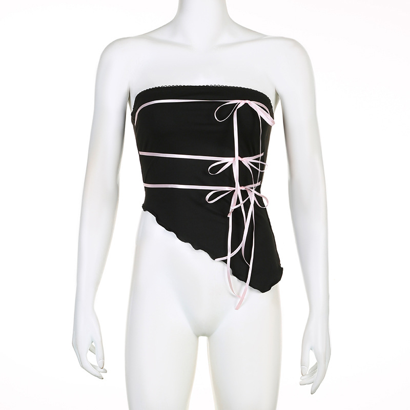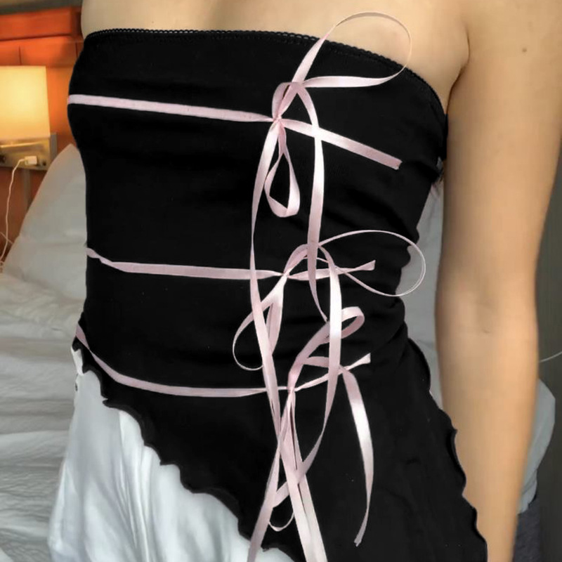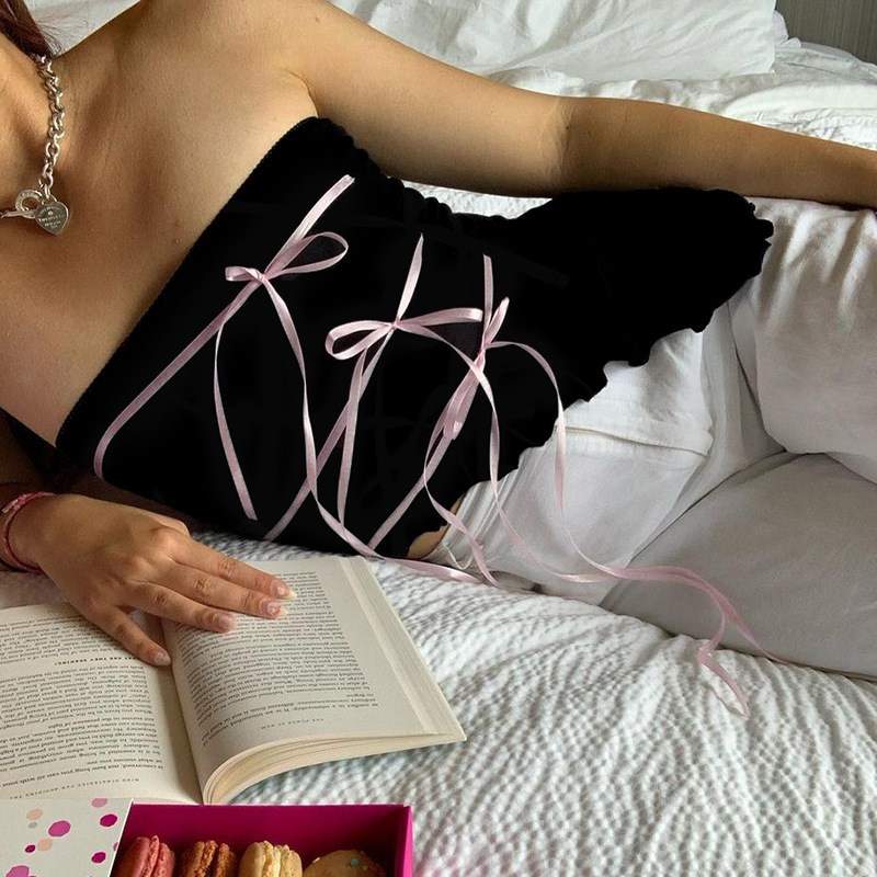 甜辣风性感一字肩美背缎面蝴蝶结系带斜边抹胸少女纯欲外穿款上衣