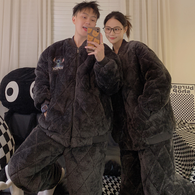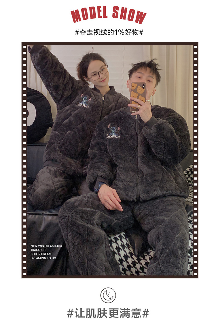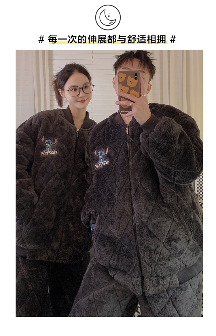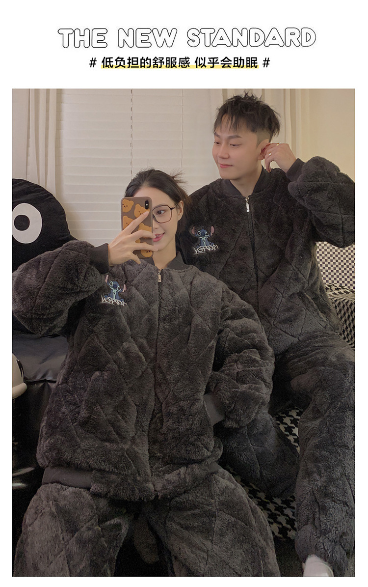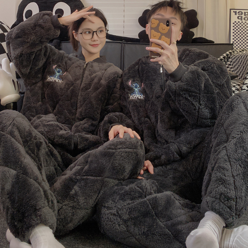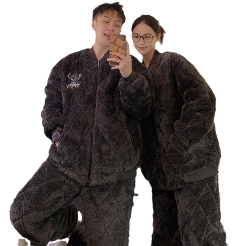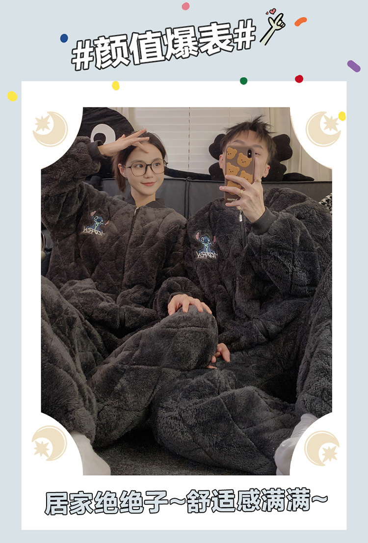 珊瑚绒情侣睡衣女秋冬季三层夹棉加绒加厚卡通ins男士家居服套装