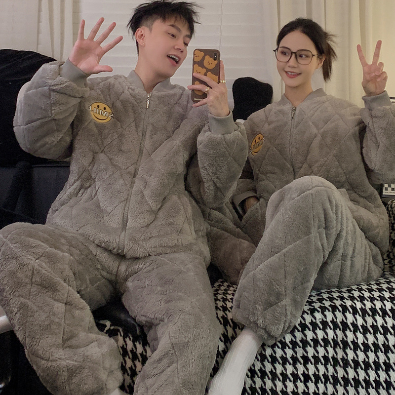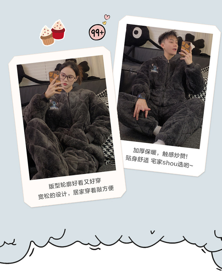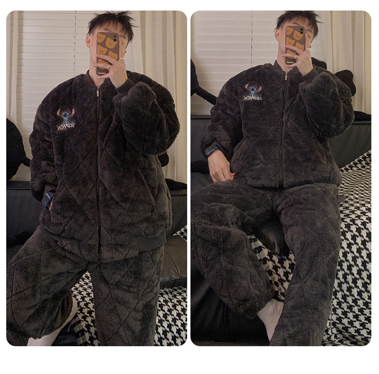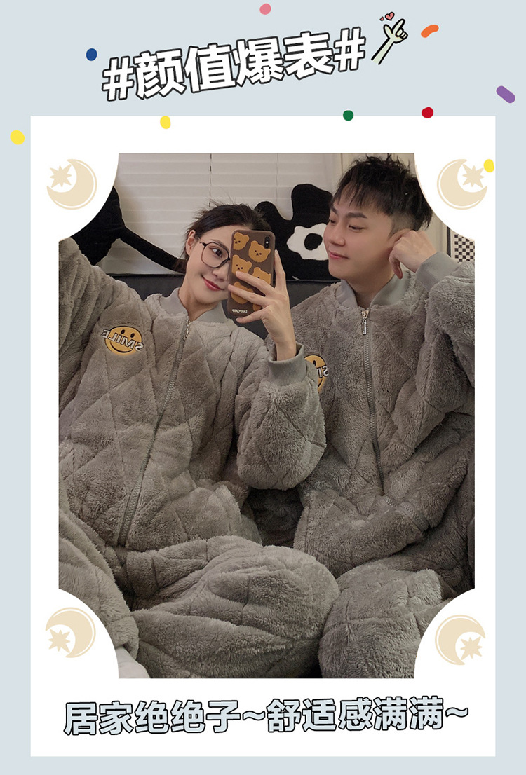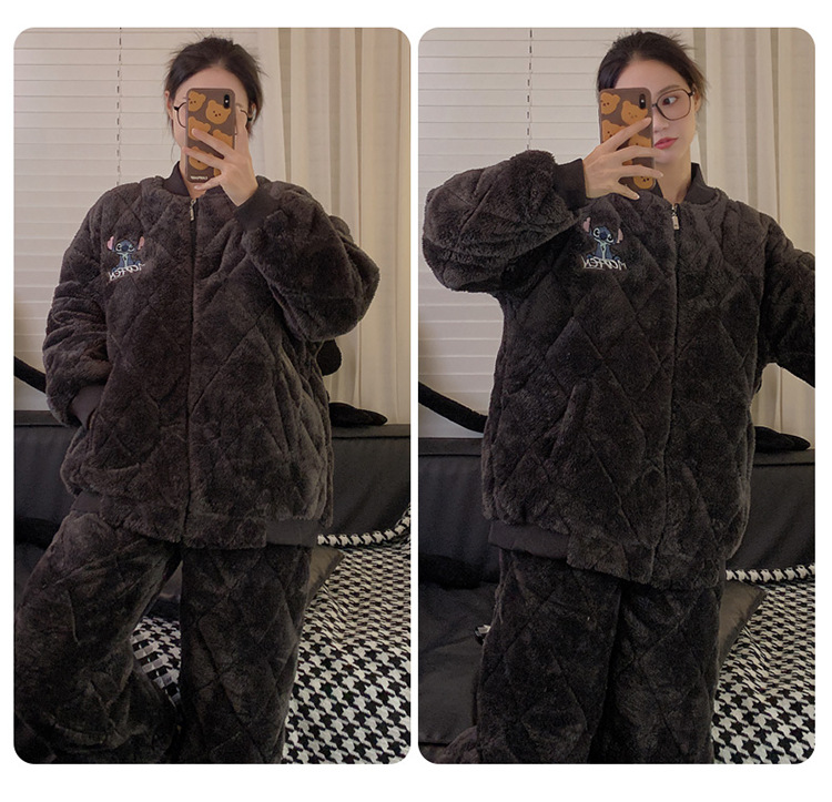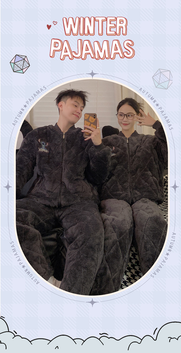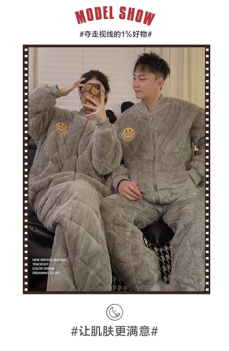 珊瑚绒情侣睡衣女秋冬季三层夹棉加绒加厚卡通ins男士家居服套装