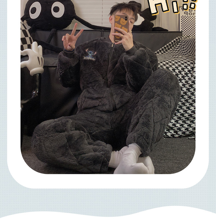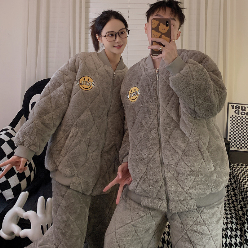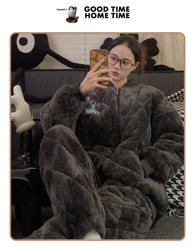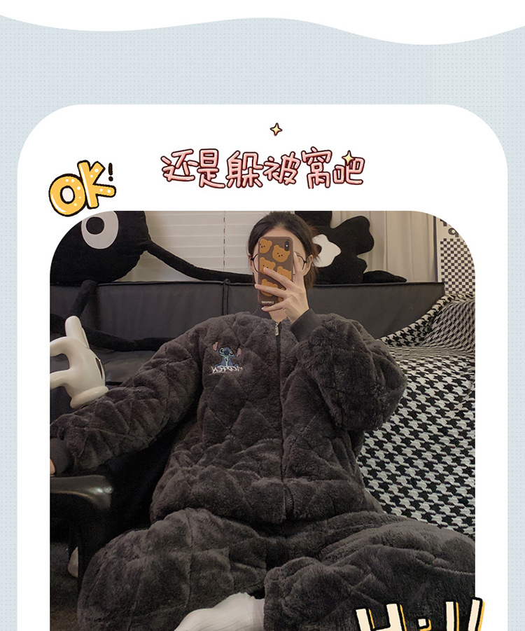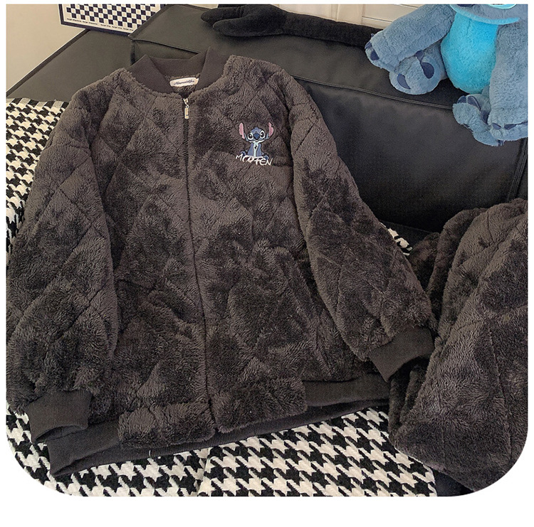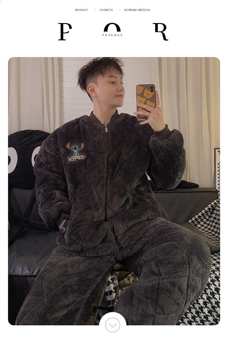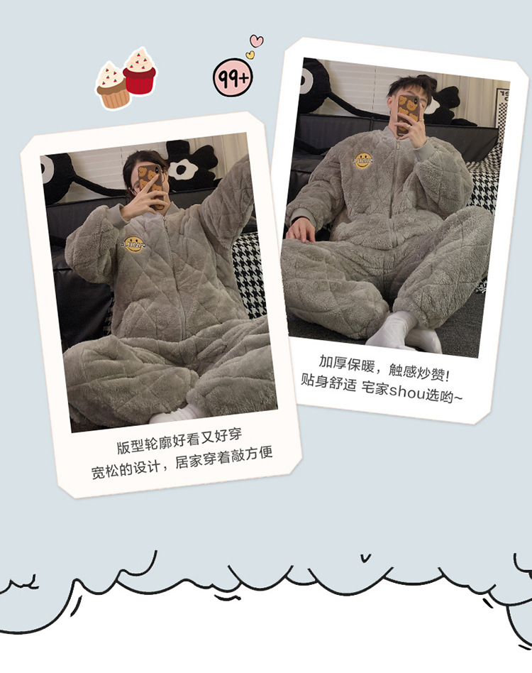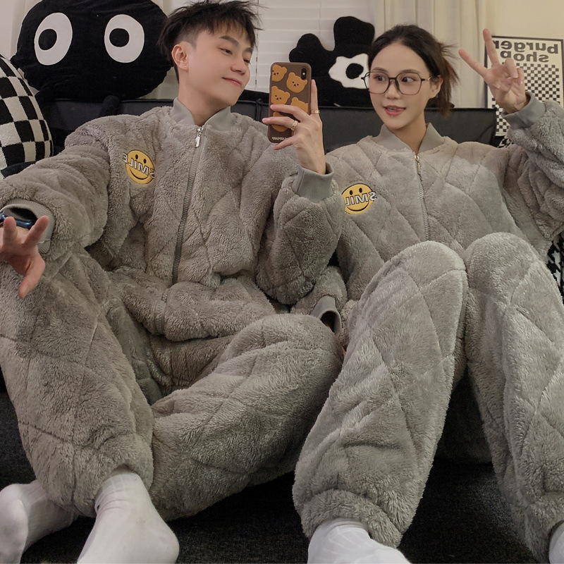 珊瑚绒情侣睡衣女秋冬季三层夹棉加绒加厚卡通ins男士家居服套装