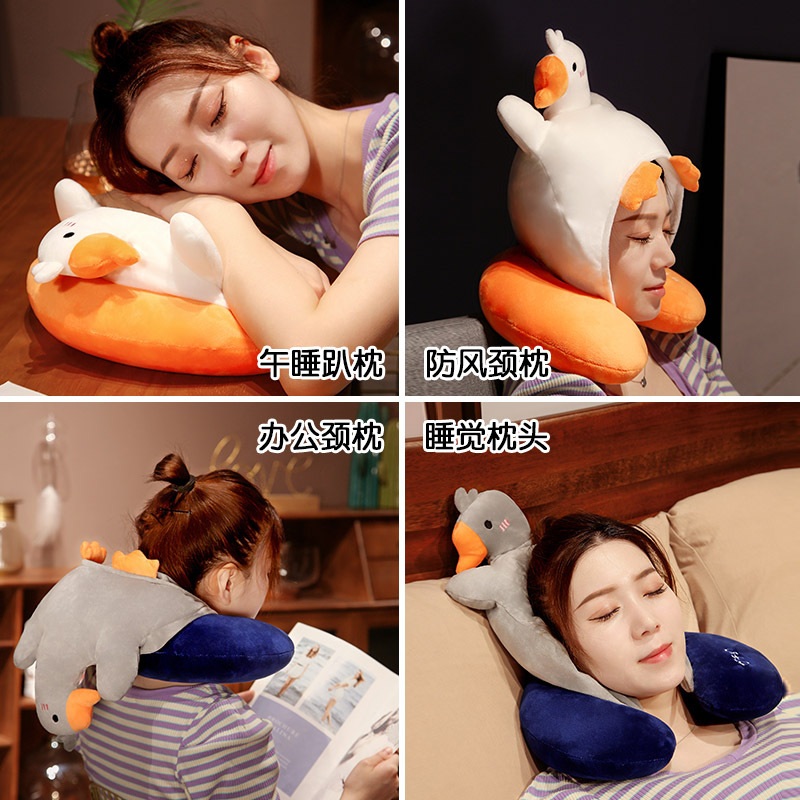 小白鹅带帽U枕夏季连帽二合一枕头办公室学生遮光午睡趴趴枕批发