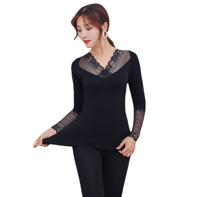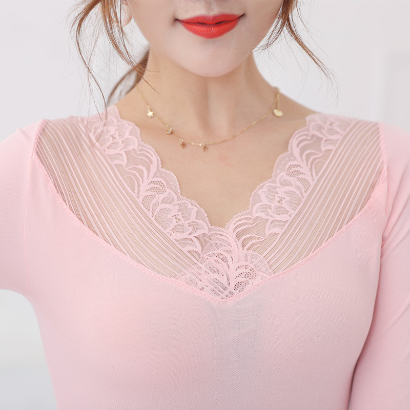 厂货通 蕾丝交叉V领纯棉秋衣秋裤套装女薄款显瘦美体内搭保暖内衣