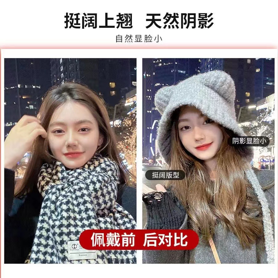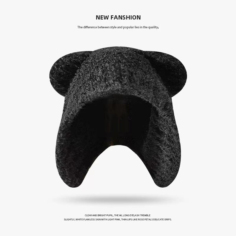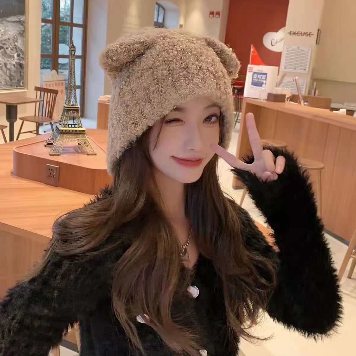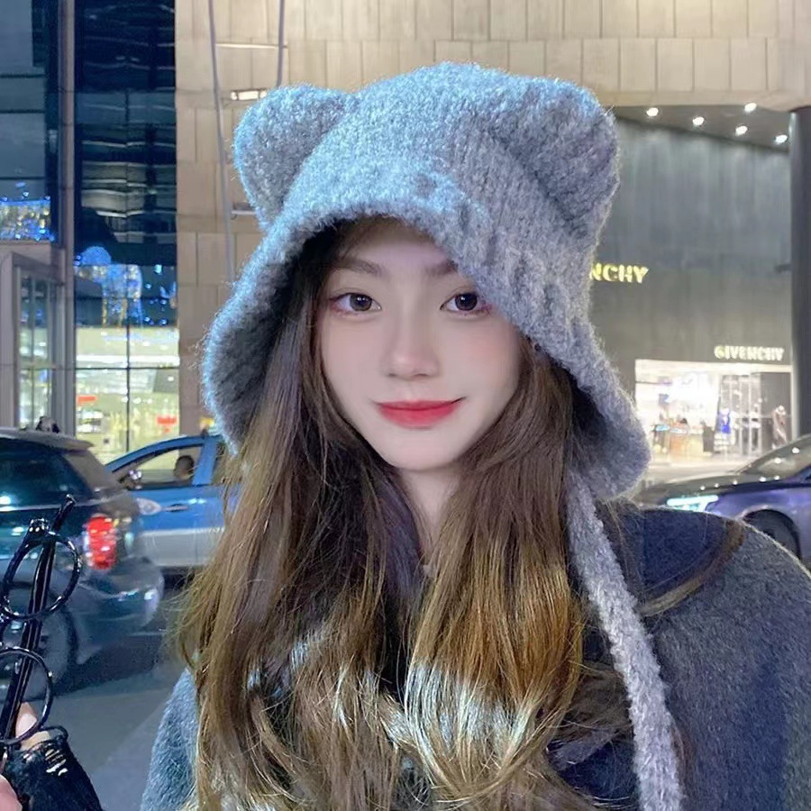 新款秋冬可爱小熊保暖帽女孩显脸小护耳毛线帽日韩系带帽子
