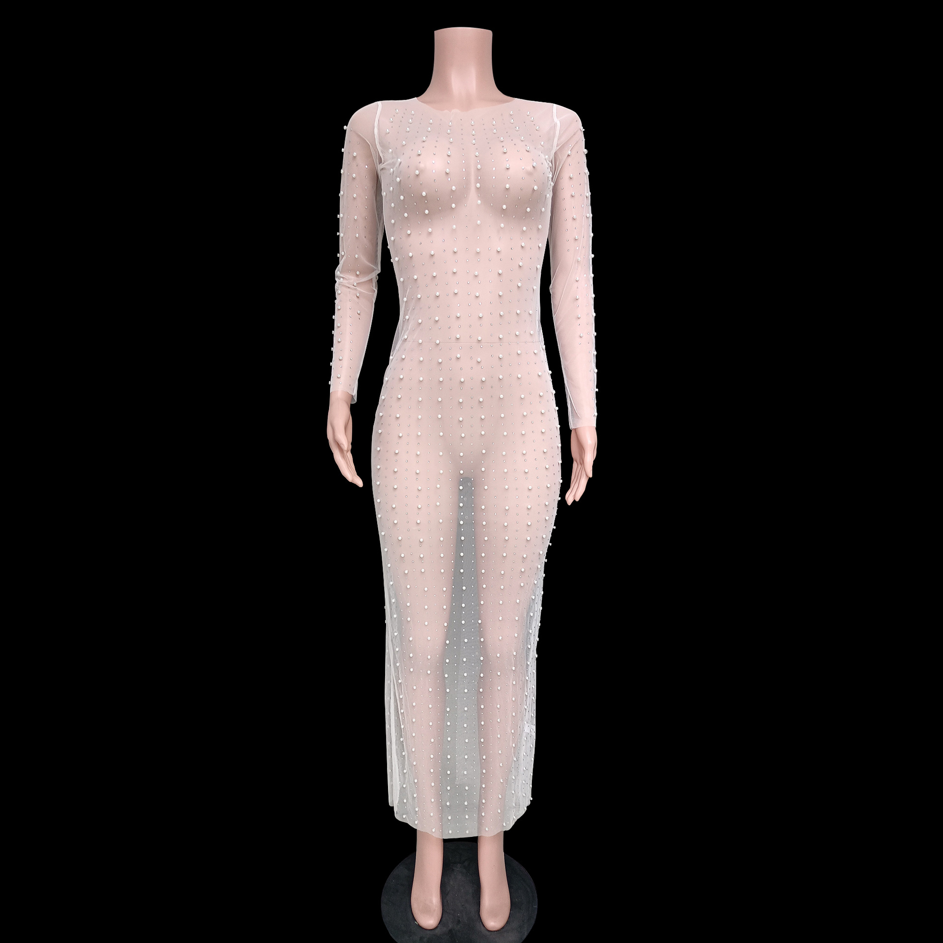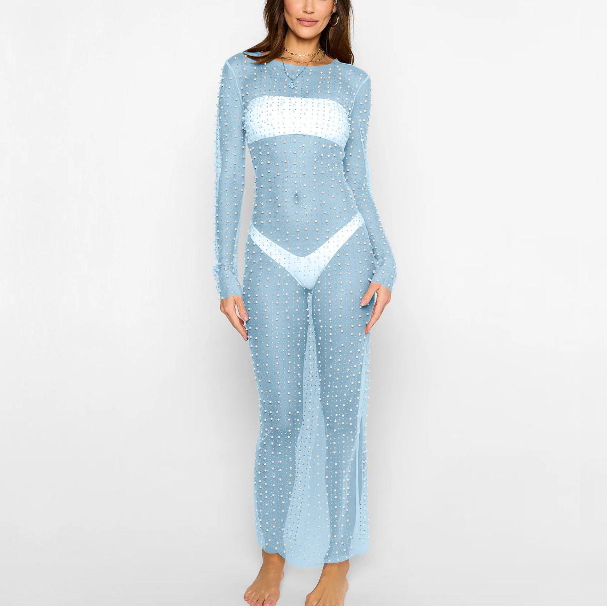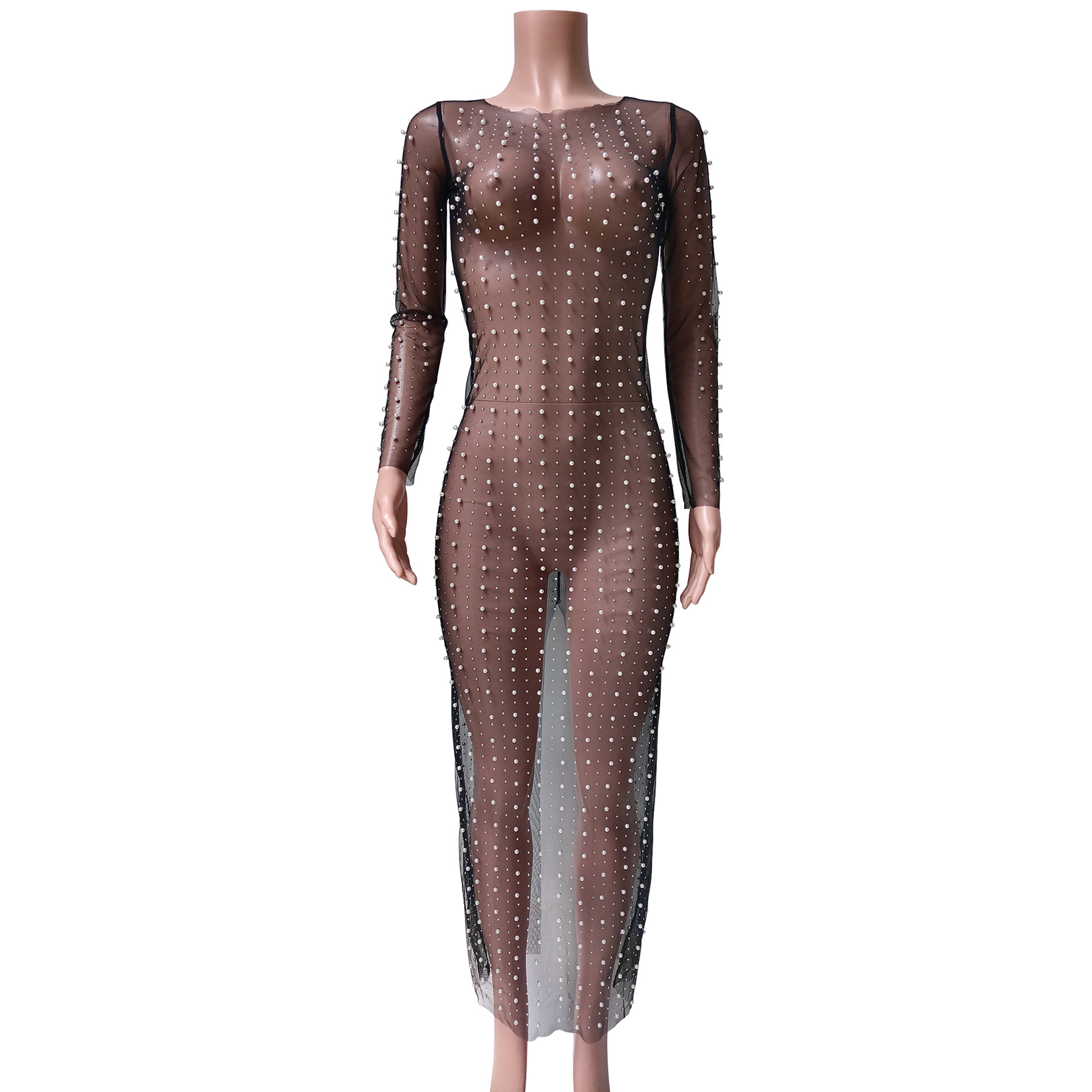 2022欧美外贸新款亚马逊热卖时尚性感钉珠烫钻罩衫网纱长袖连衣裙