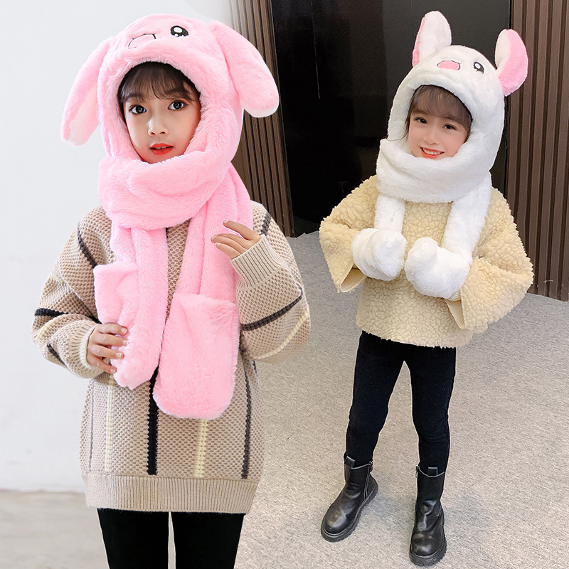耳朵会动帽子围巾手套一体女秋冬季2022可爱骑车外贸新款女童兔子