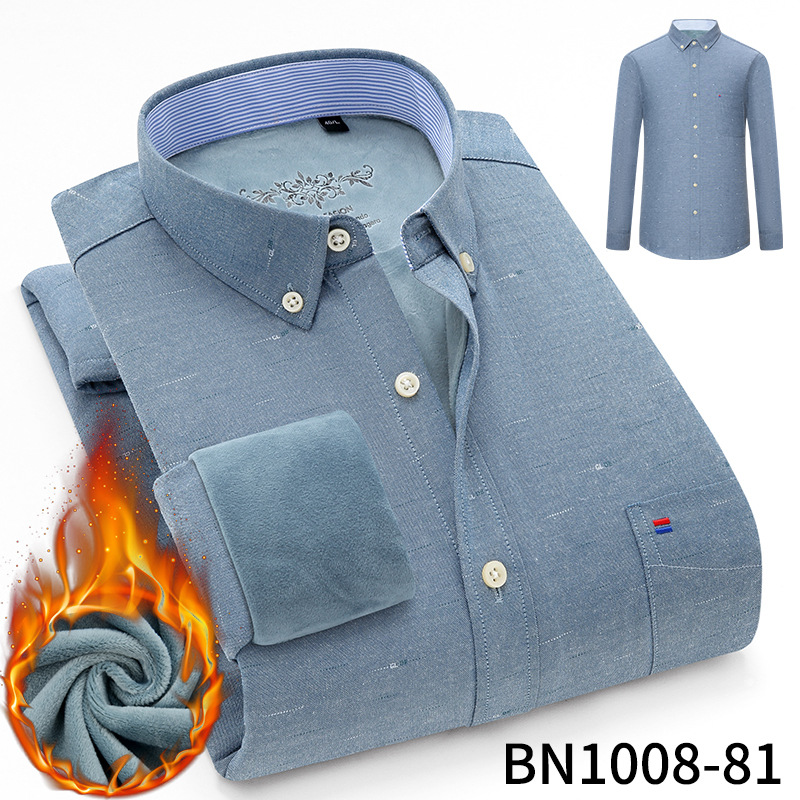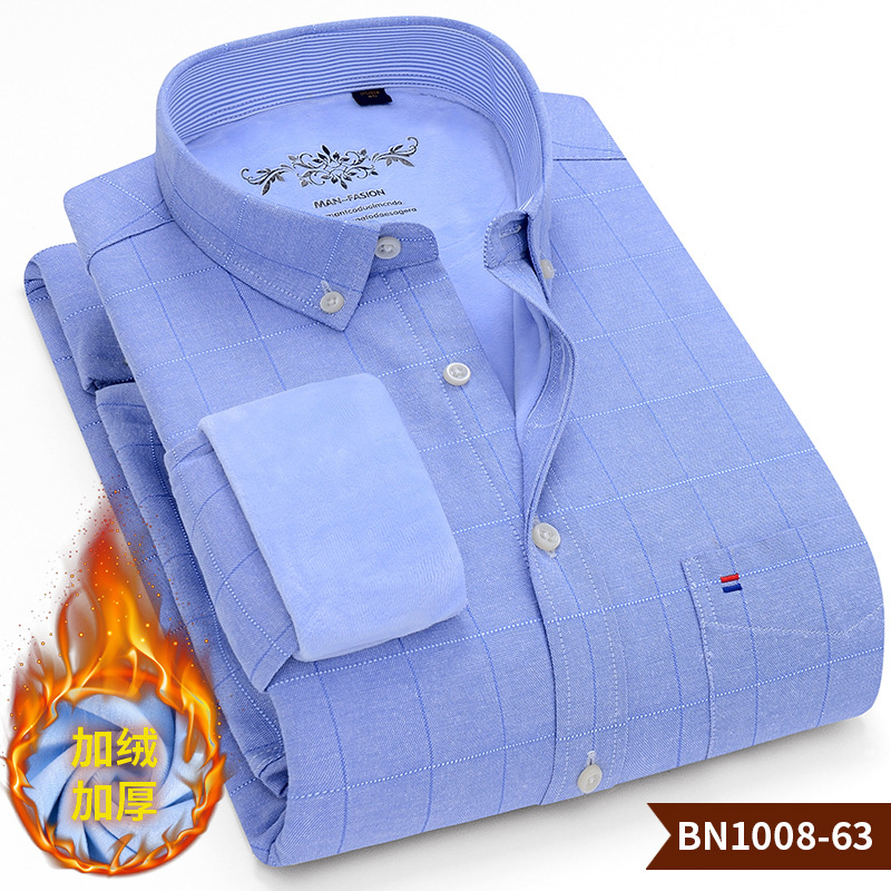冬季新款男士加绒加厚长袖牛津纺保暖衬衫男式休闲条纹衬衣
