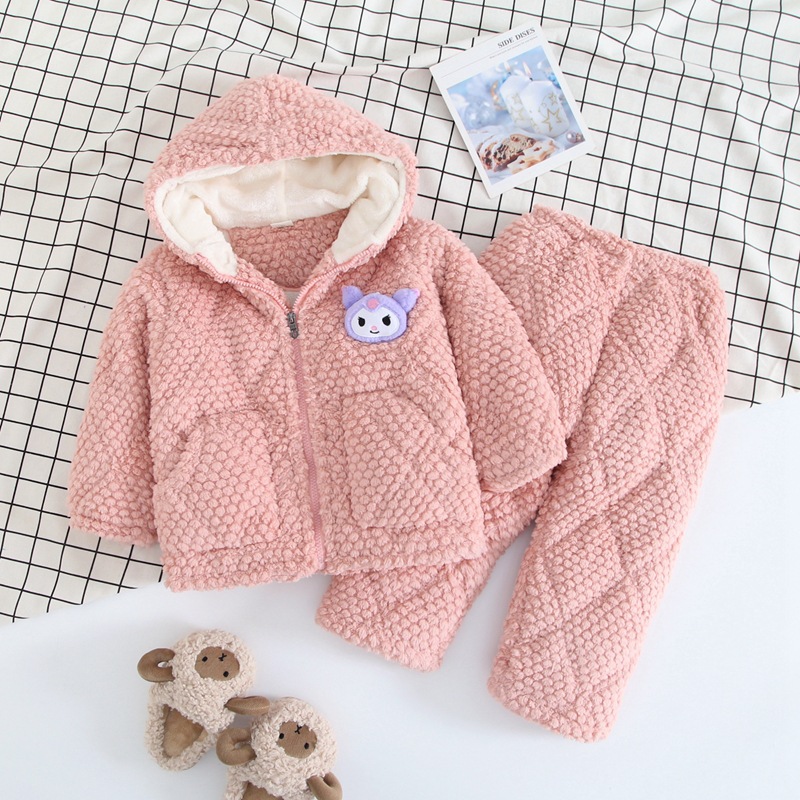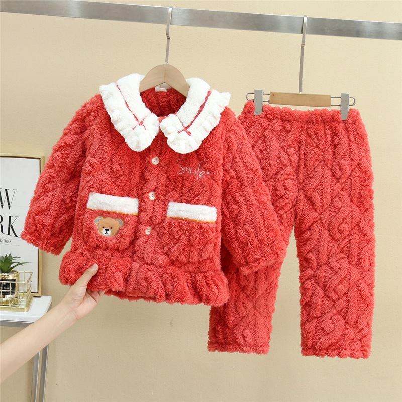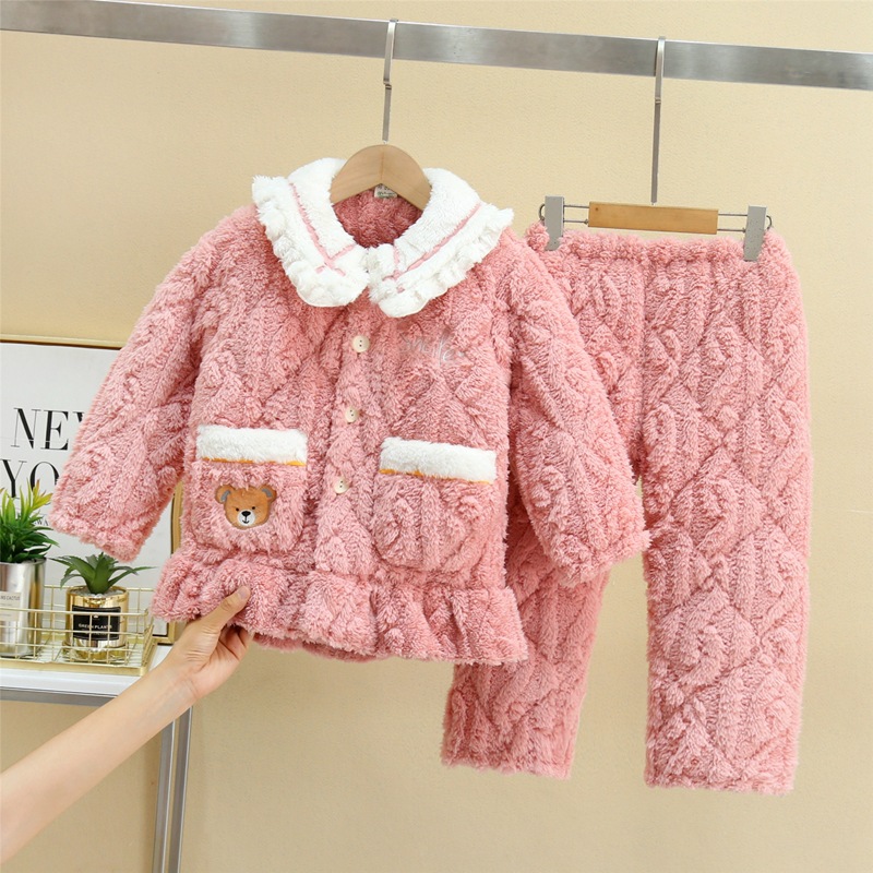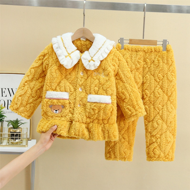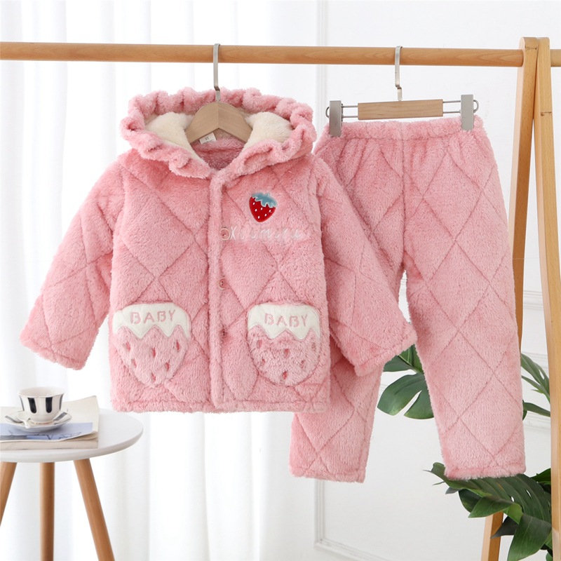 秋冬季儿童三层加厚夹棉睡衣可爱卡通套装男女童法兰绒翻领家居服