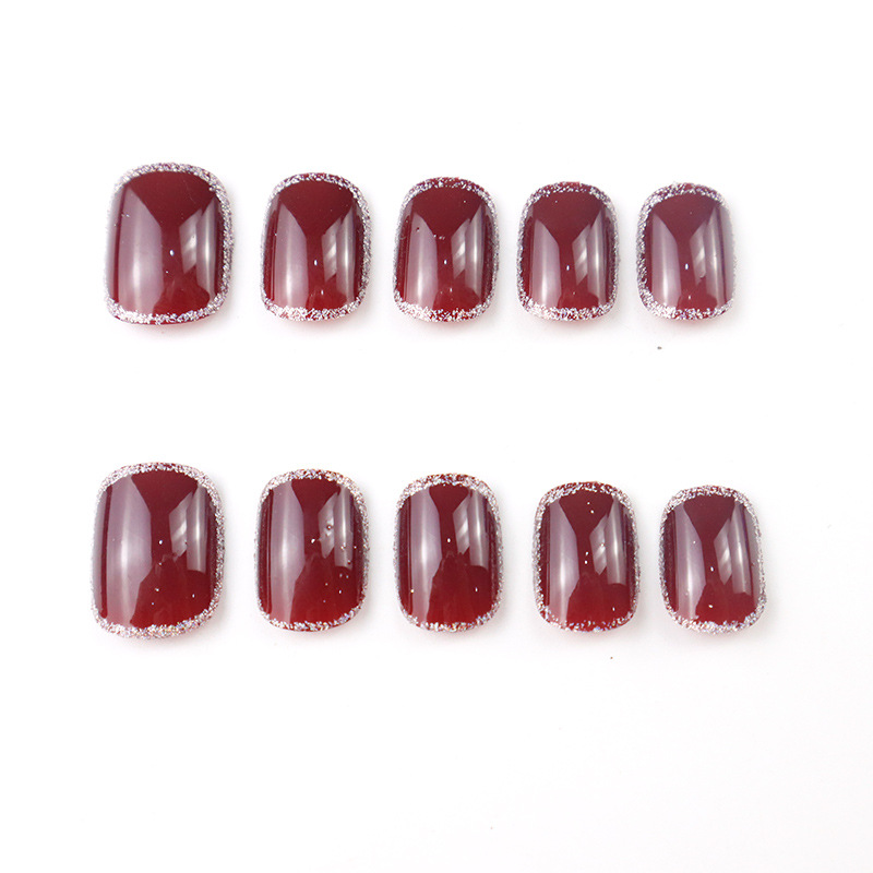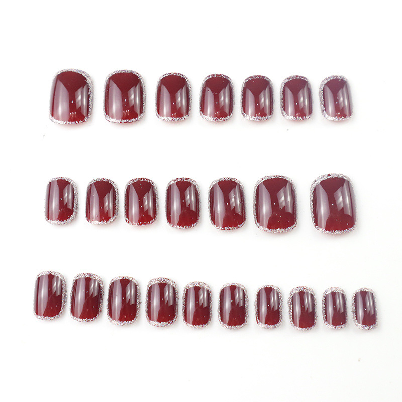 美甲片245-酒红银边 指甲贴片 美甲成品 酒红色假指甲贴片穿戴式