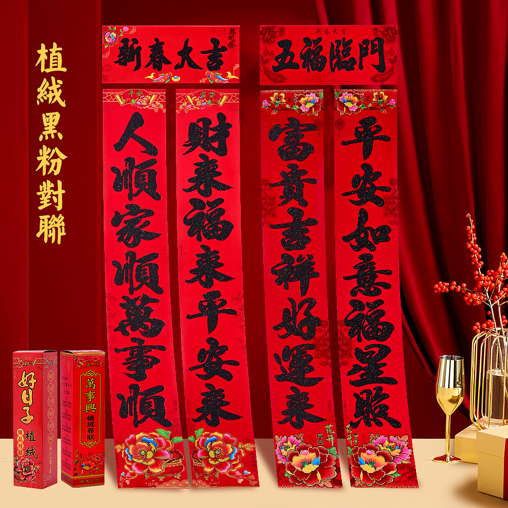 称心如意植绒对联和花开富贵植绒对联金粉黑粉词句都一样.