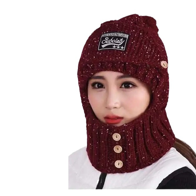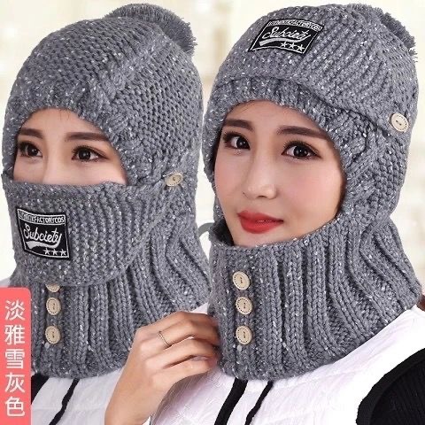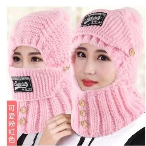 帽子女骑车护耳加绒毛线帽针织帽子围脖一体女冬加厚带口罩可拆卸