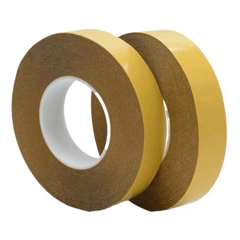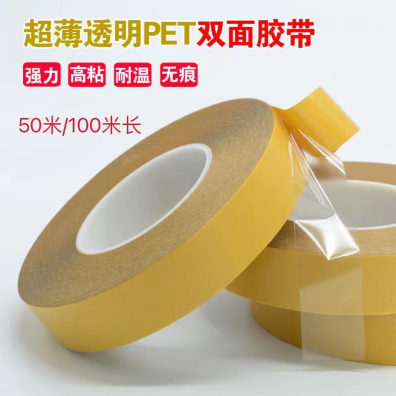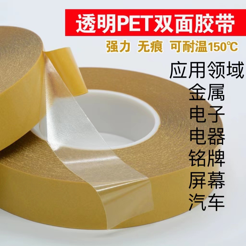 PET双面胶带,材质为PET基材+黄色格拉辛离层纸,颜色为透明。有良好的抗剪切力,良好的粘接强度,抗老化性能及耐紫外光性能好,低发雾性