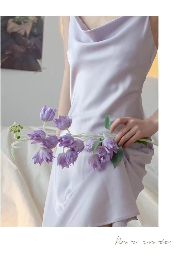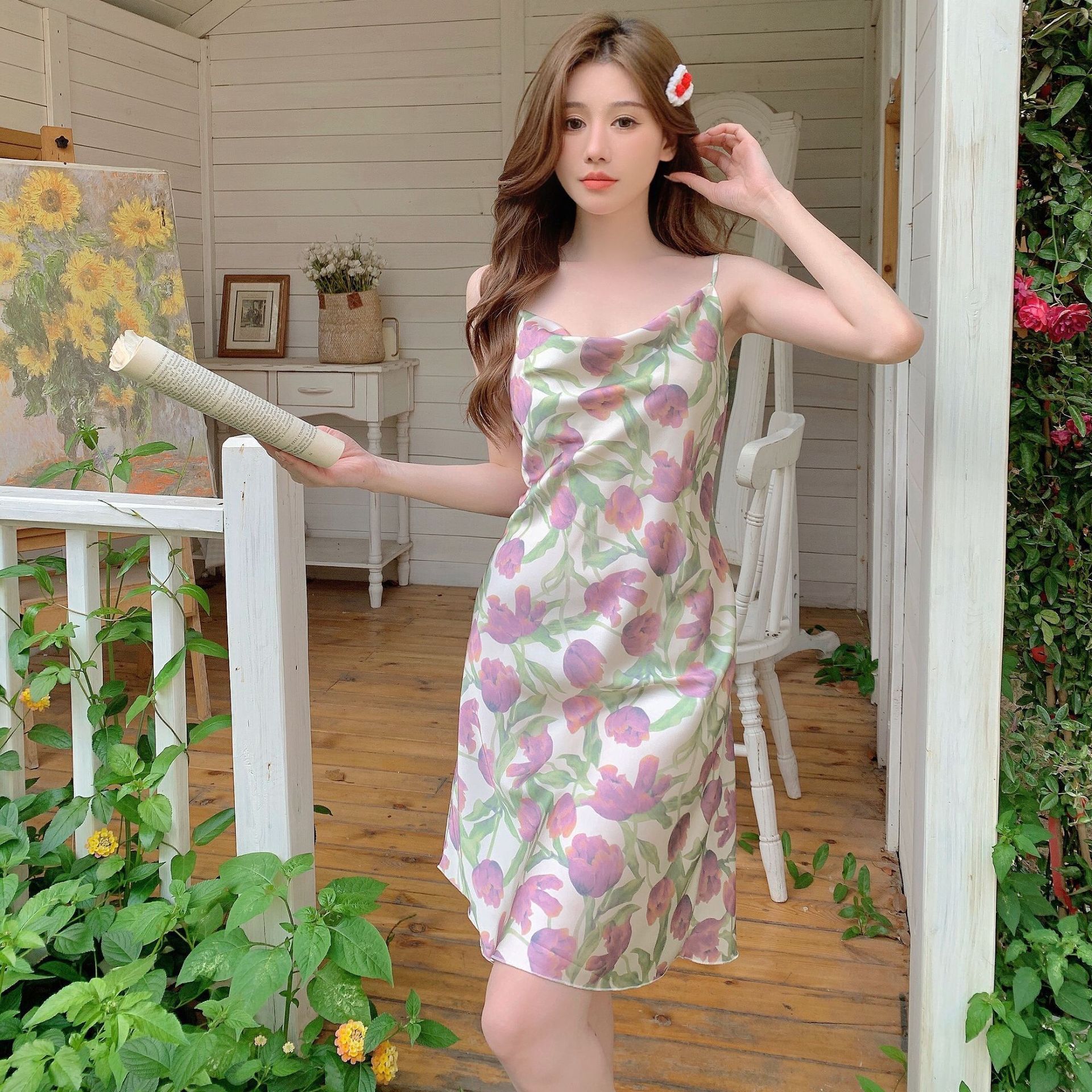 性感睡衣女冰丝荡领夏季薄款2023新款纯欲风印花吊带睡裙可跨境